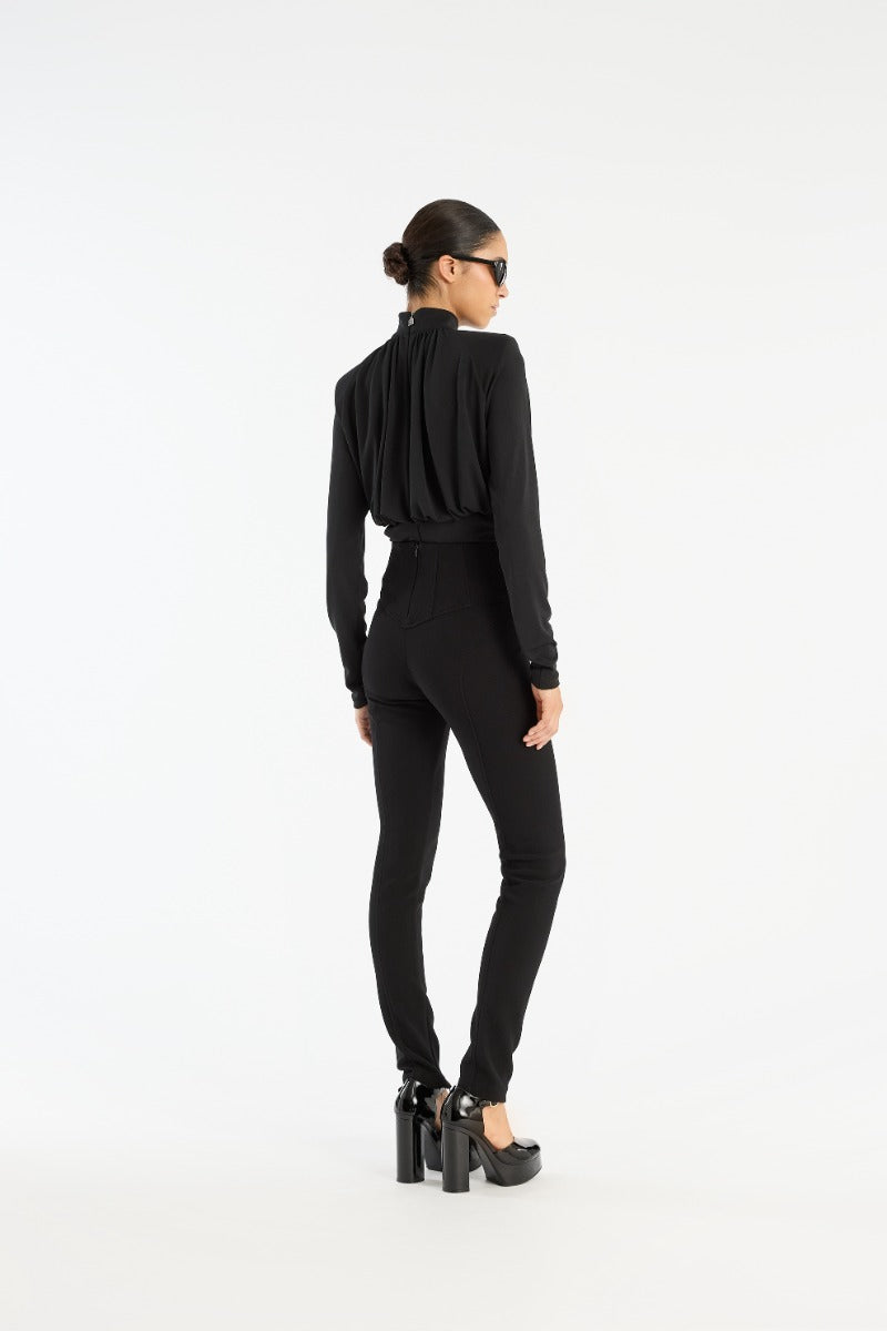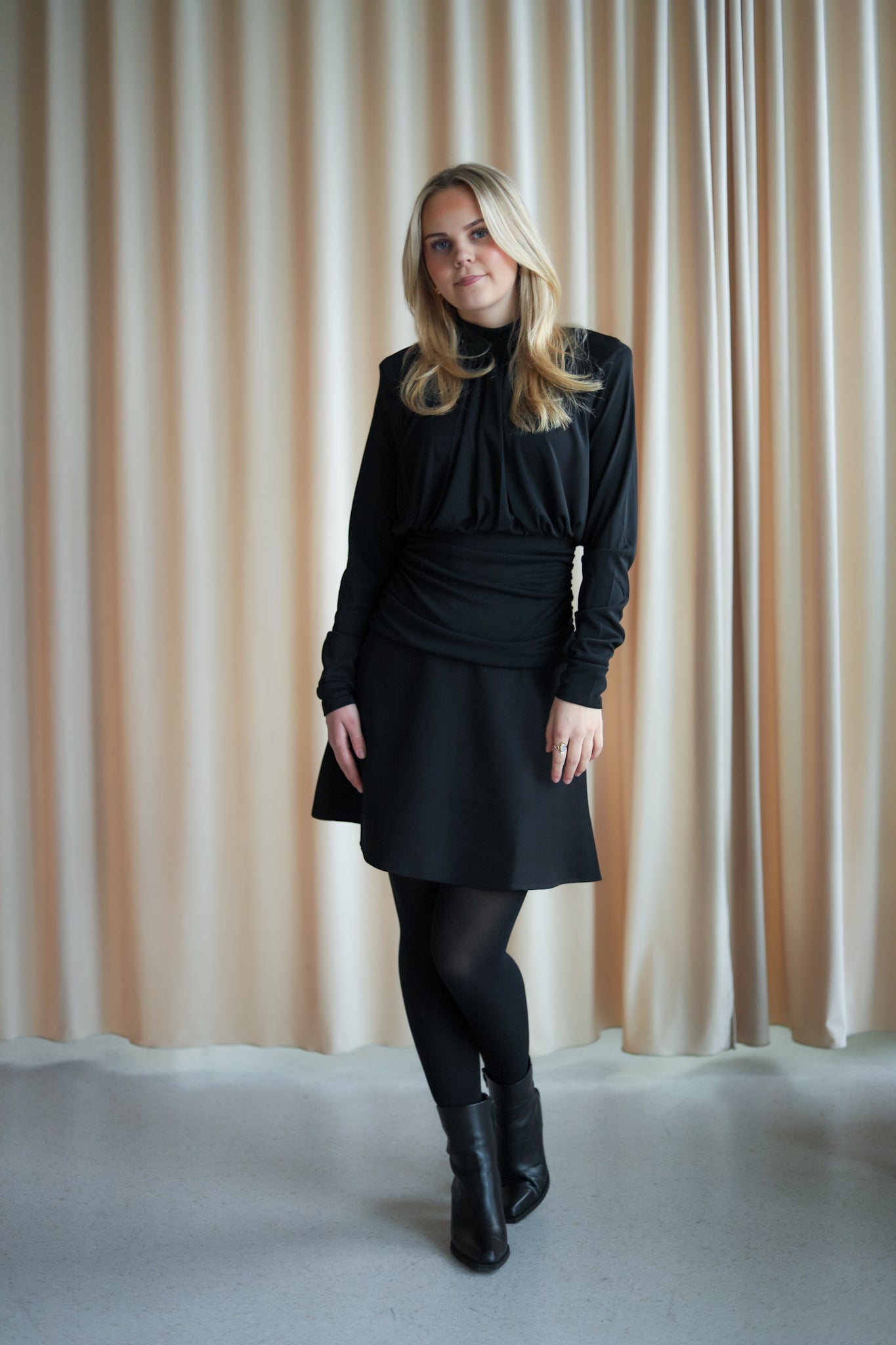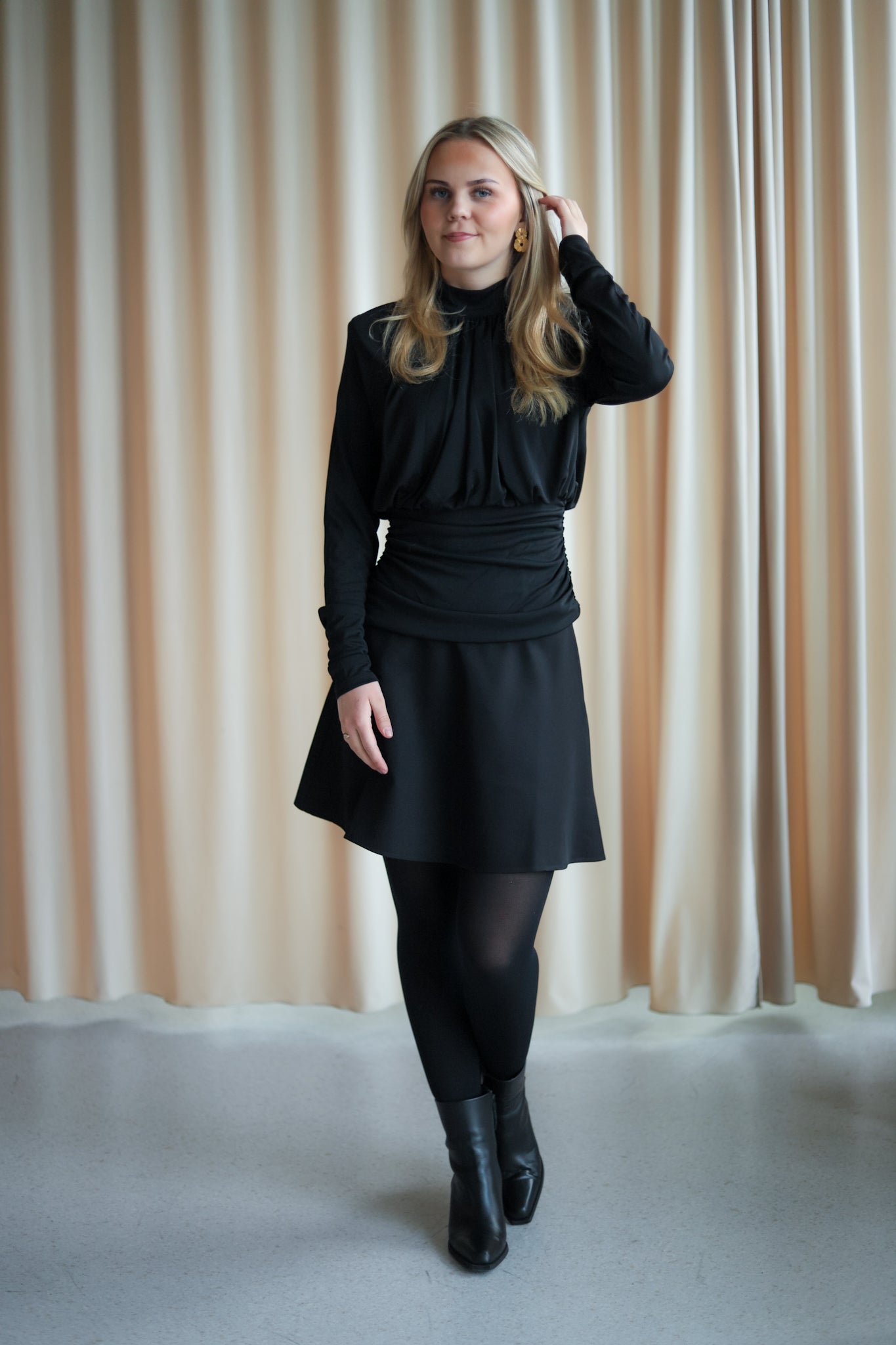 Stilig topp i klassisk sort fra Rotate. Modellen er tettsittene i midjen med volum i overdelen og høy hals. Toppen har lekre draperinger med lange raglanermer som smalner inn mot mansjett. Lukkes med glidelås i ryggen. Tøff til både, jeans, skjørt og dressbukser.
