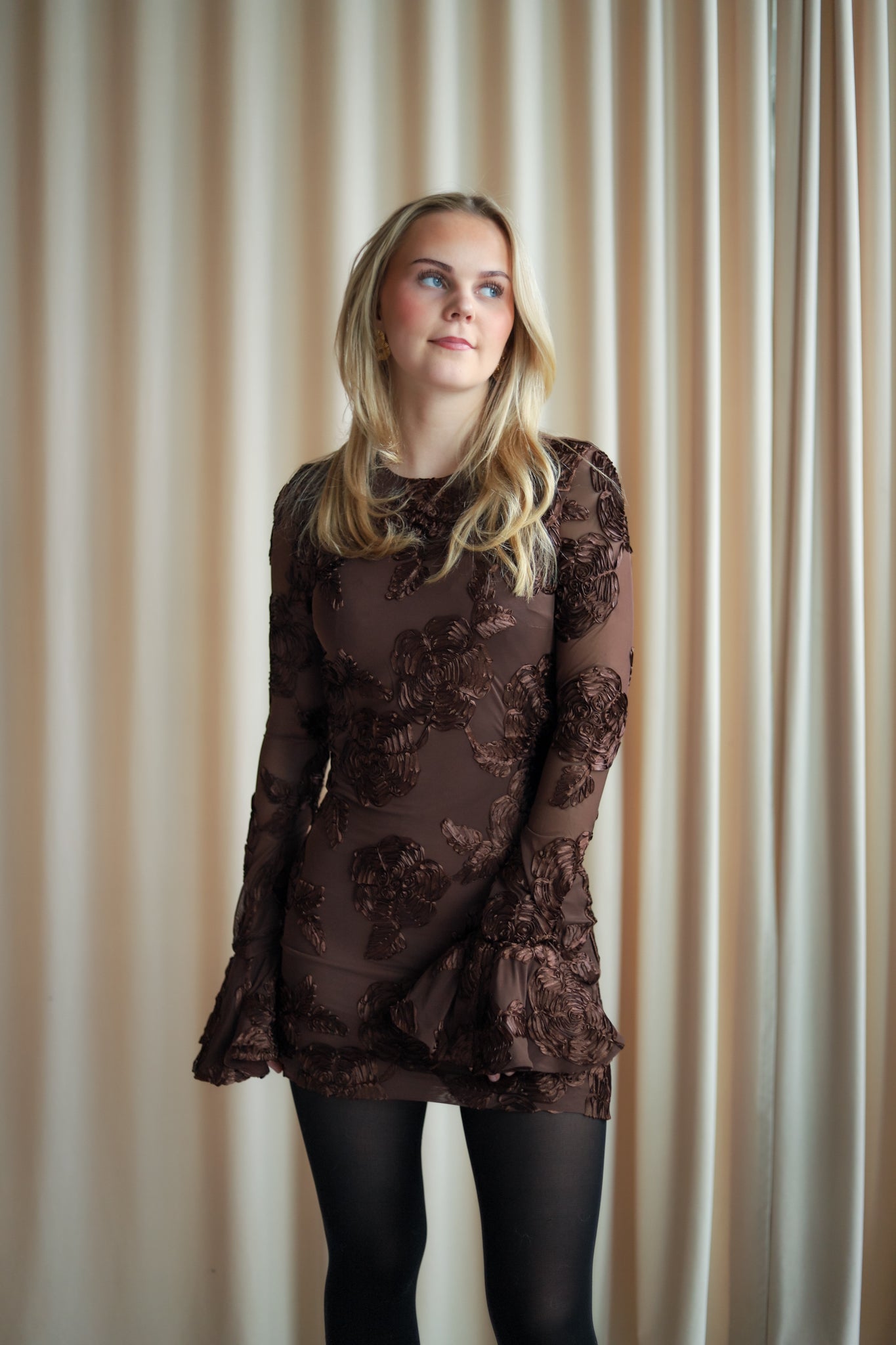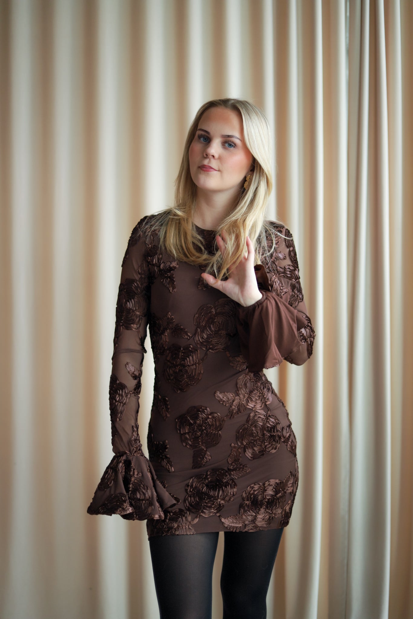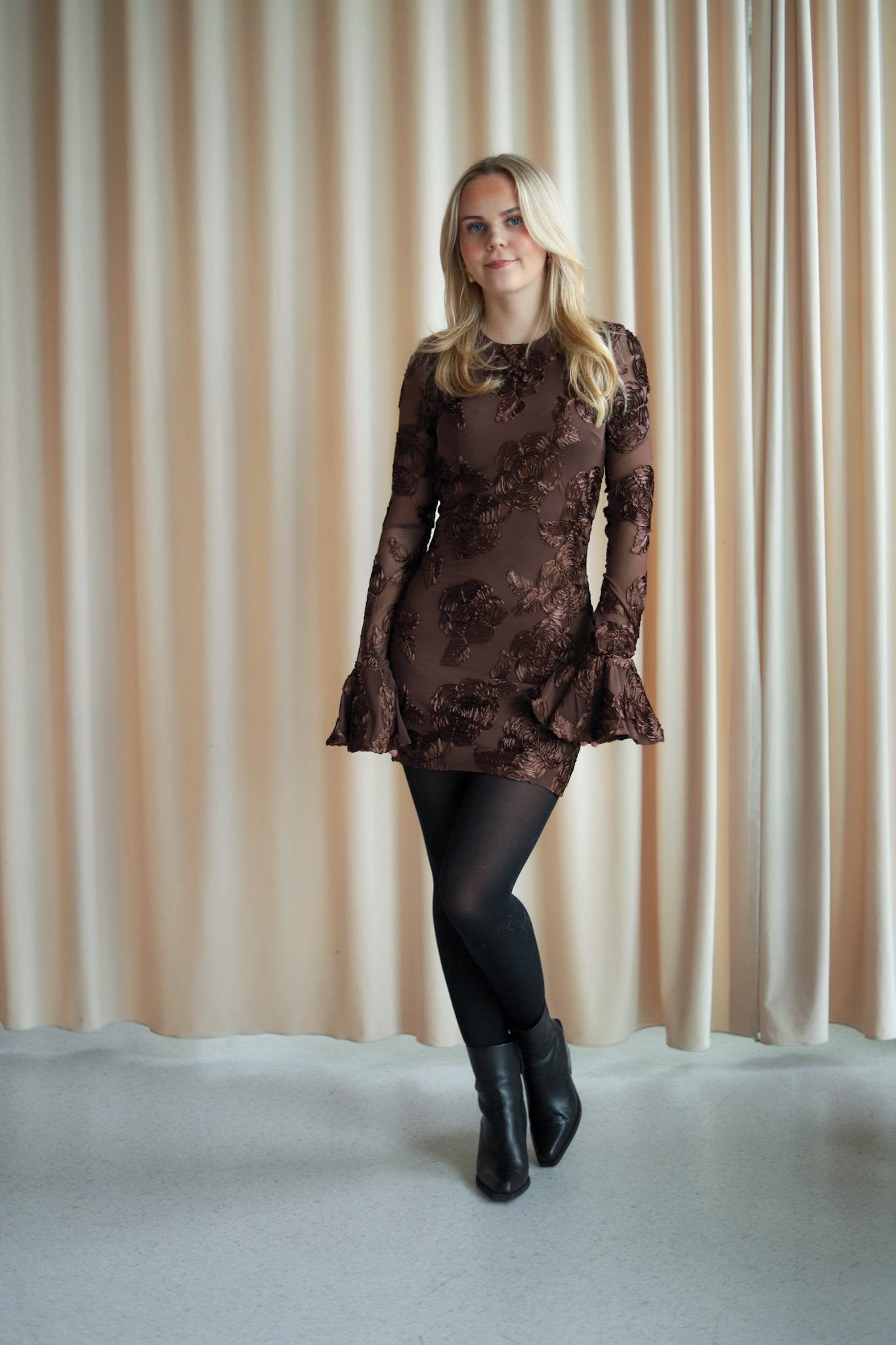 Vakker kjole i trendy brun og 3D blomsterprint ton-i-ton fra Rotate. Modellen er tettsittende med rund hals og lengde til midt på låret. Lange smale transparente ermer med voluminøs volang i mansjett. Lukking med skjult glidelås i siden og nøkkelhullsåpning i nakken. En skatt av en partykjole til sesongens festligheter.