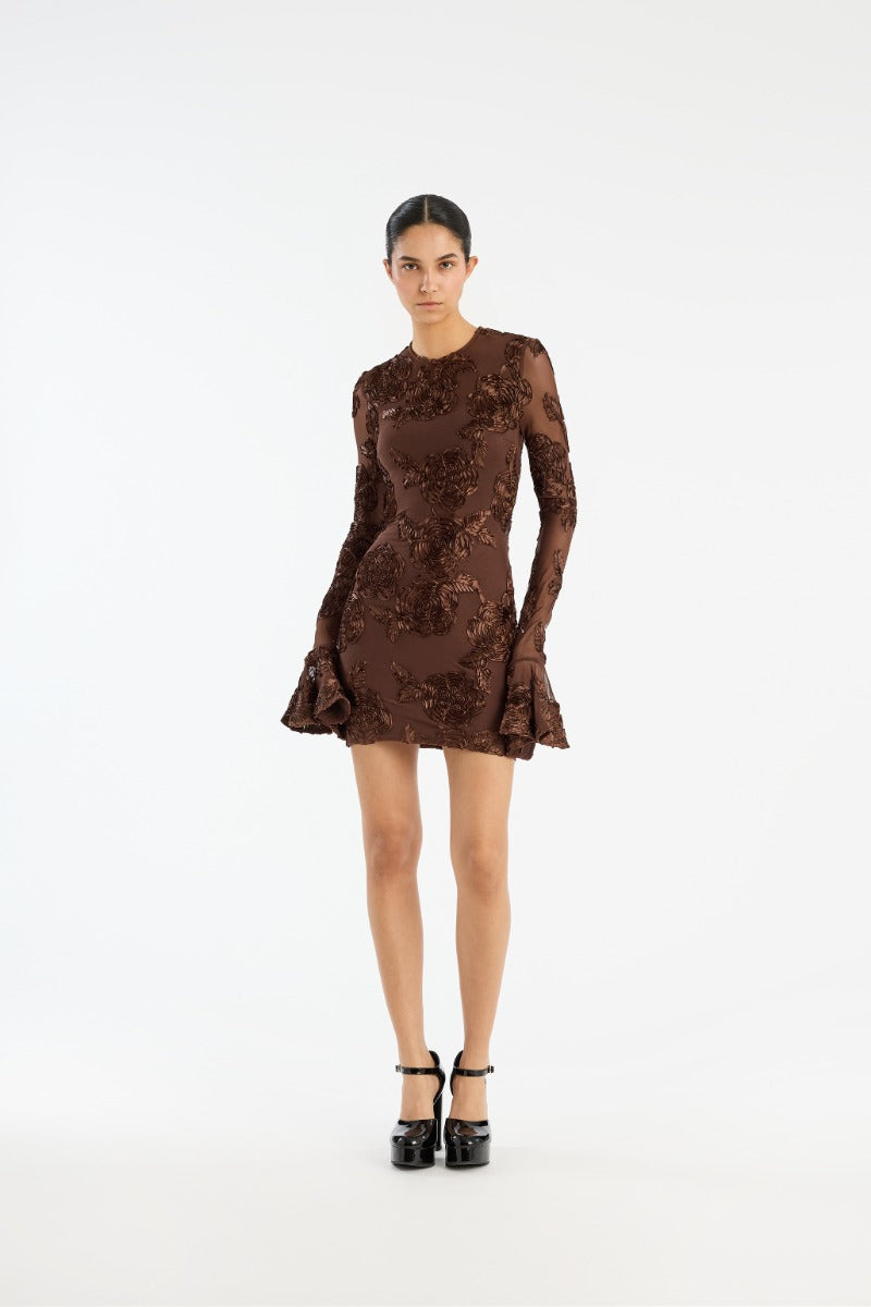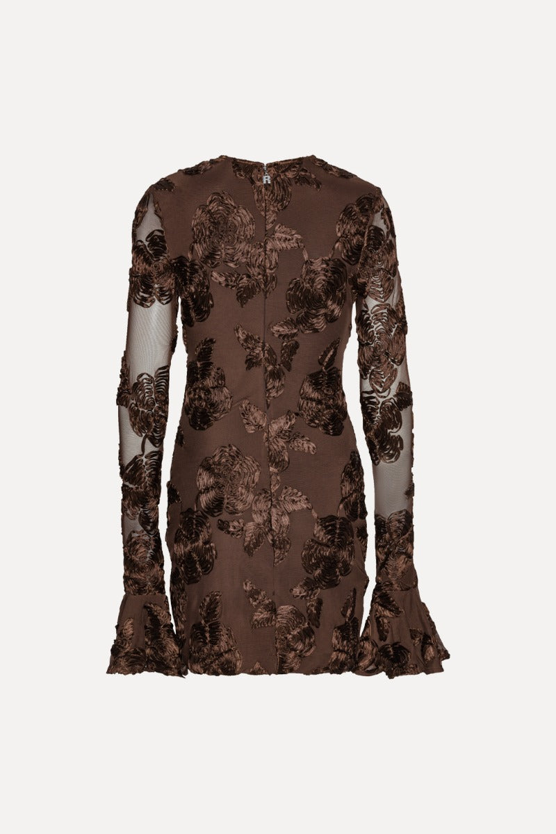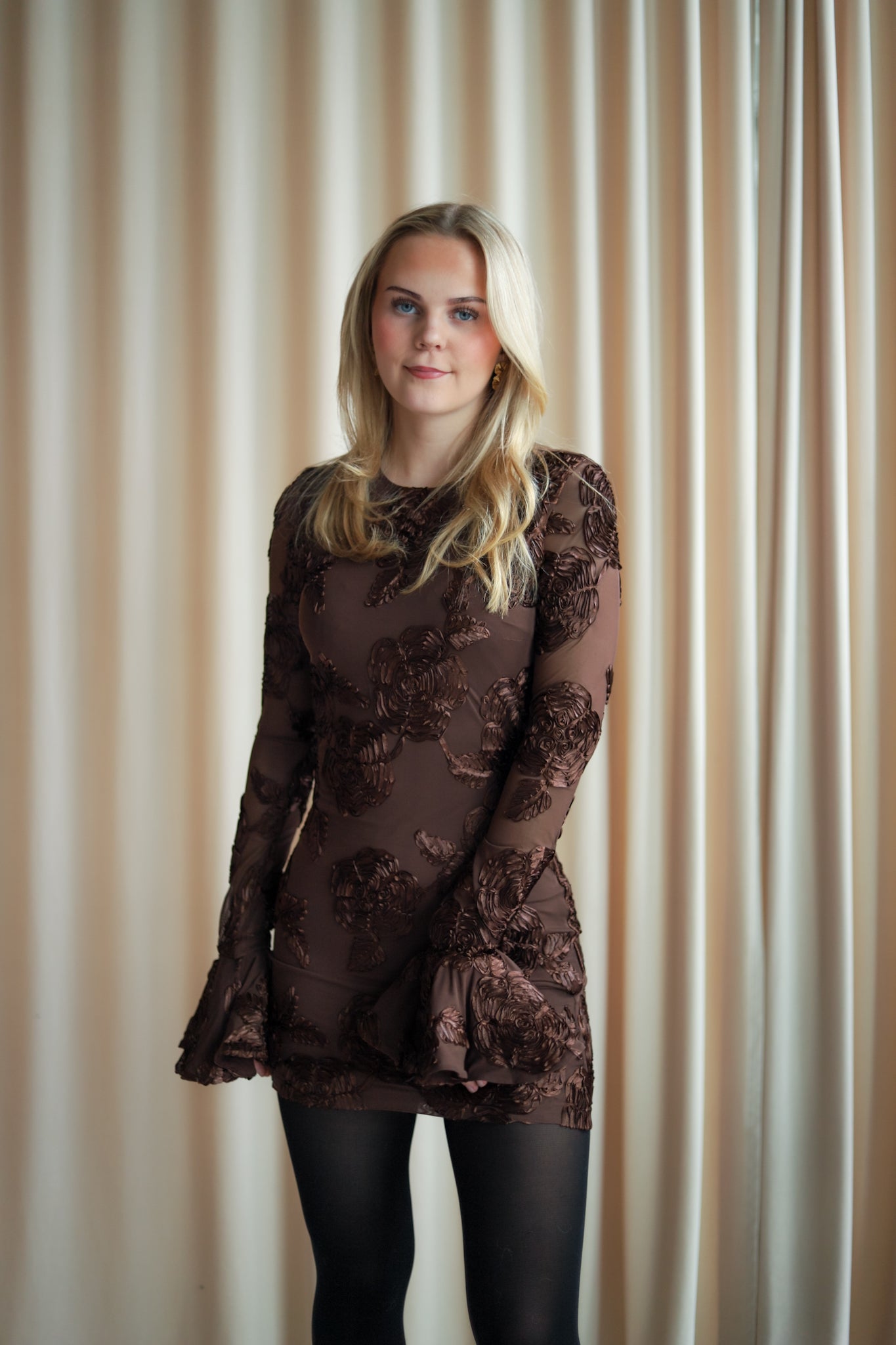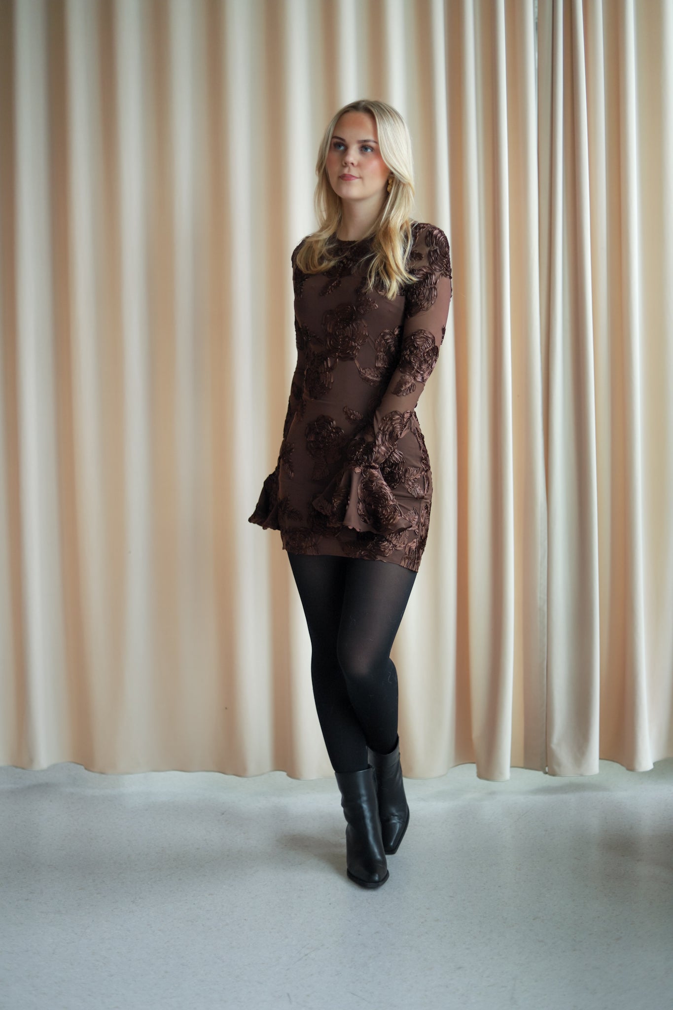 Vakker kjole i trendy brun og 3D blomsterprint ton-i-ton fra Rotate. Modellen er tettsittende med rund hals og lengde til midt på låret. Lange smale transparente ermer med voluminøs volang i mansjett. Lukking med skjult glidelås i siden og nøkkelhullsåpning i nakken. En skatt av en partykjole til sesongens festligheter.