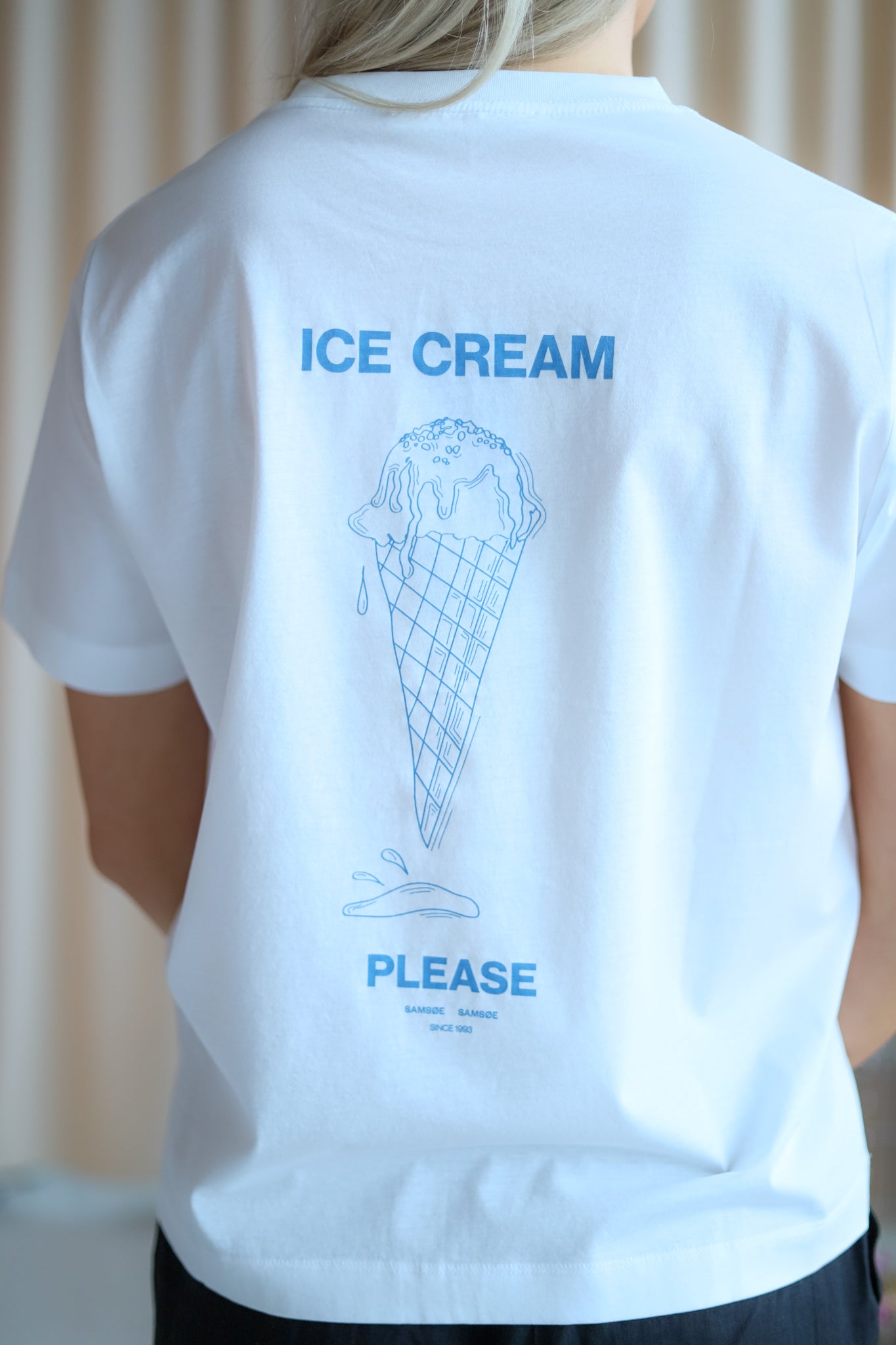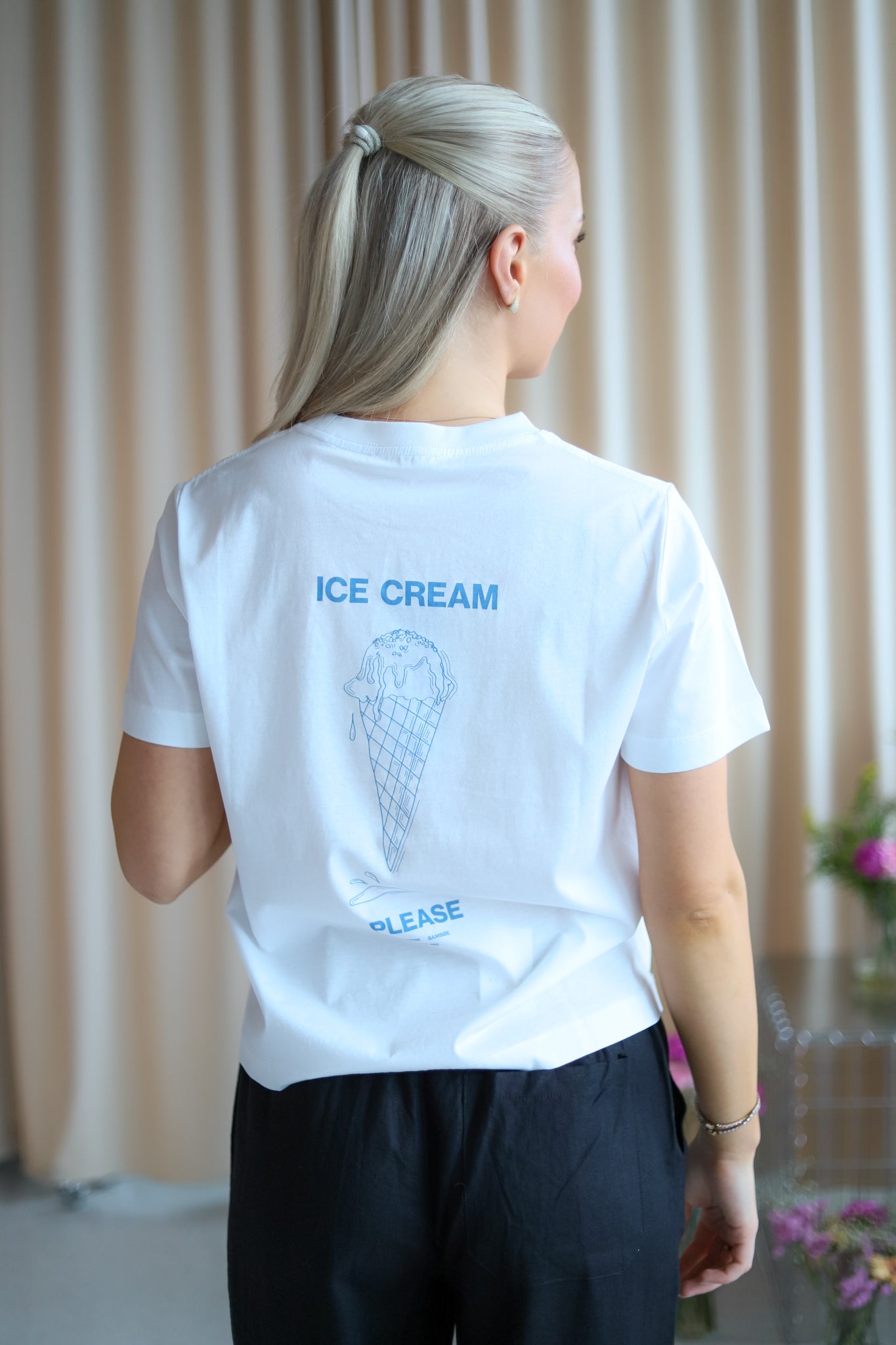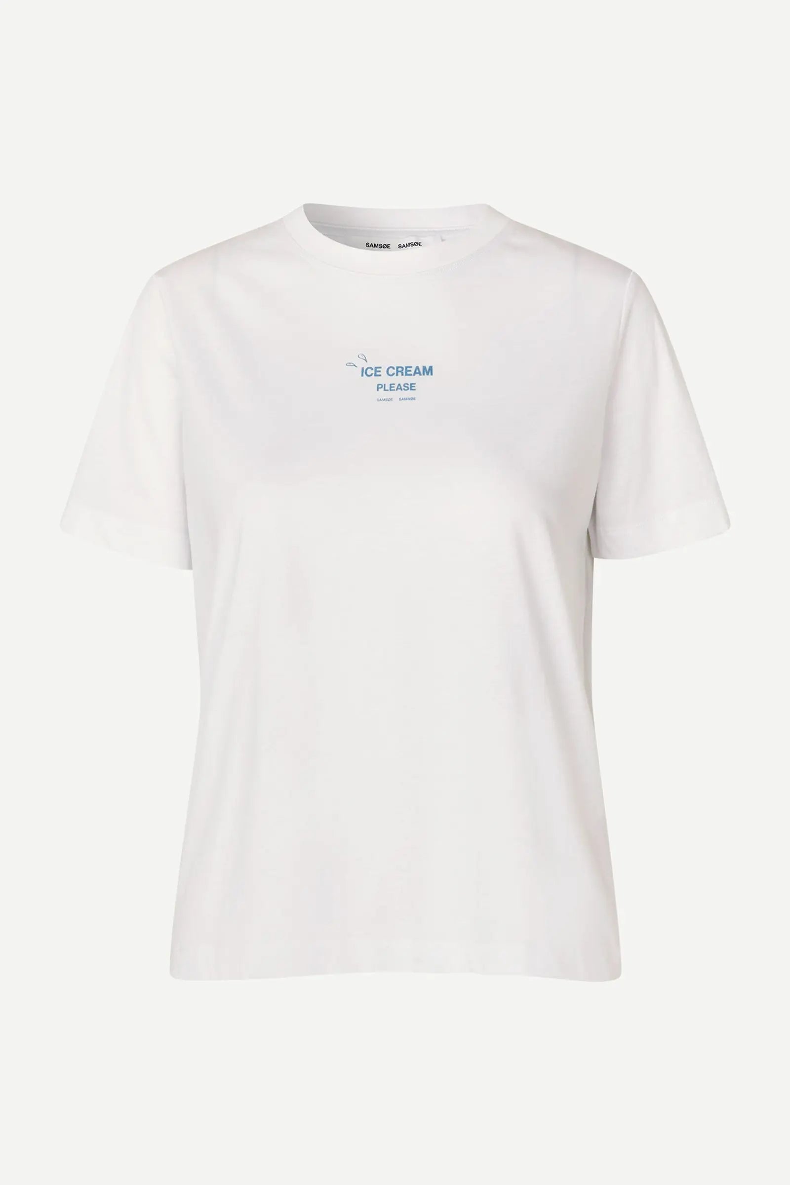Leken t-skjorte i klassisk hvit med tekst i blått og iskremprint på baksiden fra Samsøe. Modellen er rett med rund hals, korte ermer og pen hoftelengde. Stilig t-skjorte til sommerseongen.