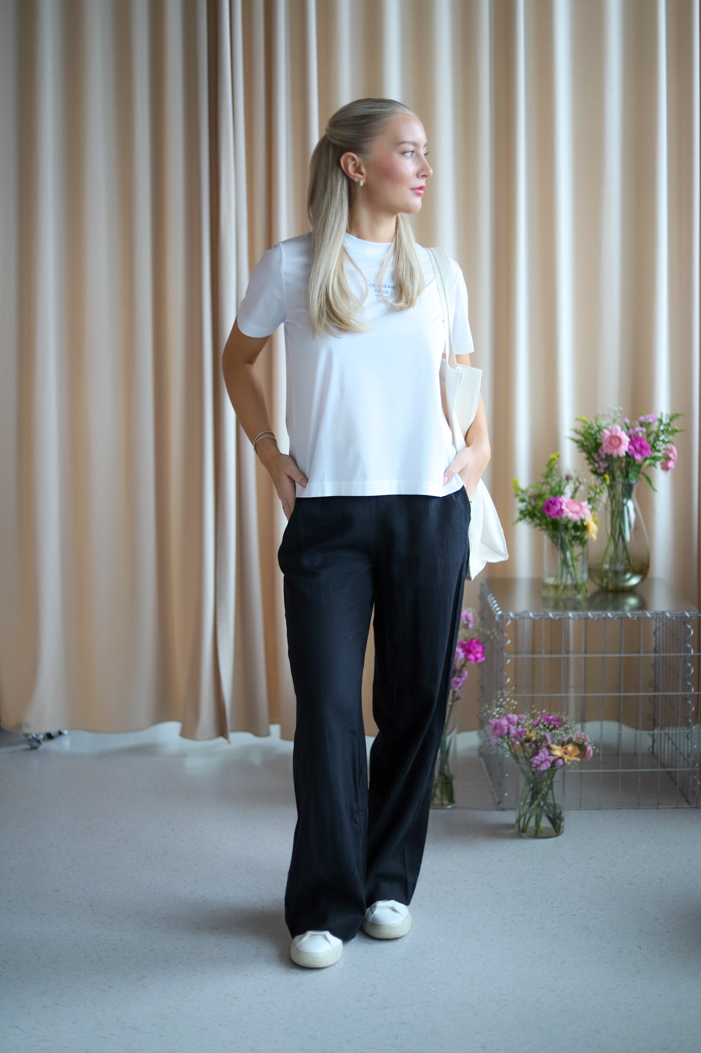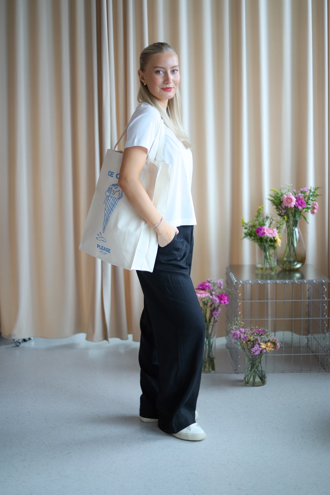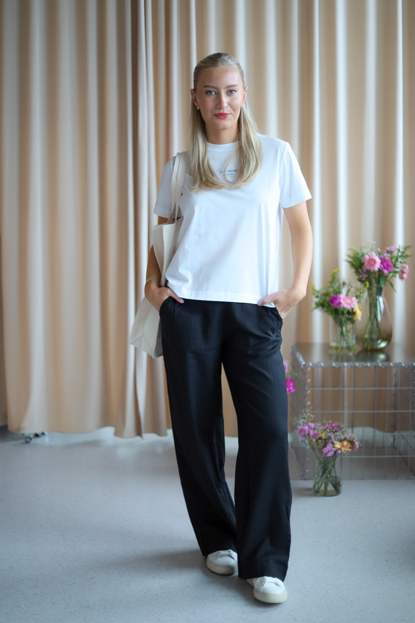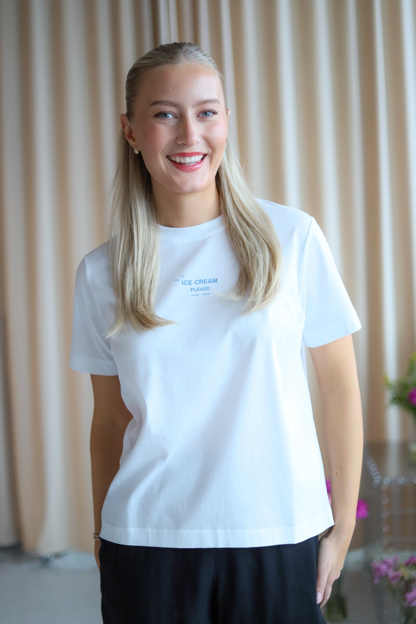 Leken t-skjorte i klassisk hvit med tekst i blått og iskremprint på baksiden fra Samsøe. Modellen er rett med rund hals, korte ermer og pen hoftelengde. Stilig t-skjorte til sommerseongen.
