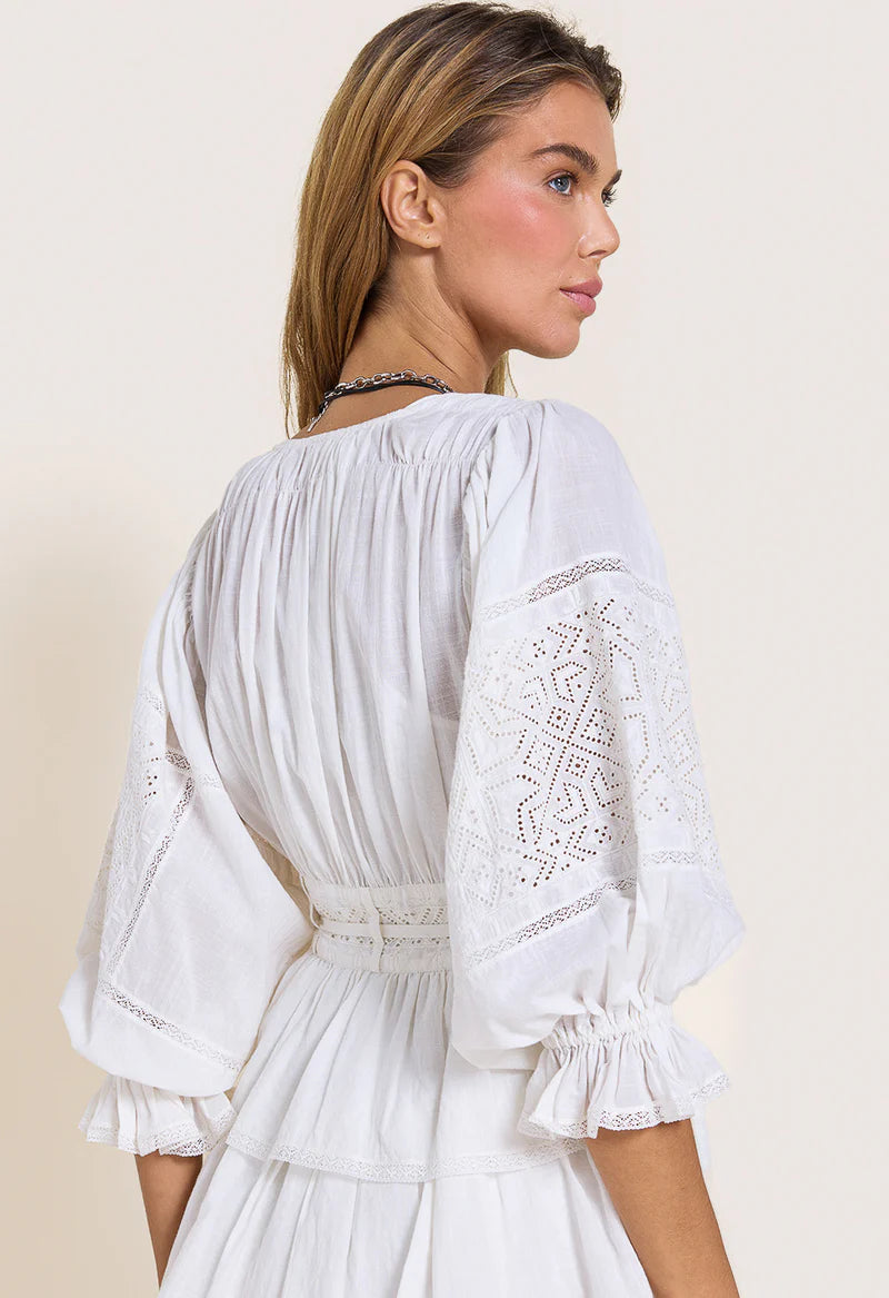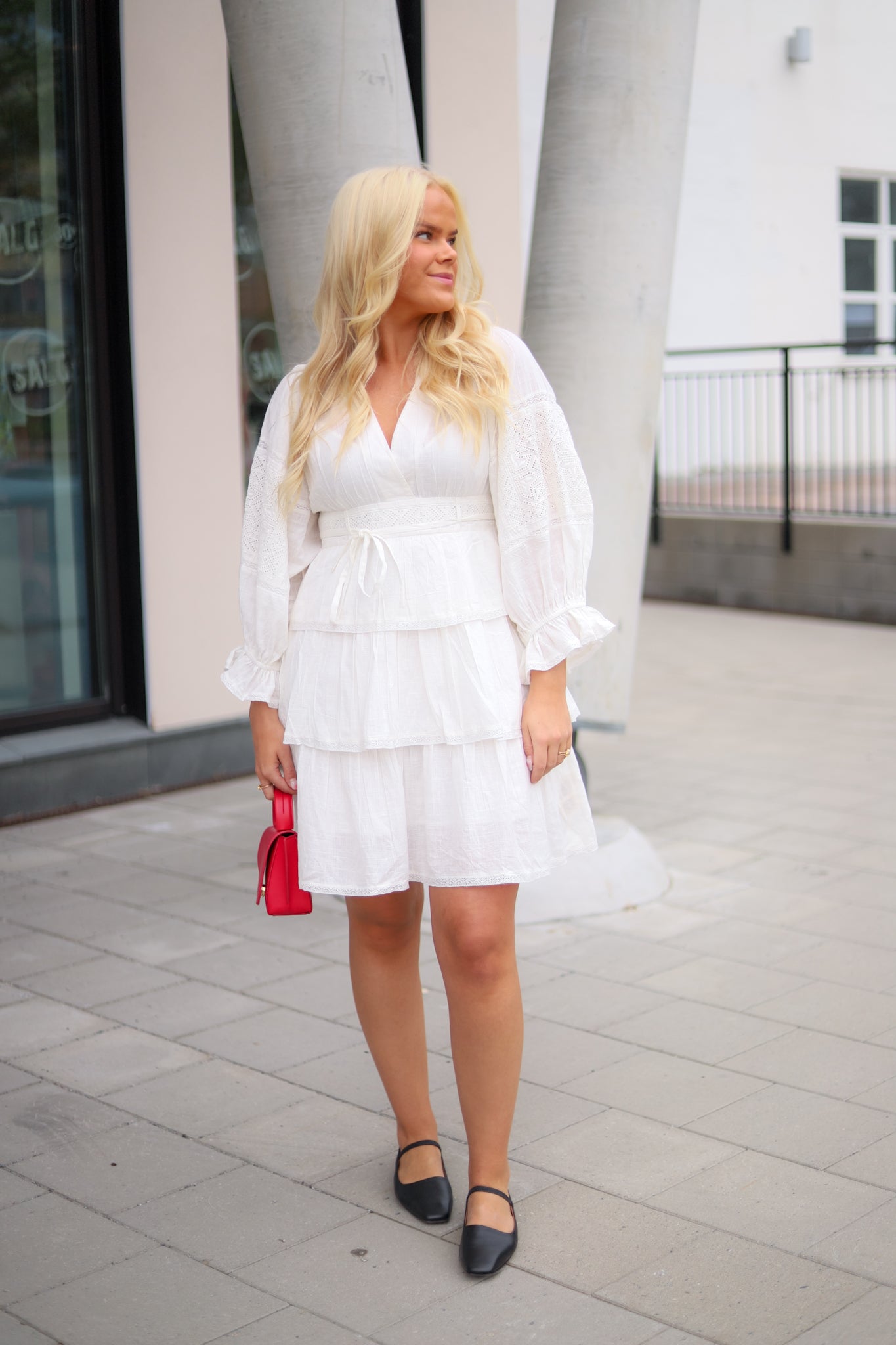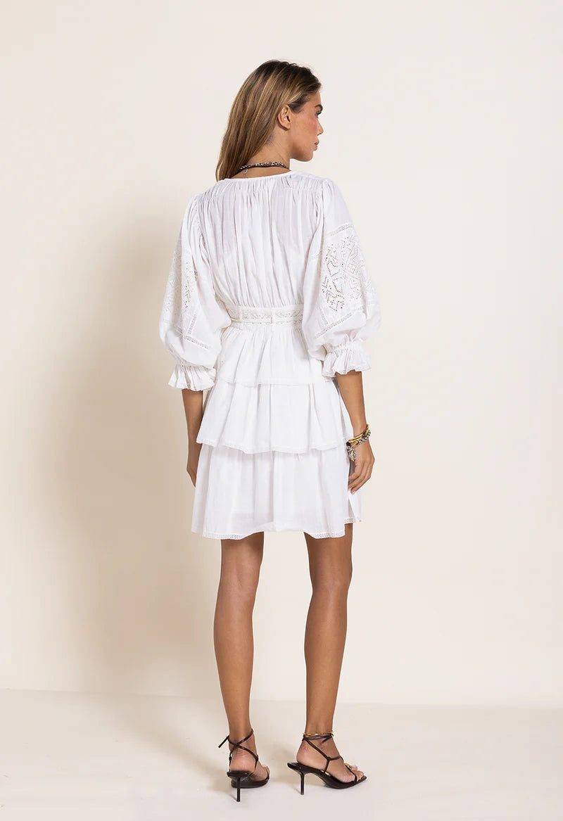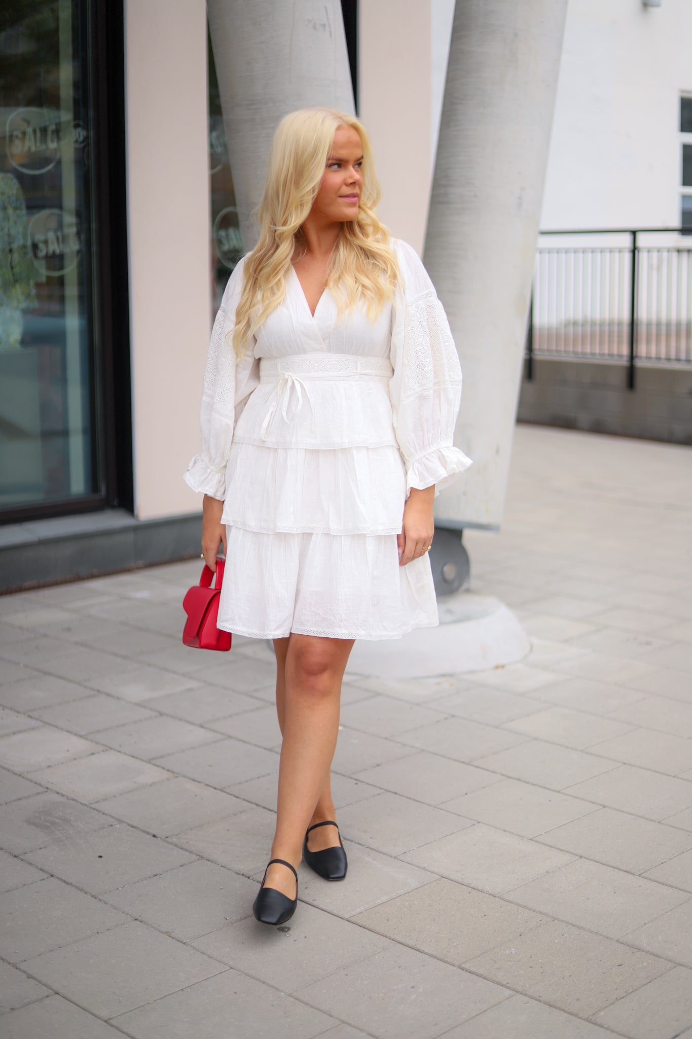 Nydelig kjole i klassisk hvit fra Scarlett Poppies. Modellen er innsvinget i midjen og har delikat knelengde. Skjørtet skrår ut med lekre kapper. V-hals og voluminøse 3/4 ermer med smock og volang i mansjett. Delikate broderier på ermene og i midjen. Kjolen er perfekt for enhver anledning og blander sømløst eleganse og stil, noe som gjør den til et must i garderoben din.