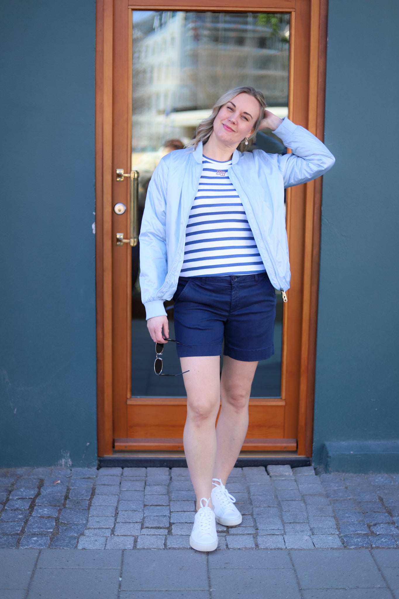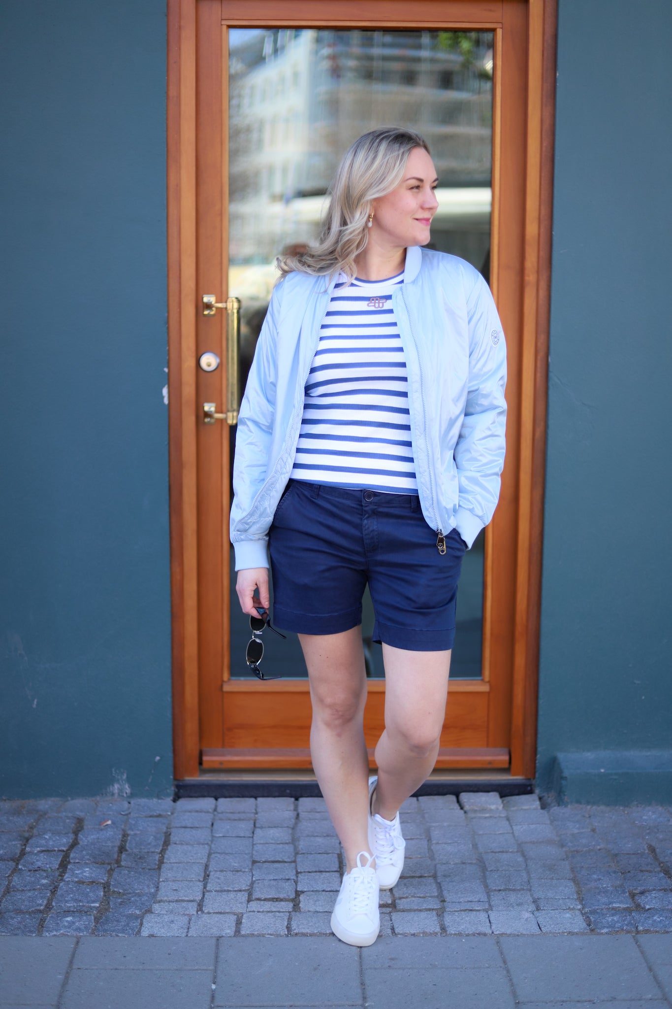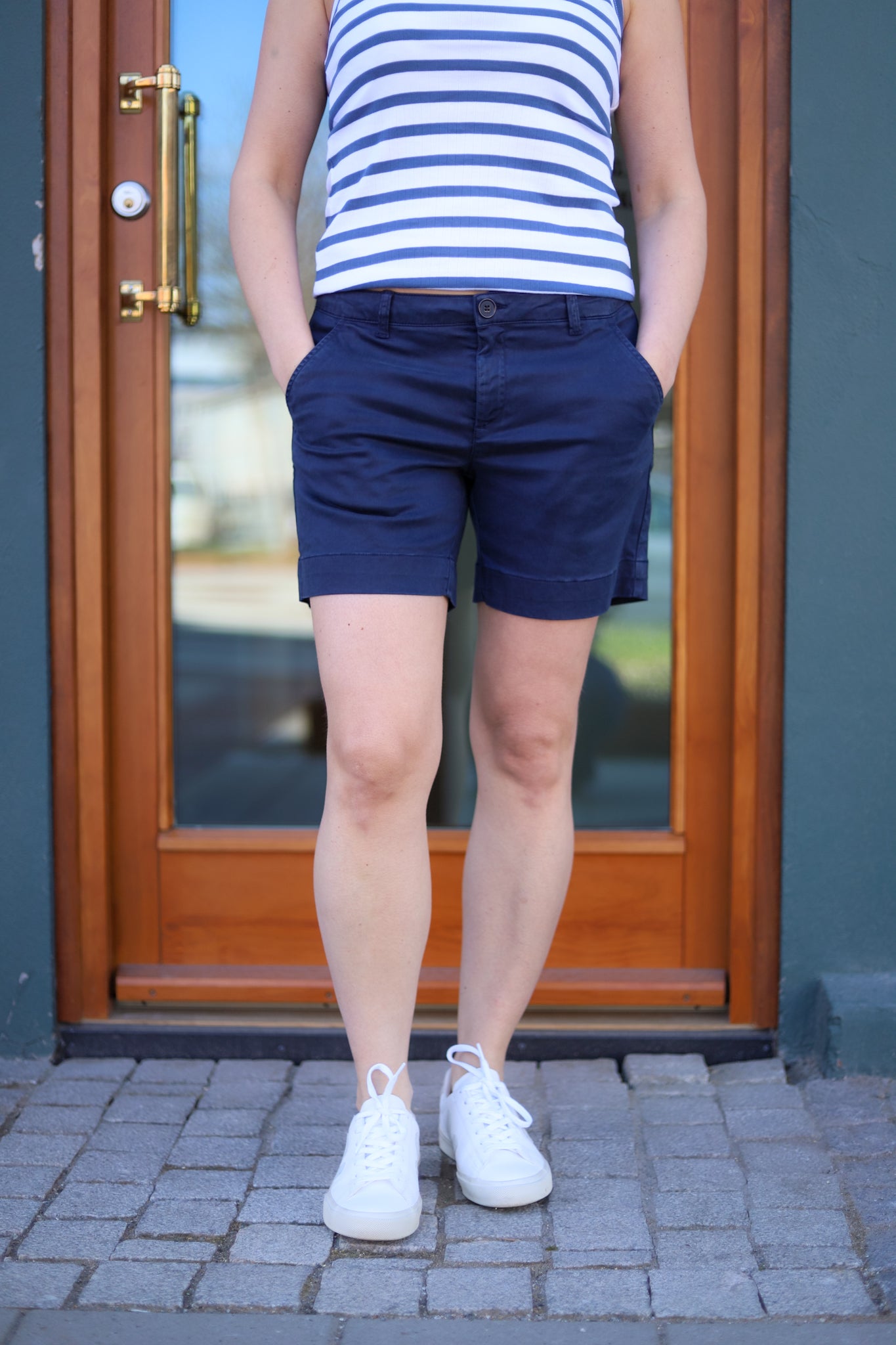 Sporty shorts i mørk blå fra Model. Modellen har beltehemper, skjult gylf og lukkes med gullknapp. Stikklommer i siden og bak. Tidløs shorts med medium livhøyde og korte ben. Myk og streychy kvalitet.