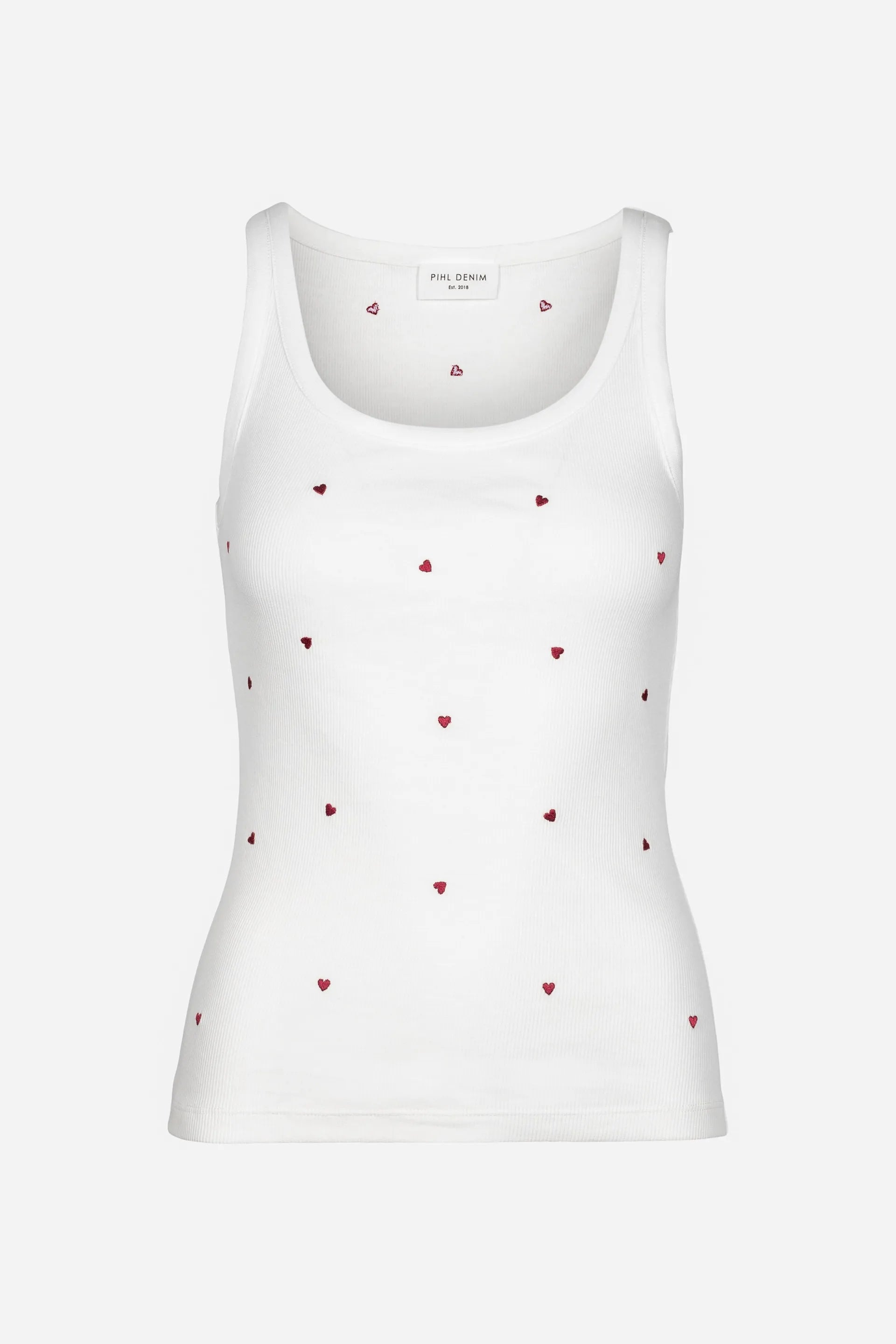 Søt ribbet singlett i hvit med broderte små hjerter i mørk rød. Modellen er tettsittende med dyp rund hals og tank stropper. En klassiker med søte detaljer til sesongens garderobe.
