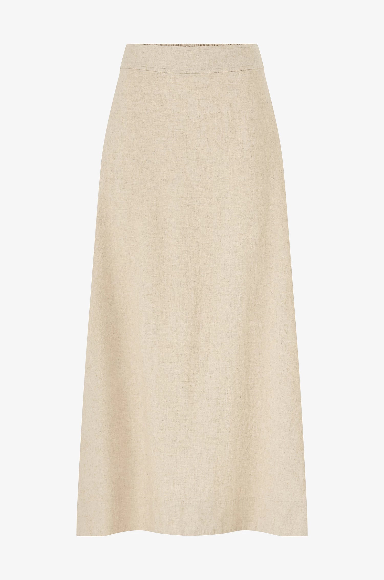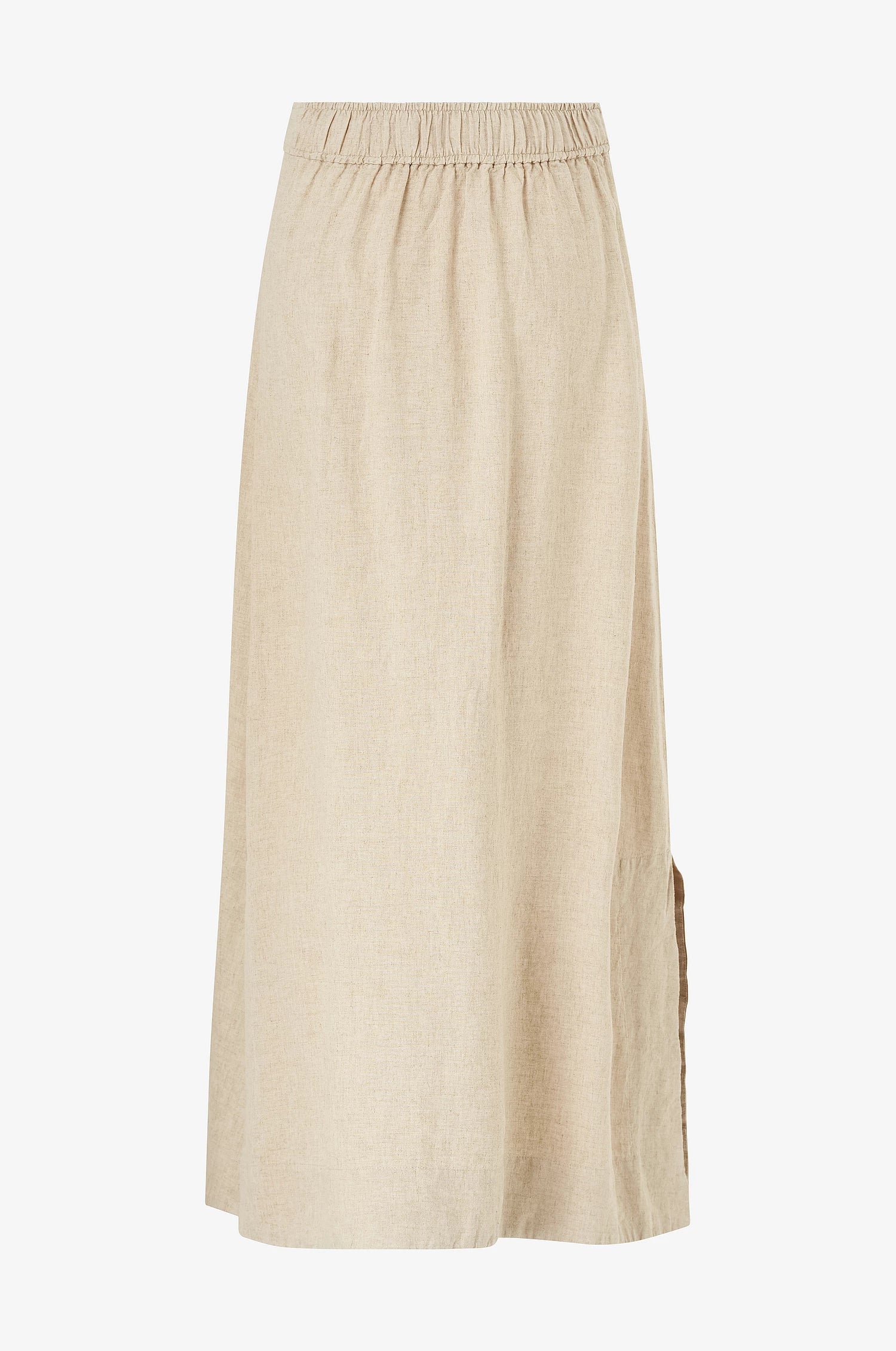 Deilig luftig maxiskjørt i linmiks fra Levete Room. Crispy kvalitet med fin struktur i beige melert farge. Skjørtet har markert linning og behagelig strikk bak i ryggen. Avslappet løs modell som skrår svakt ut, har splitt i sidene og lengde nedpå leggen. Lett anvendelig skjørt i en kvalitet som er ypperlig på varmere dager!