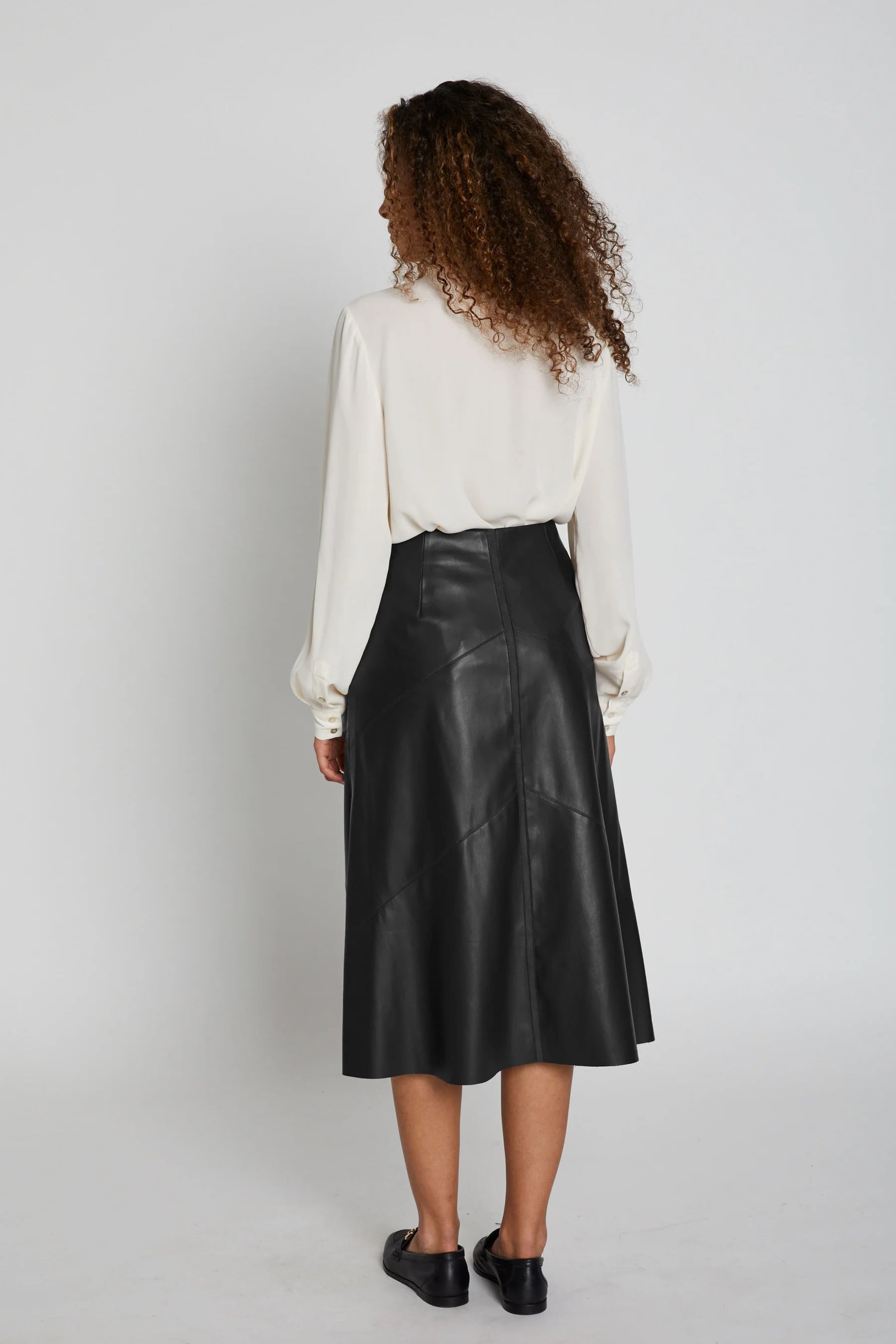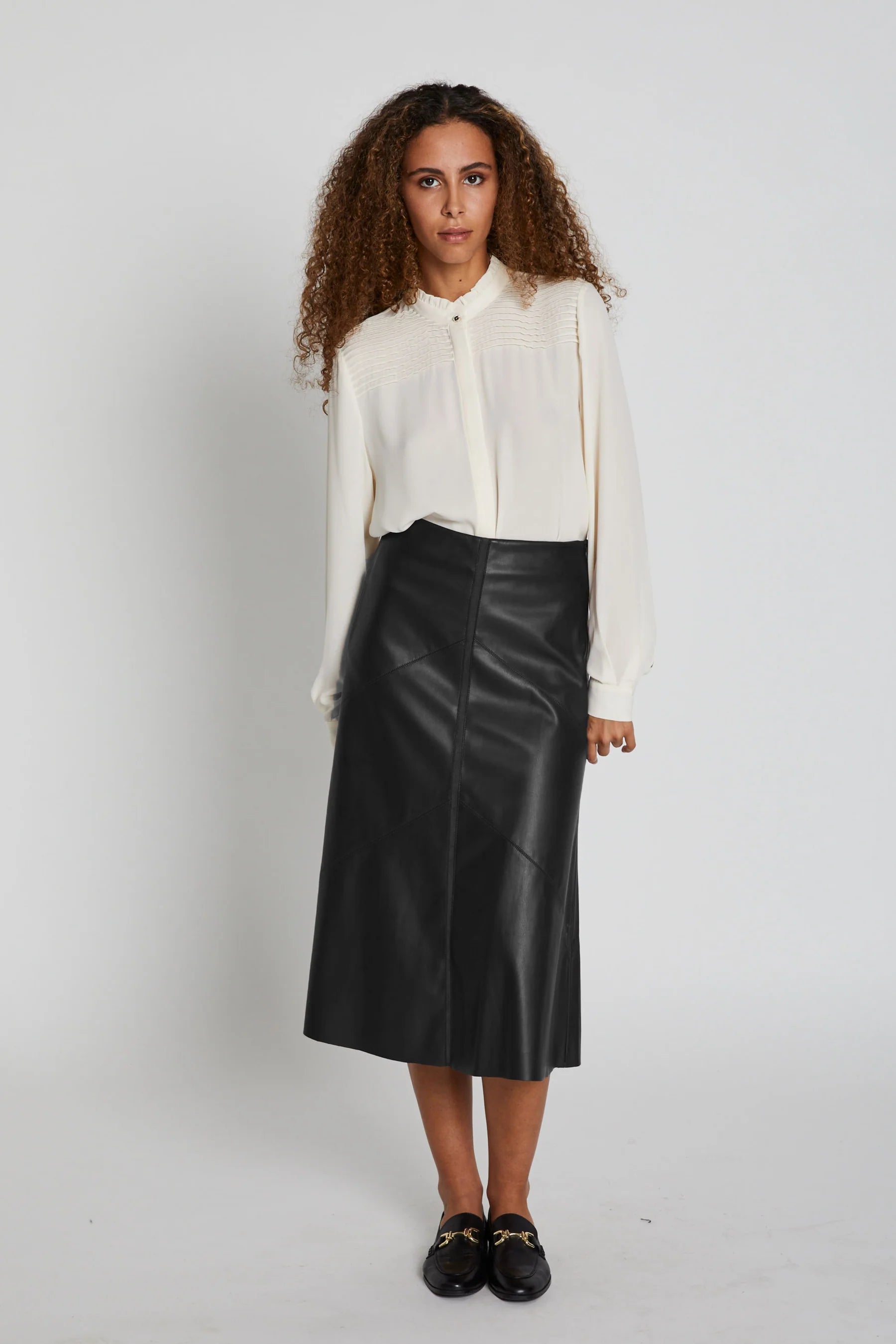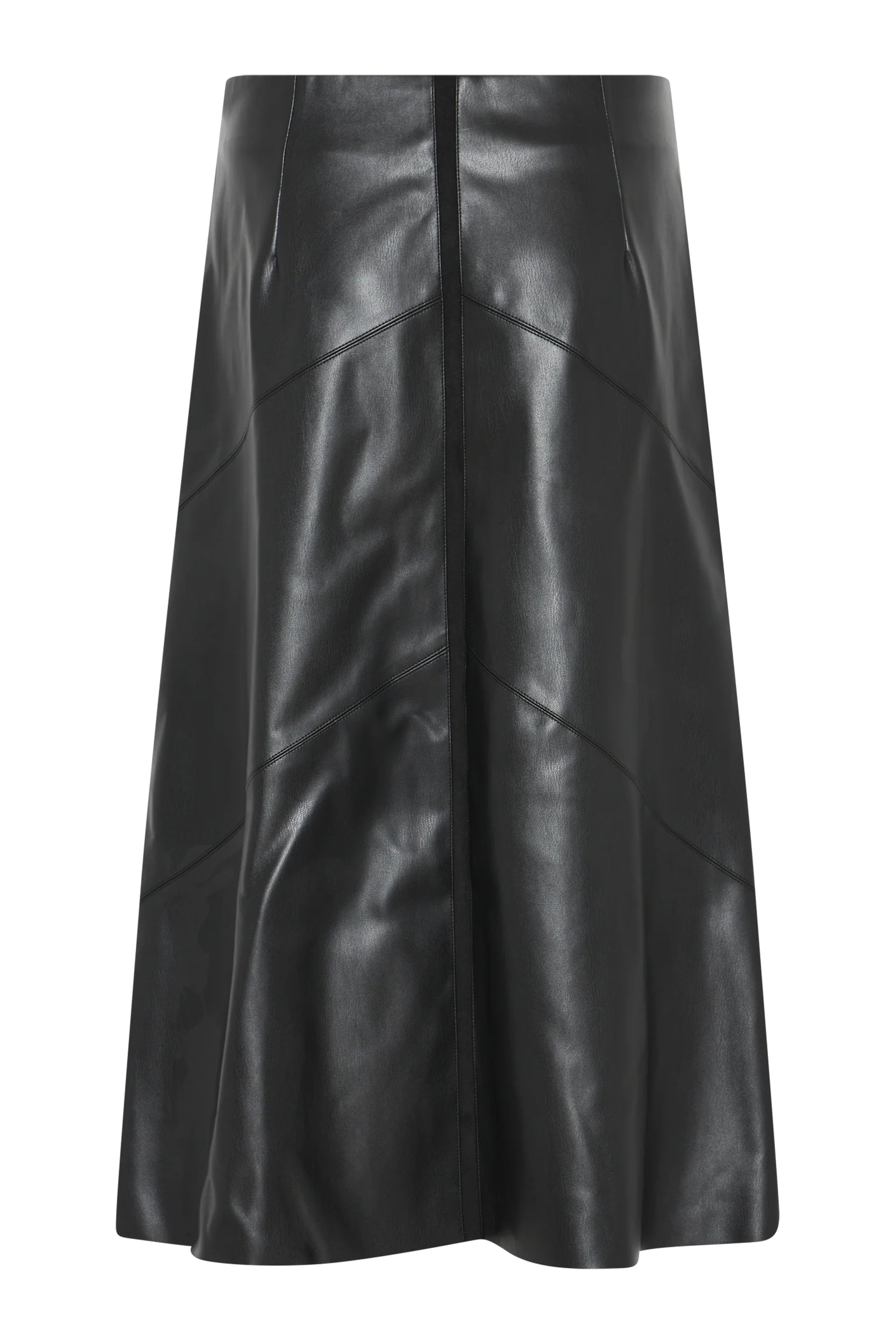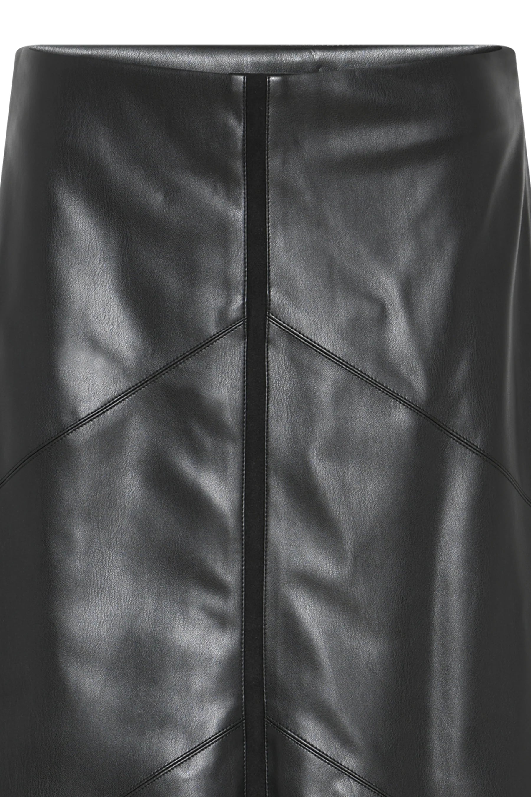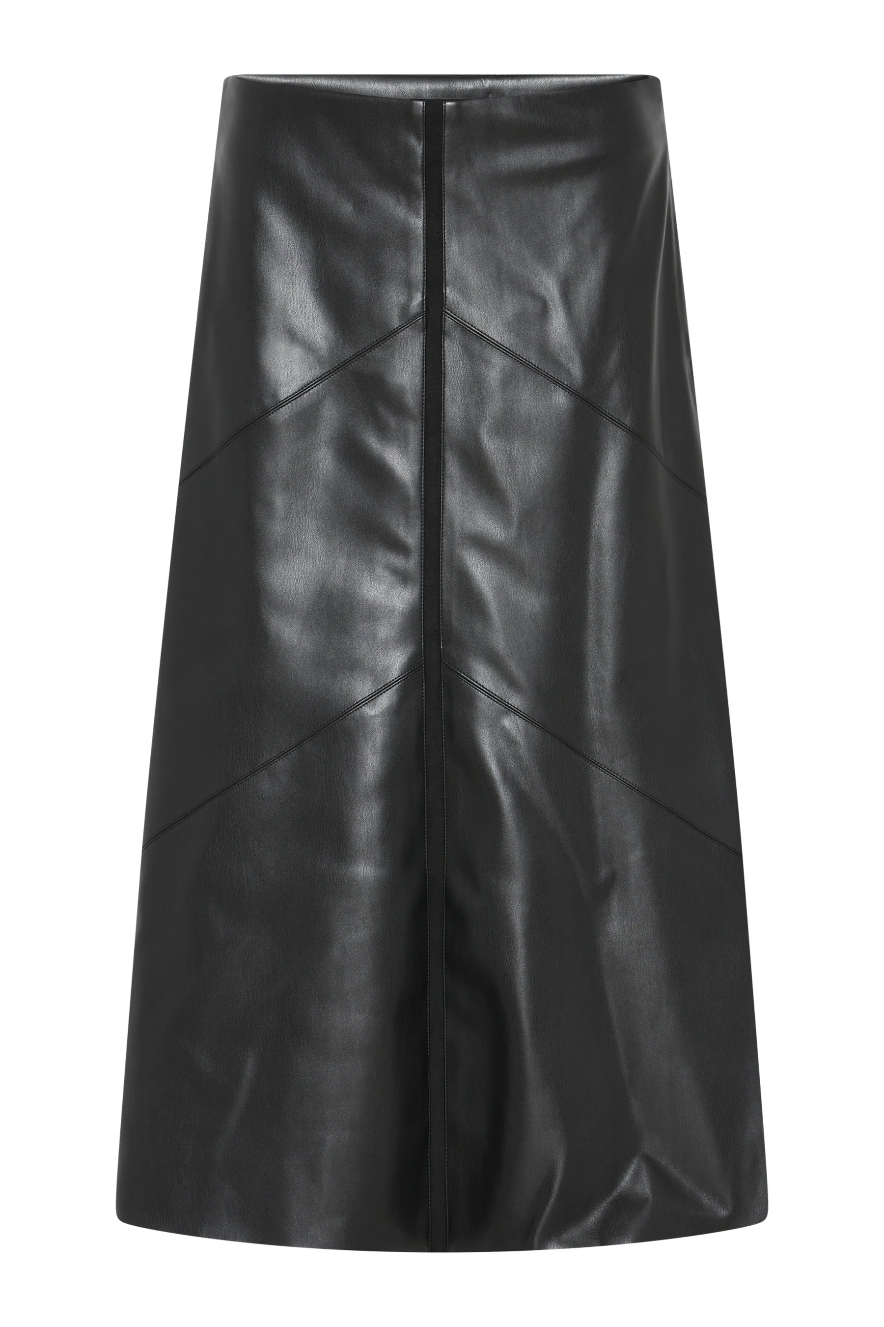Stilfullt knelangt skjørt i vegansk skinn fra Bruuns Bazaar. Skjørtet har en elegant a-form, det er lett fóret og har lukking med skjult glidelås i ene siden. Kombiner med en strikk i hverdagen eller en bluse til fest!