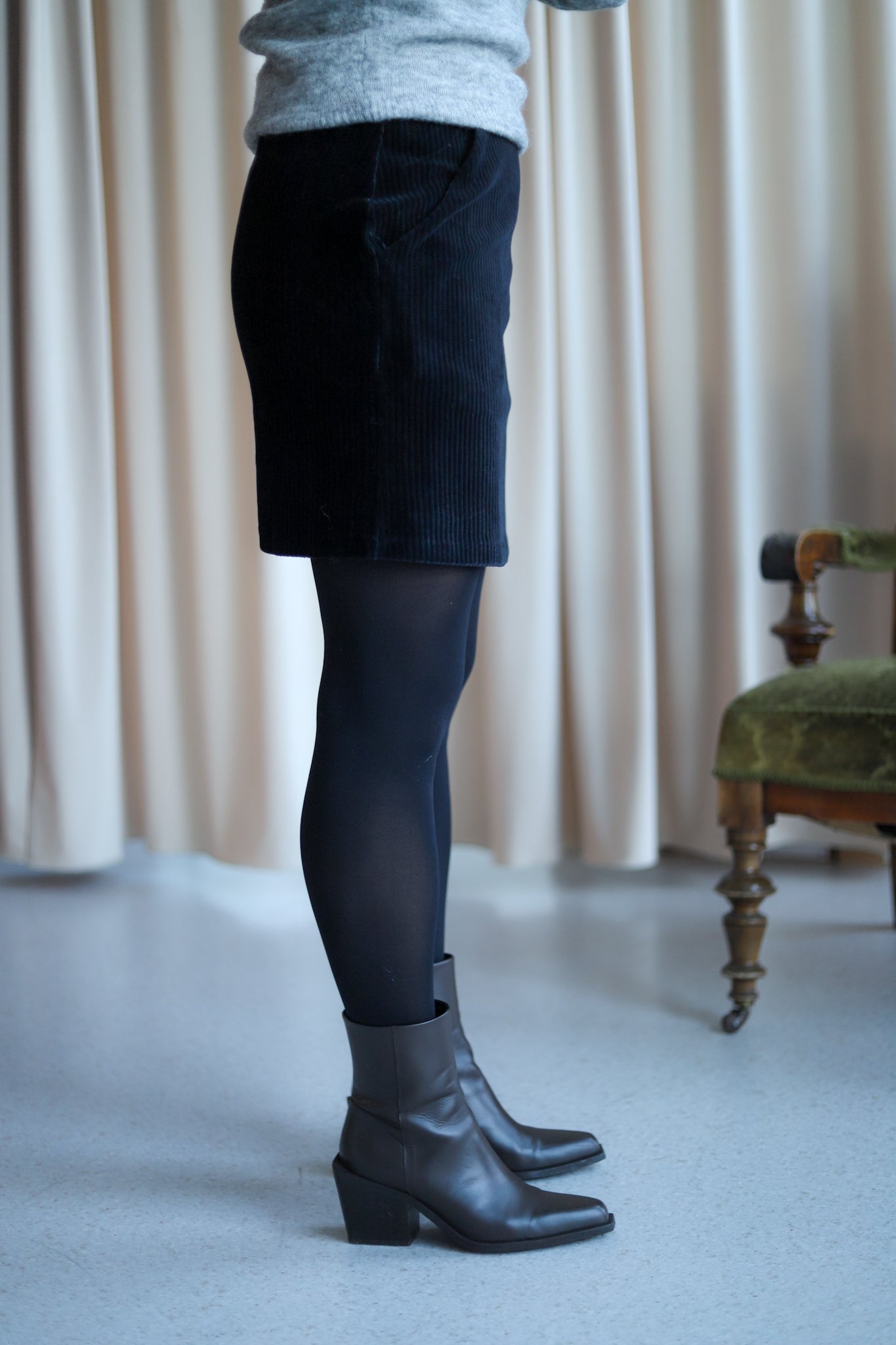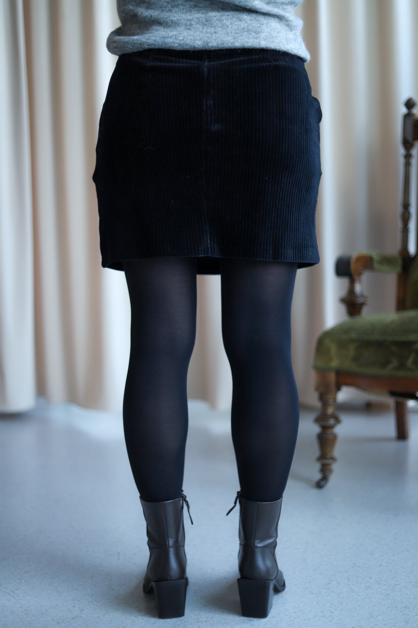 Deilig mykt miniskjørt i cordfløyel fra MSCH Copenhagen. Her i klassisk sort. Feminin passform med innsnitt i livet og skålommer i front og lengde litt over kneet. Skjørtet er lett fóret og lukkes med glidelås bak. Flott bruksskjørt til hverdags og jobb, kombiner med en deilig strikk eller en lekker bluse.