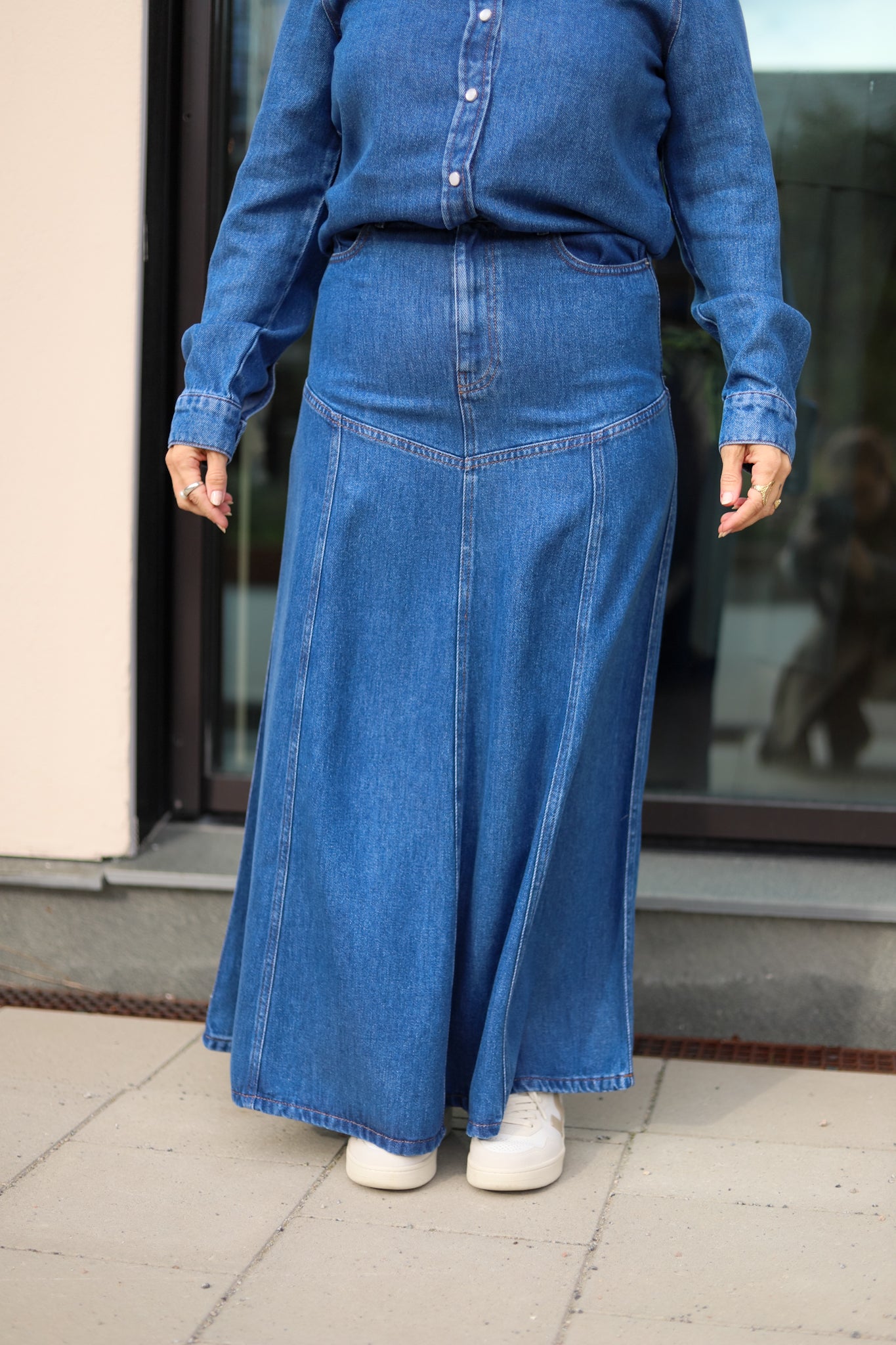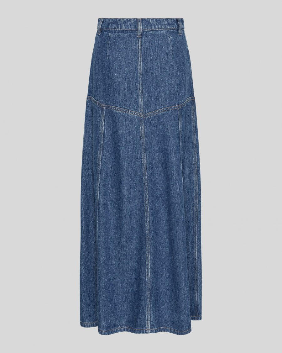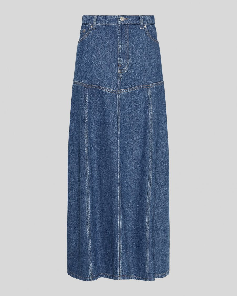 Maxiskjørt i behagelig bløt og lett tencel fra MSCH Copenhagen. Klassisk denimlook med linning, beltehemper, skjult gylf og lommer i front. Topplokket har medium livhøyde og smal passform. Skjørtet skrår ut under hoften og har full lengde. Den myke kvaliteten er behagelig og faller perfekt. Fullfør denim-on-denim trenden med matchende skjorte!