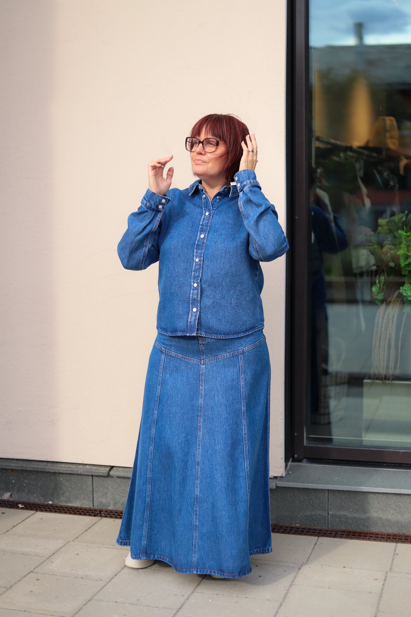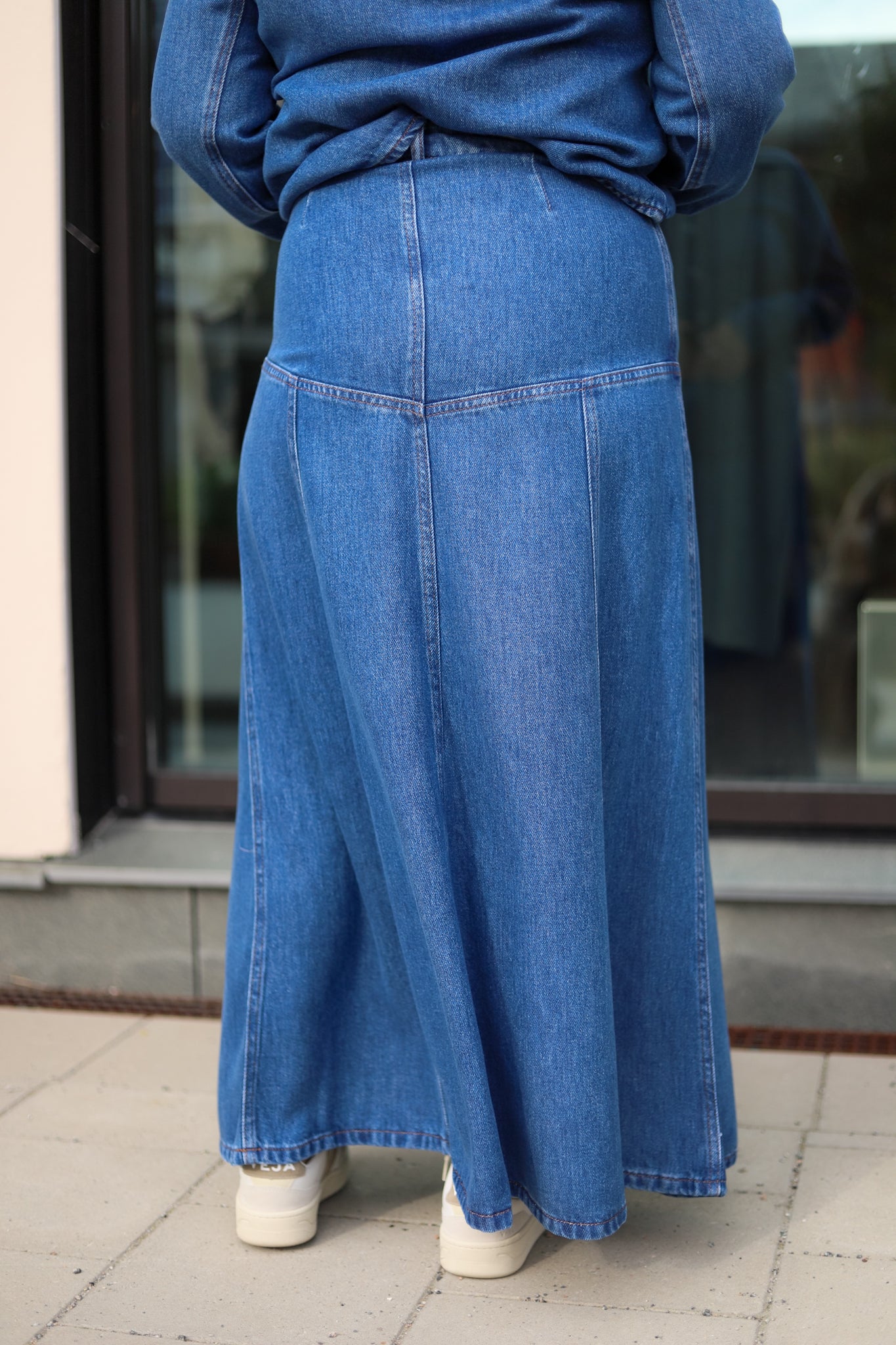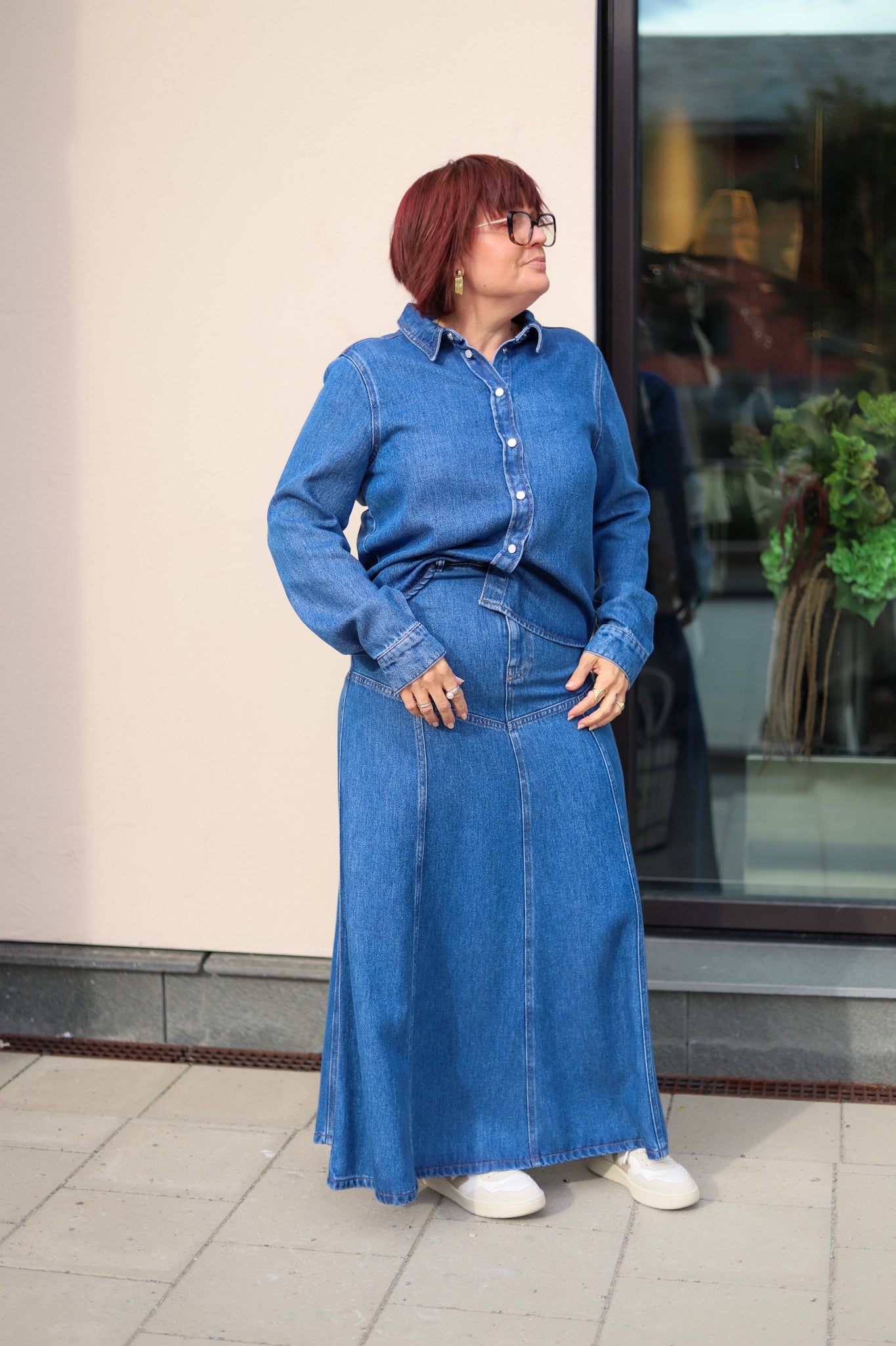 Maxiskjørt i behagelig bløt og lett tencel fra MSCH Copenhagen. Klassisk denimlook med linning, beltehemper, skjult gylf og lommer i front. Topplokket har medium livhøyde og smal passform. Skjørtet skrår ut under hoften og har full lengde. Den myke kvaliteten er behagelig og faller perfekt. Fullfør denim-on-denim trenden med matchende skjorte!