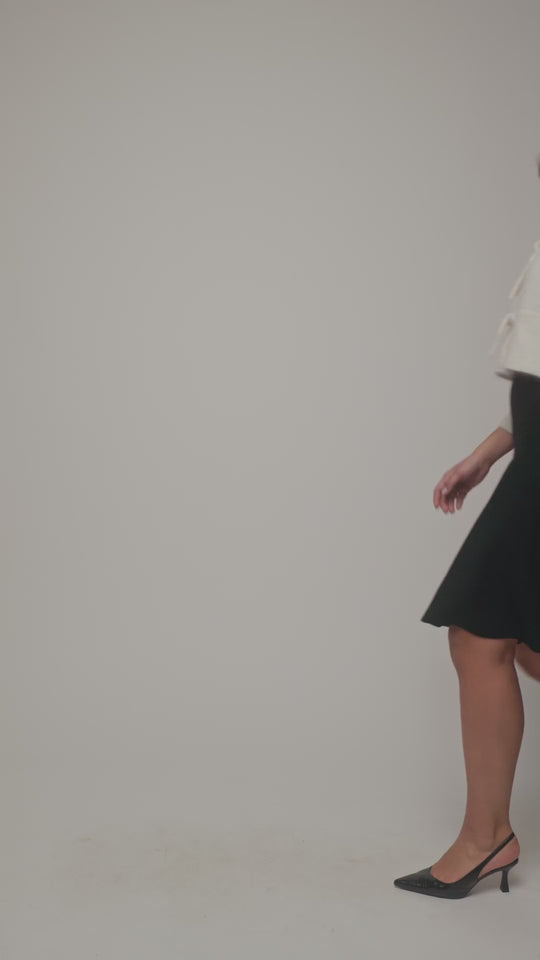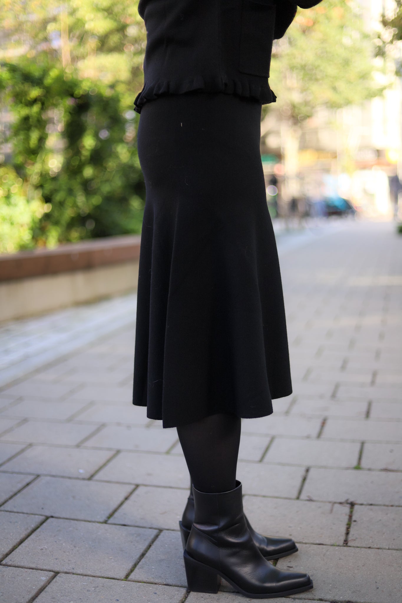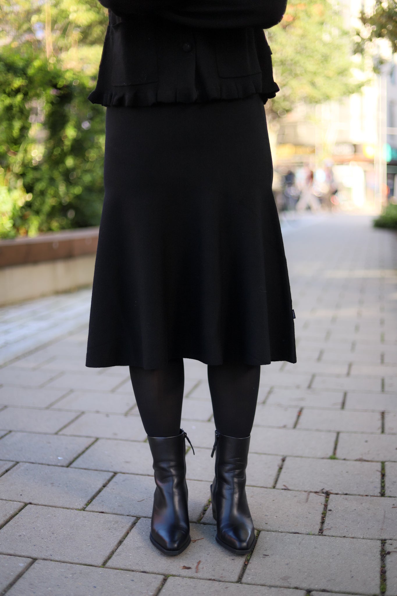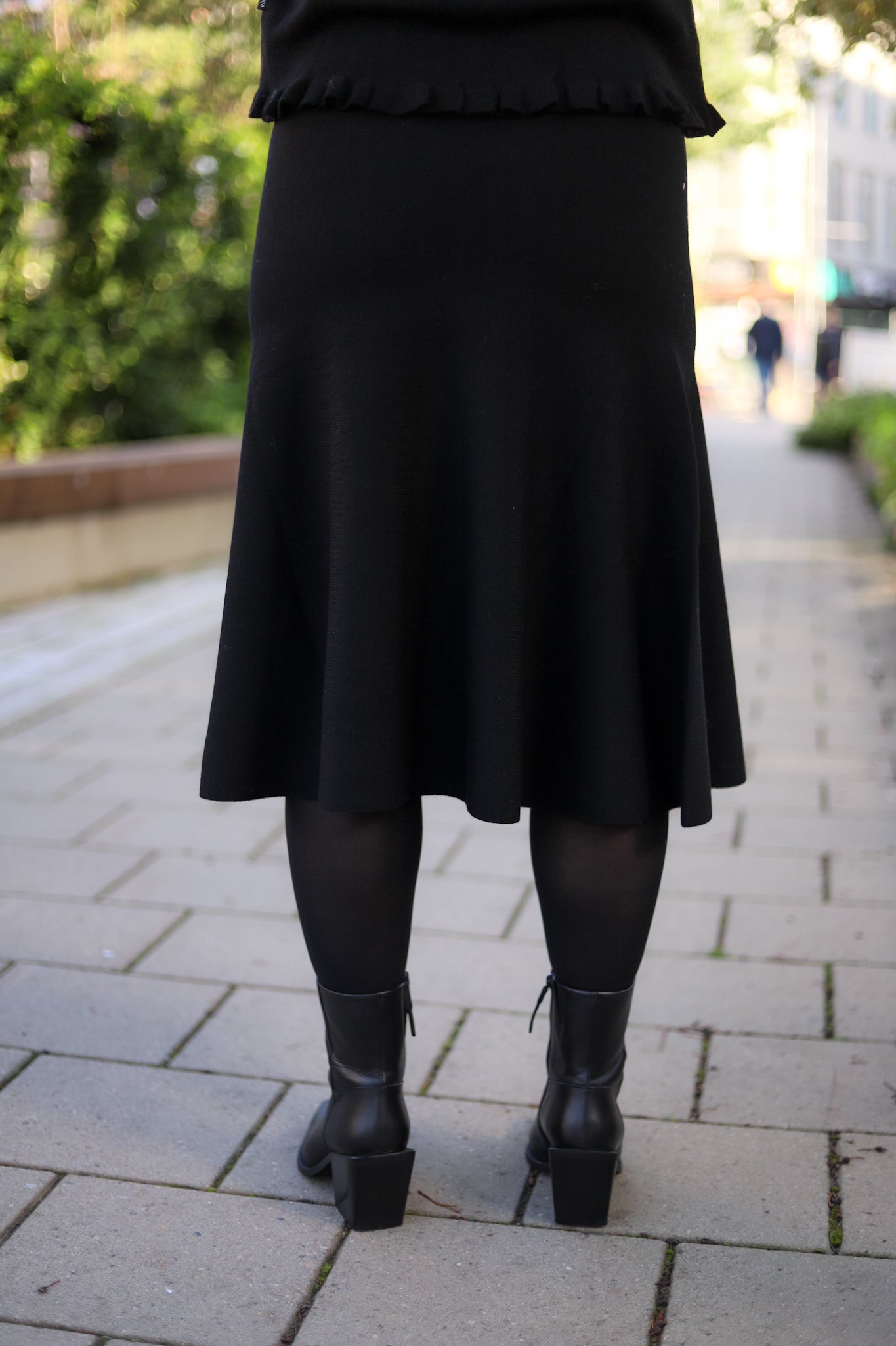 Feminint skjørt i klassisk sort merinoull fra Ella&il. Modellen skrår ut i a-form med lengde til under kneet. Elastisk strikk i midjen gir en behagelig passform. Perfekt skjørt til alle anledninger! Style med matchende overdel for komplett look.