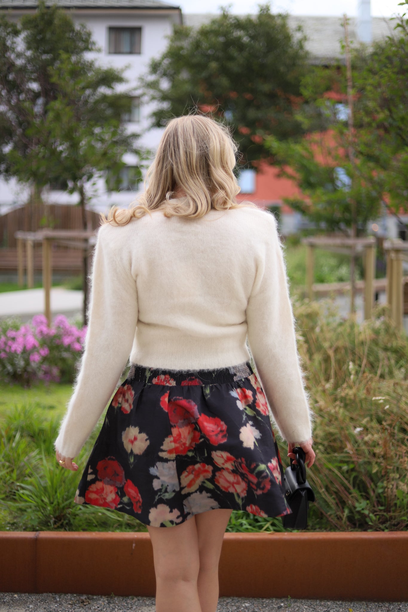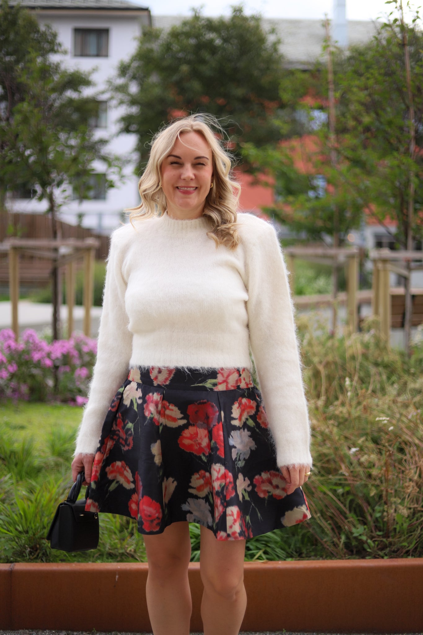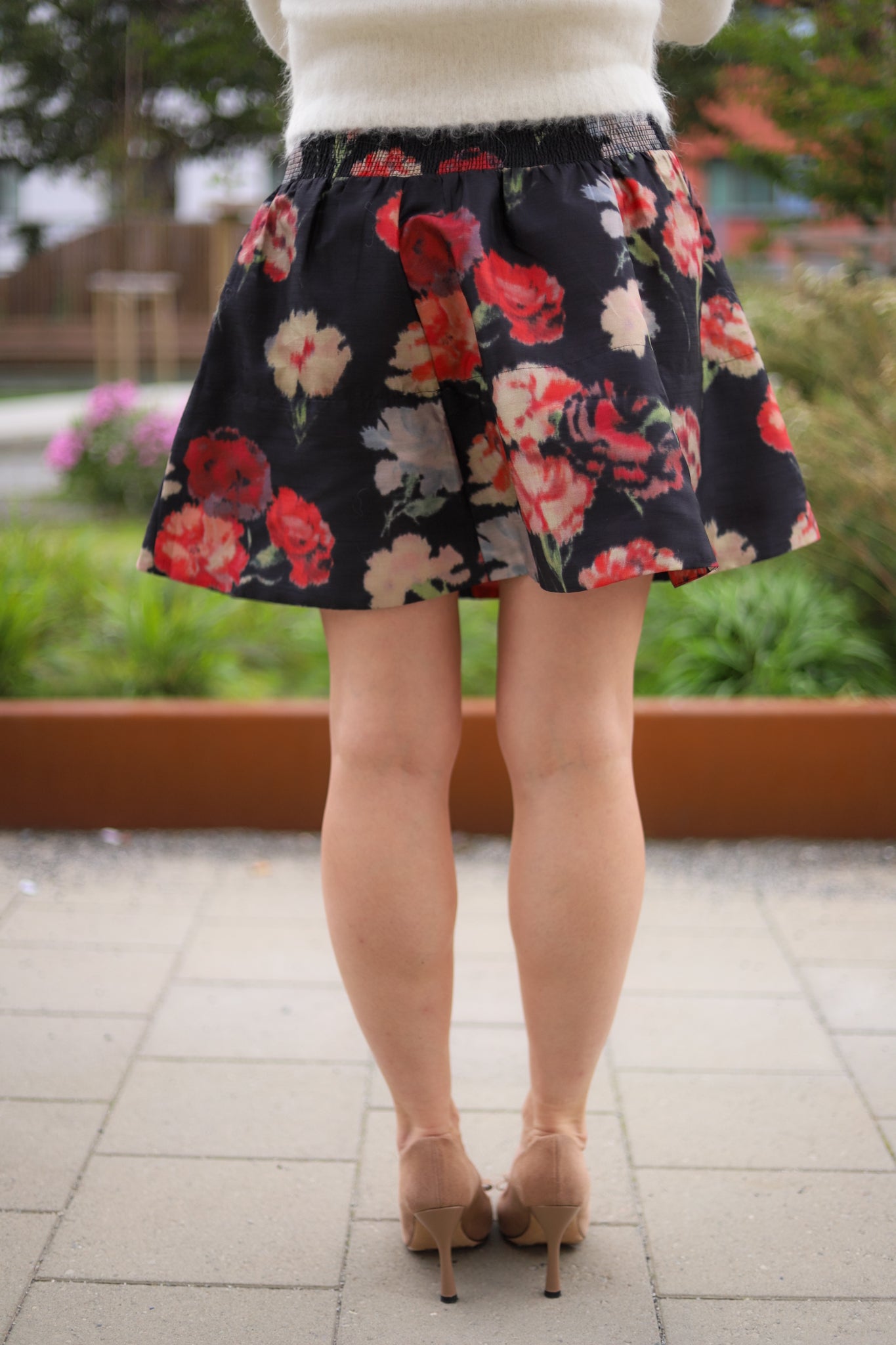 Lekkert voluminøst miniskjørt fra by TiMo. Sort bunn dekket av vakkert stort blomsterprint i friske toner, i en shiny, stødig og strukturert kvalitet. Skjørtet har markert midje med linning og behagelig smock i ryggen. Modellen skrår ut, lukkes med skjult glidelås i siden og lengden stopper midt på låret. Nydelig skjørt som kan pyntes opp eller ned etter anledningen!