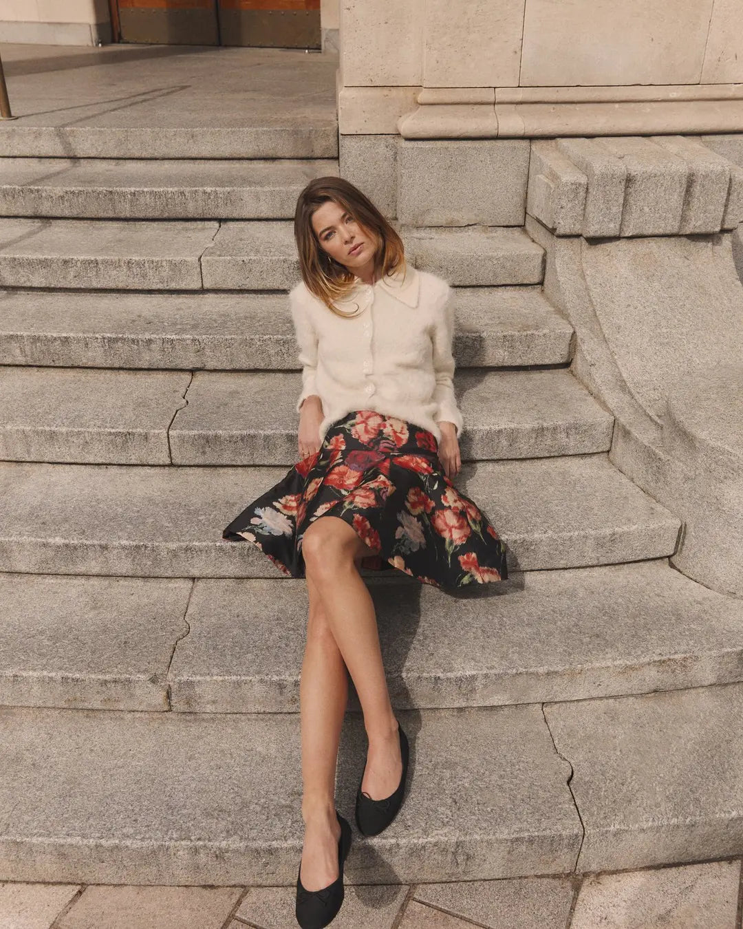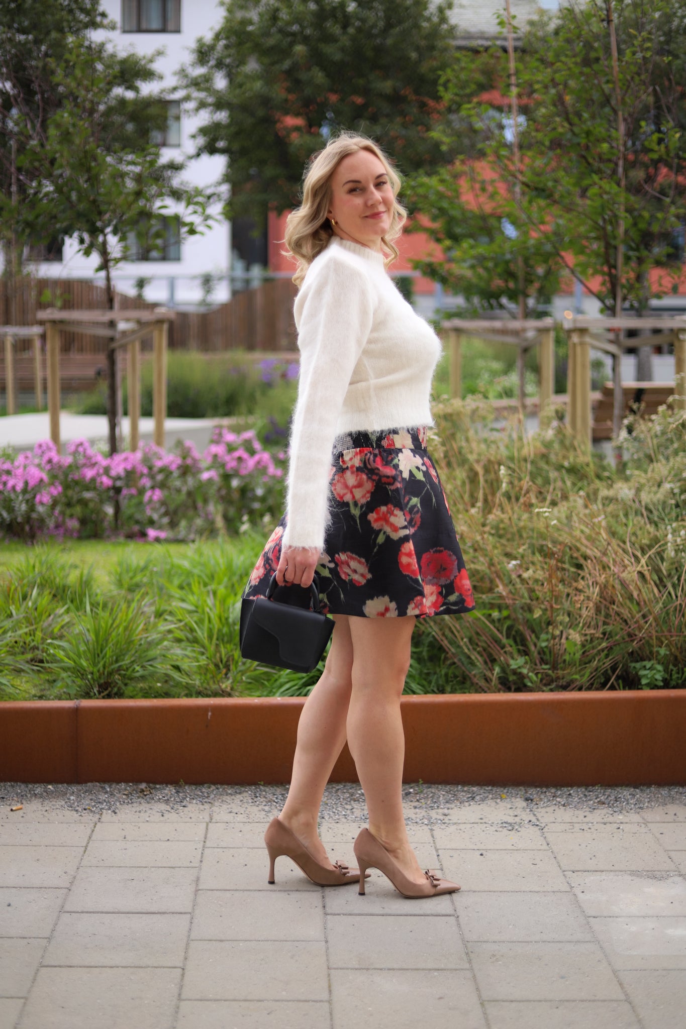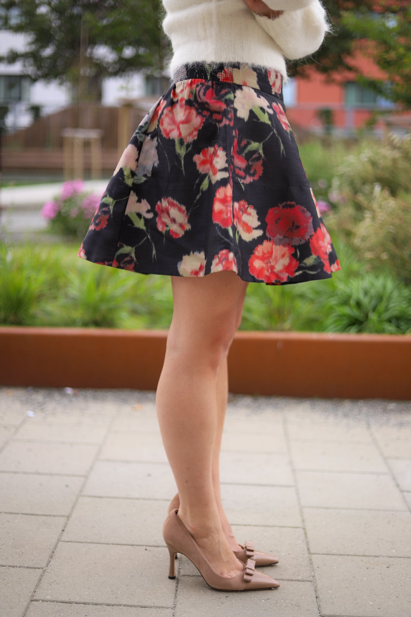 Lekkert voluminøst miniskjørt fra by TiMo. Sort bunn dekket av vakkert stort blomsterprint i friske toner, i en shiny, stødig og strukturert kvalitet. Skjørtet har markert midje med linning og behagelig smock i ryggen. Modellen skrår ut, lukkes med skjult glidelås i siden og lengden stopper midt på låret. Nydelig skjørt som kan pyntes opp eller ned etter anledningen!