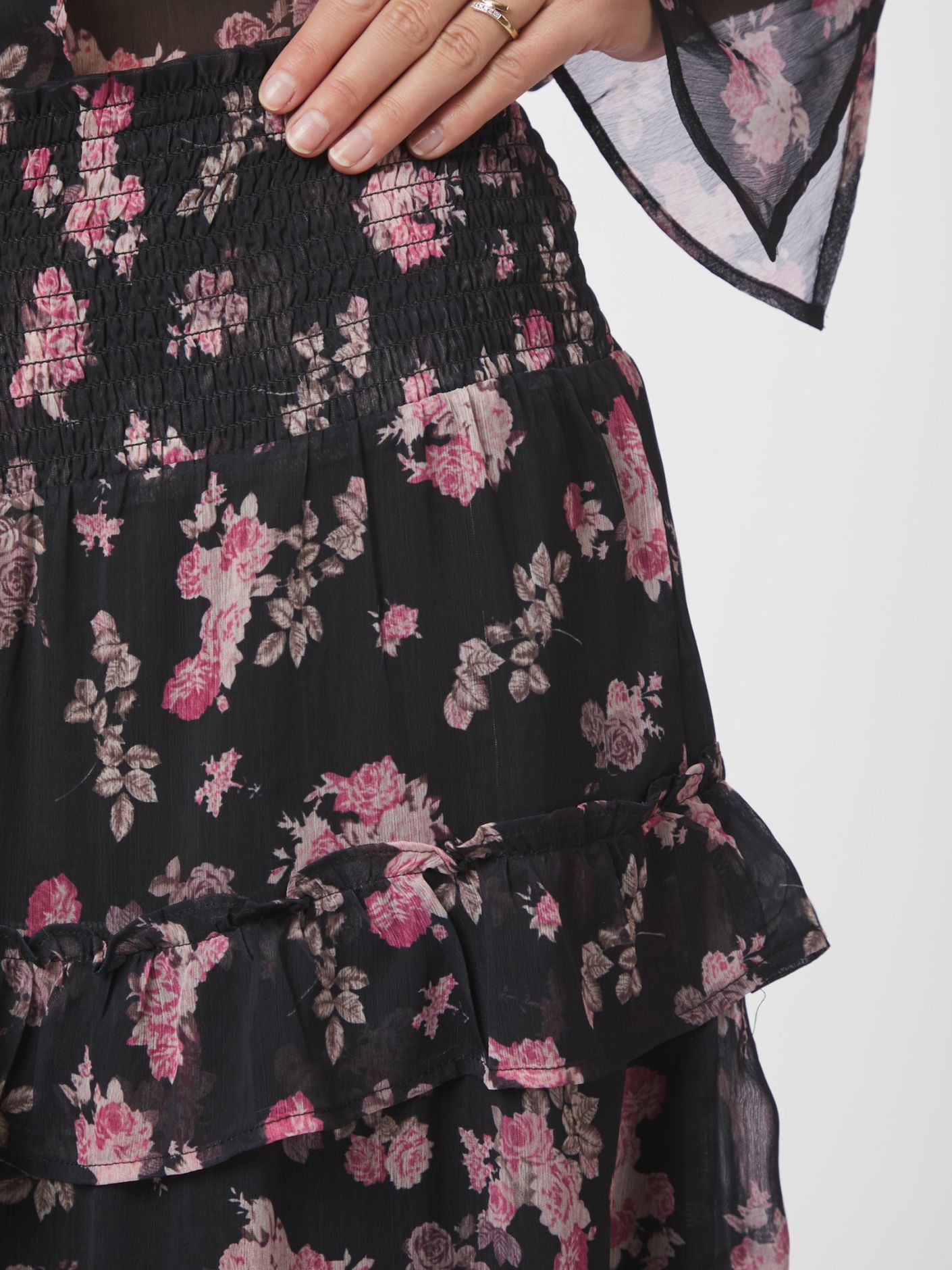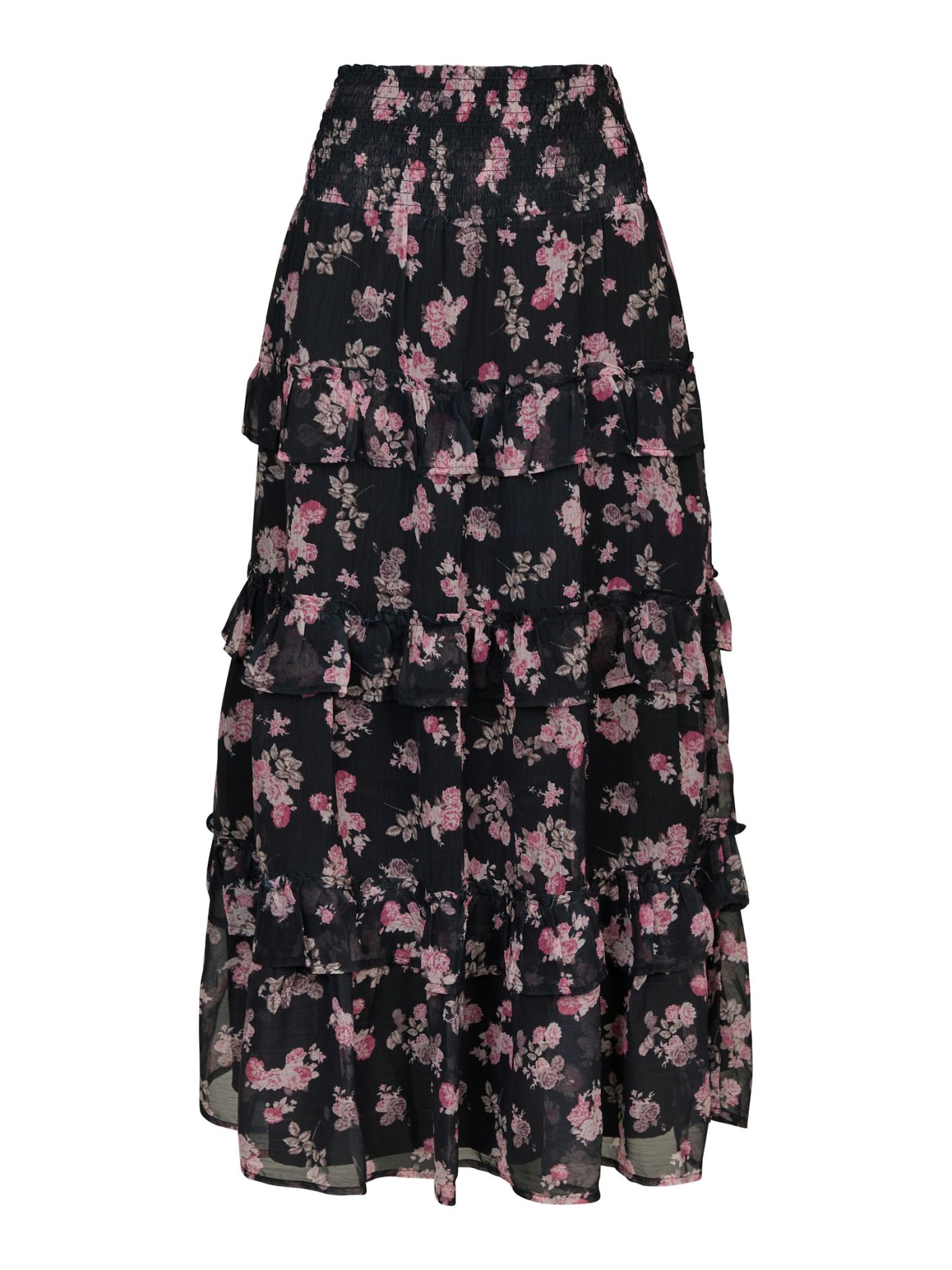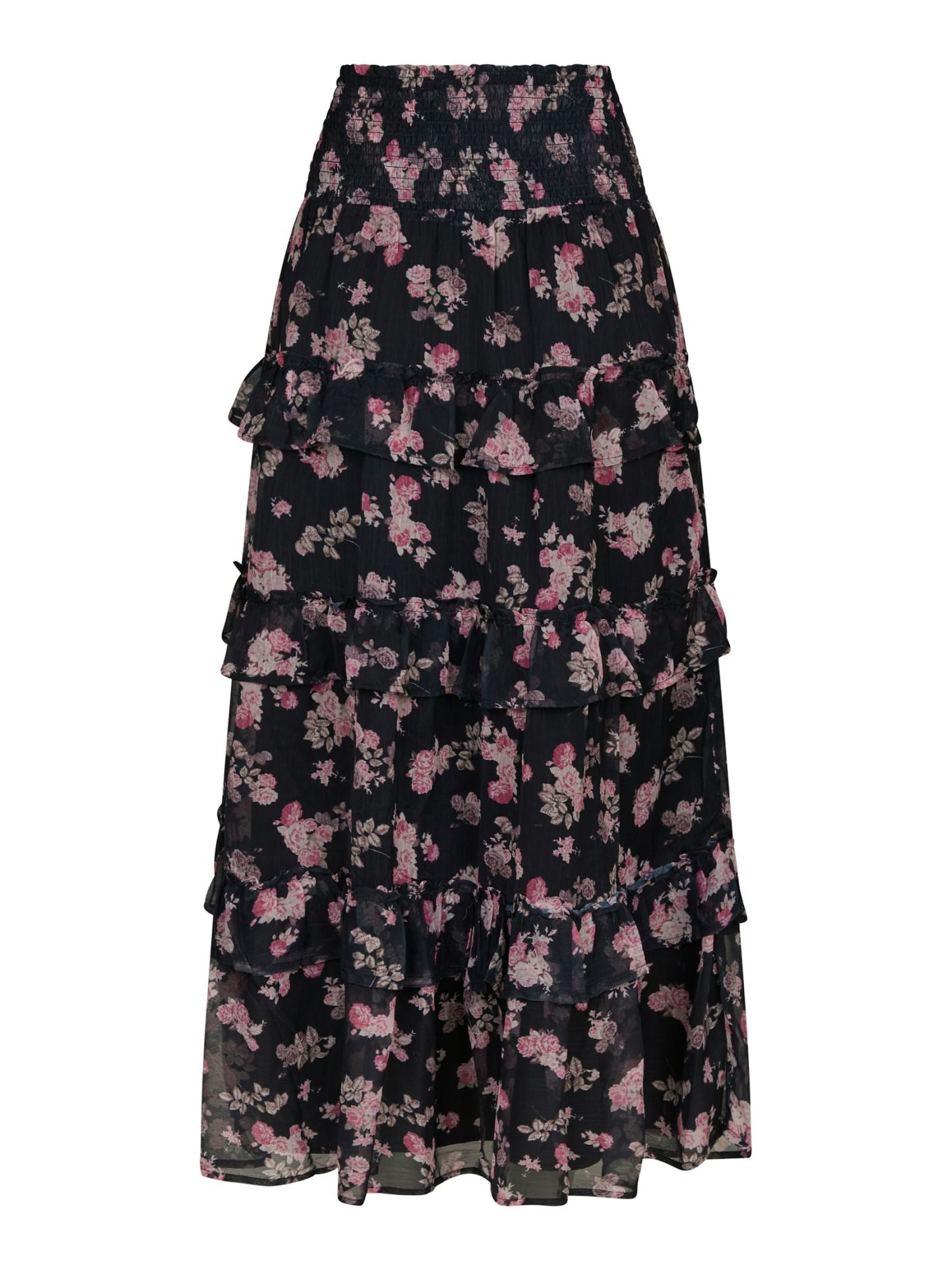 Flagrende skjørt med mørk blå bunn og flerfarget blomsterprint fra Neo Noir. Modellen har bred midje med elastisk strikk og axilengde med feminine volanger. Voluminøst skjørt, perfekt med strikk og boots.