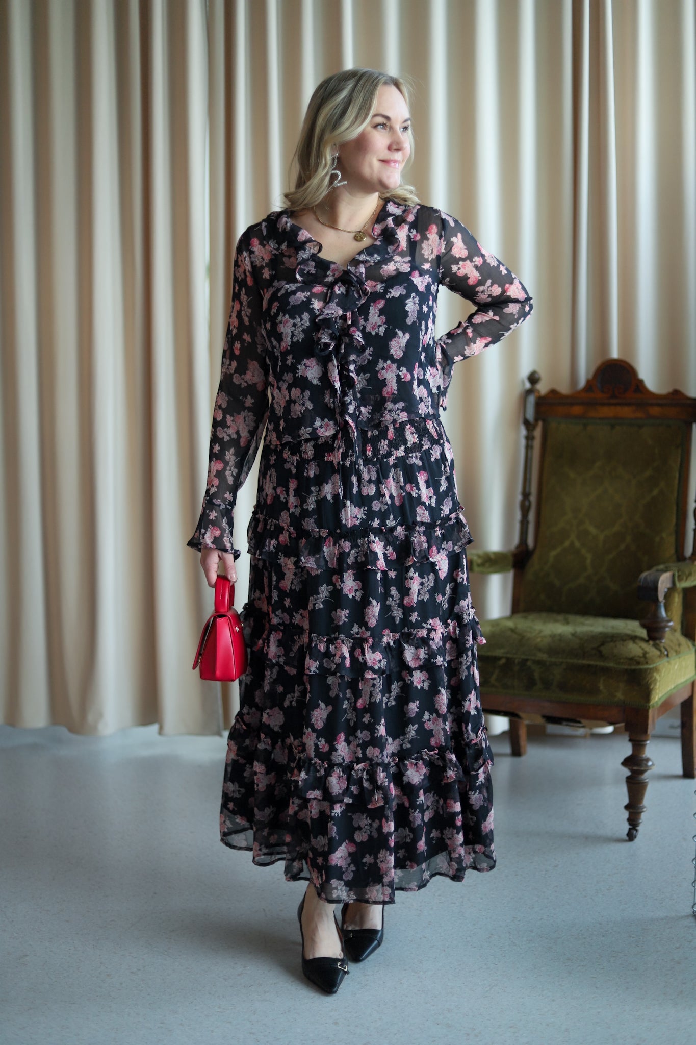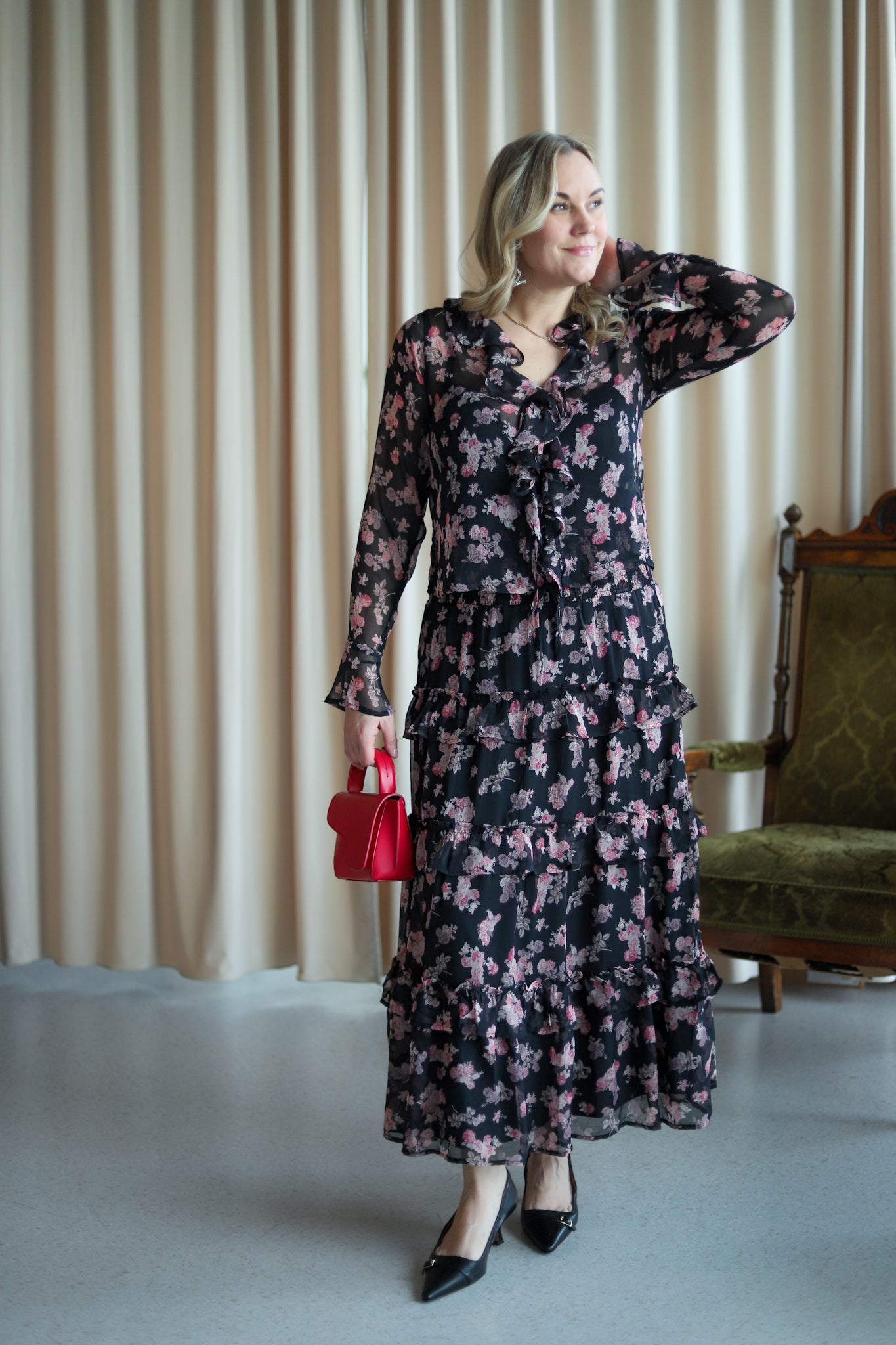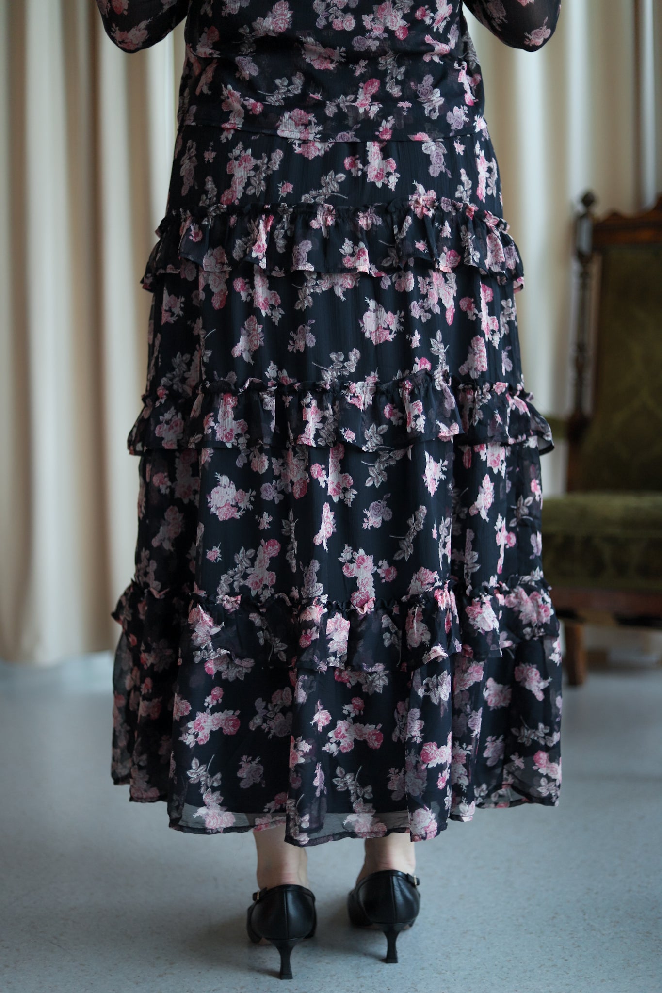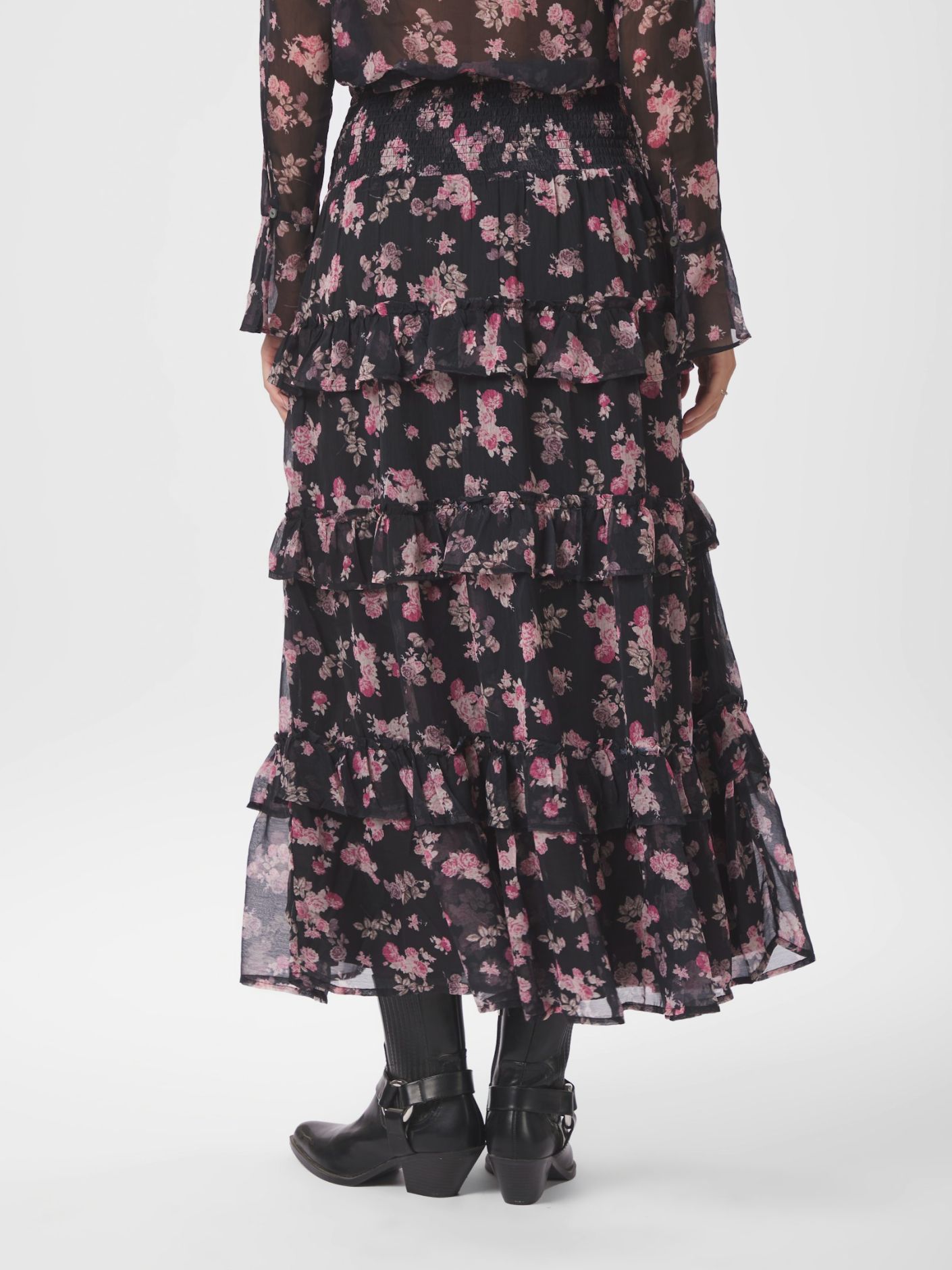 Flagrende skjørt med mørk blå bunn og flerfarget blomsterprint fra Neo Noir. Modellen har bred midje med elastisk strikk og axilengde med feminine volanger. Voluminøst skjørt, perfekt med strikk og boots.