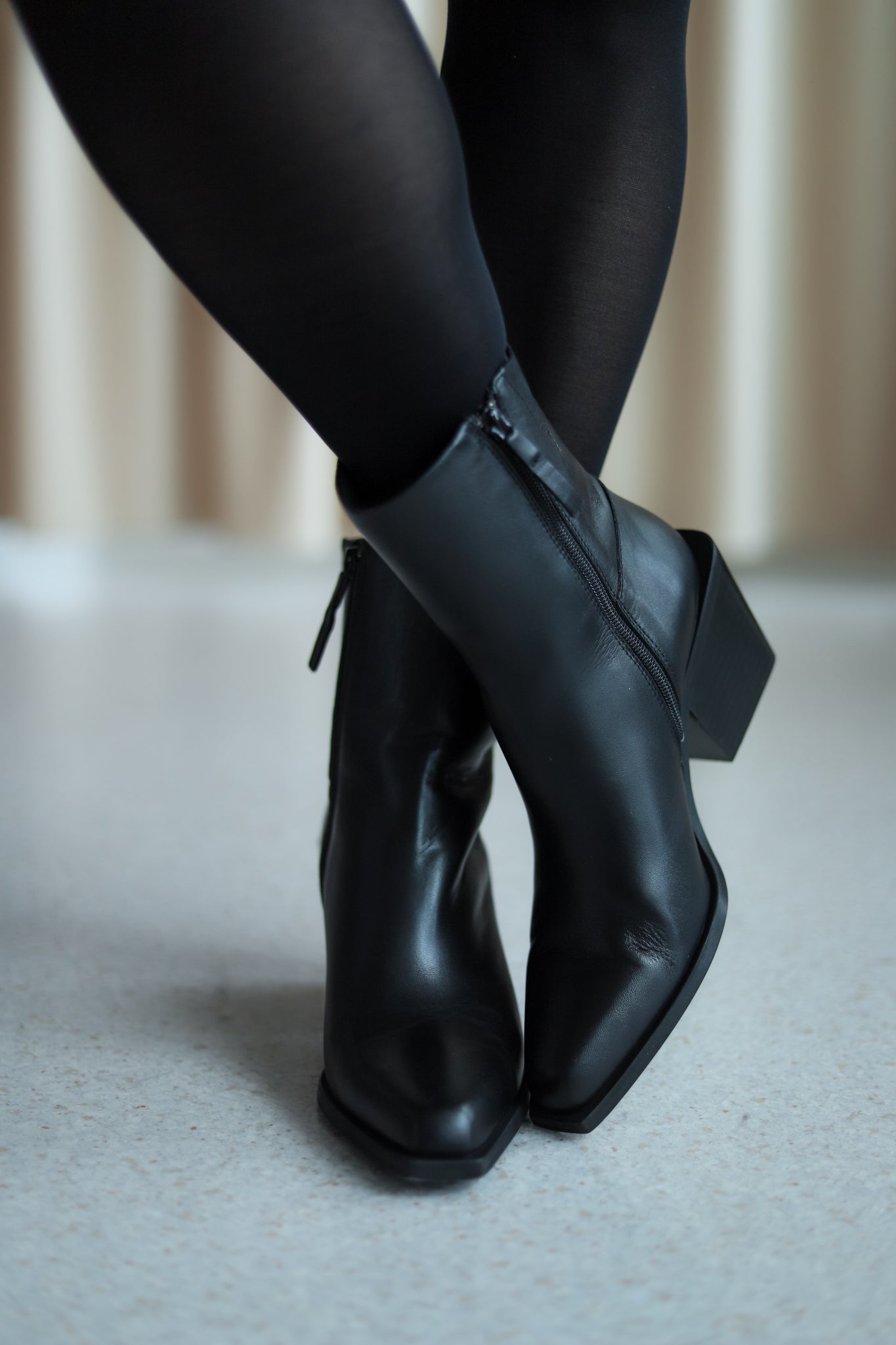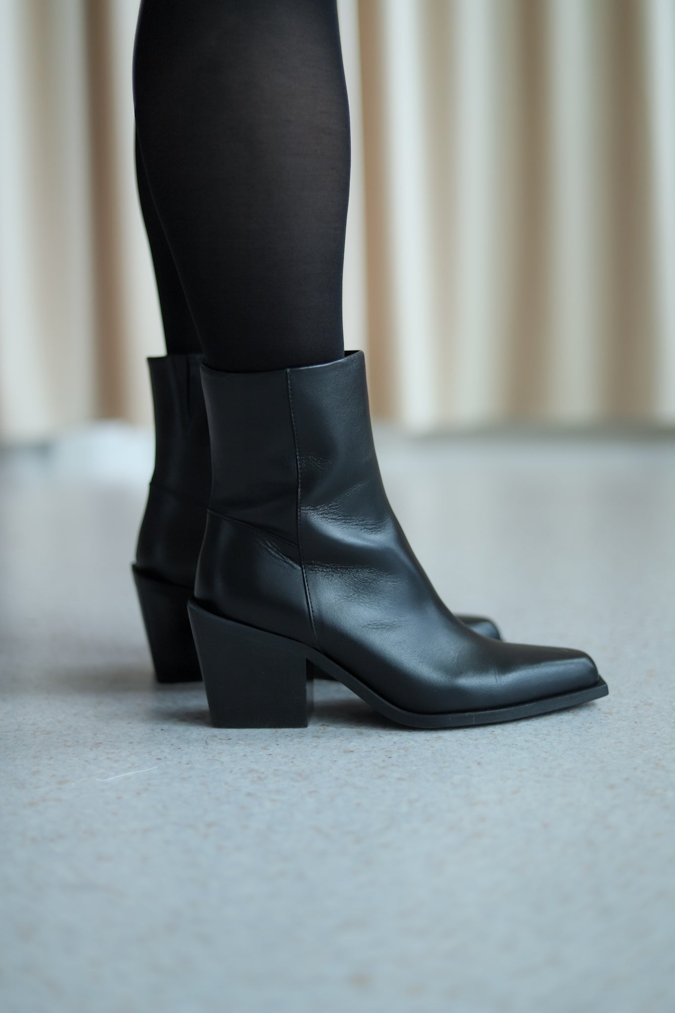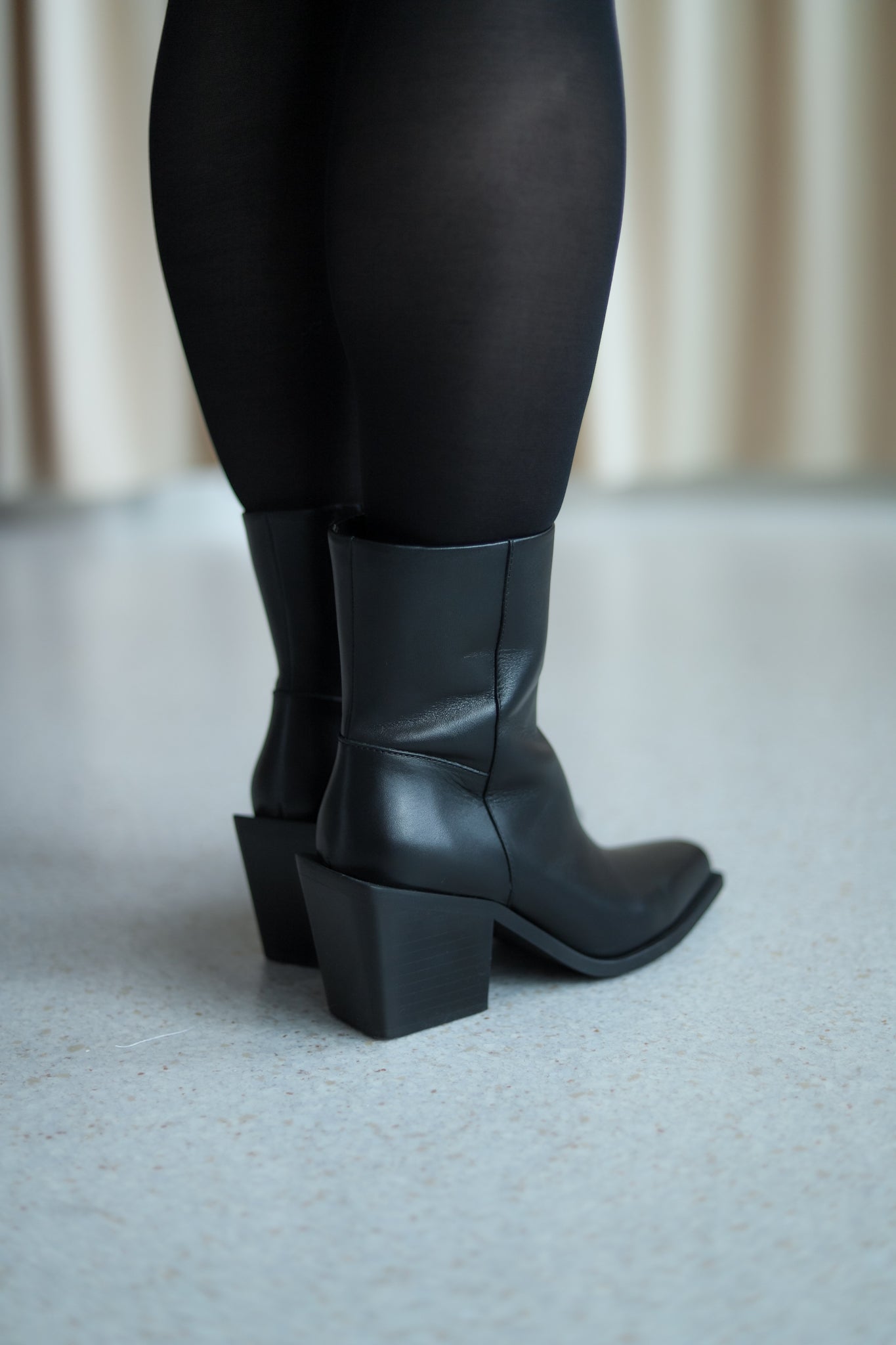 Stilige skinnboots i klassisk sort fra Camilla Pihl. Tidløs modell med tøff blokkhæl, spiss tå som er butt i tuppen og skjult glidelås på innsiden. Bootsene er elegant og komfortabel - like fin til jeans, dressbukser og kjoler. En vinner i sesongens garderobe, perfekt til både hverdags og fest!