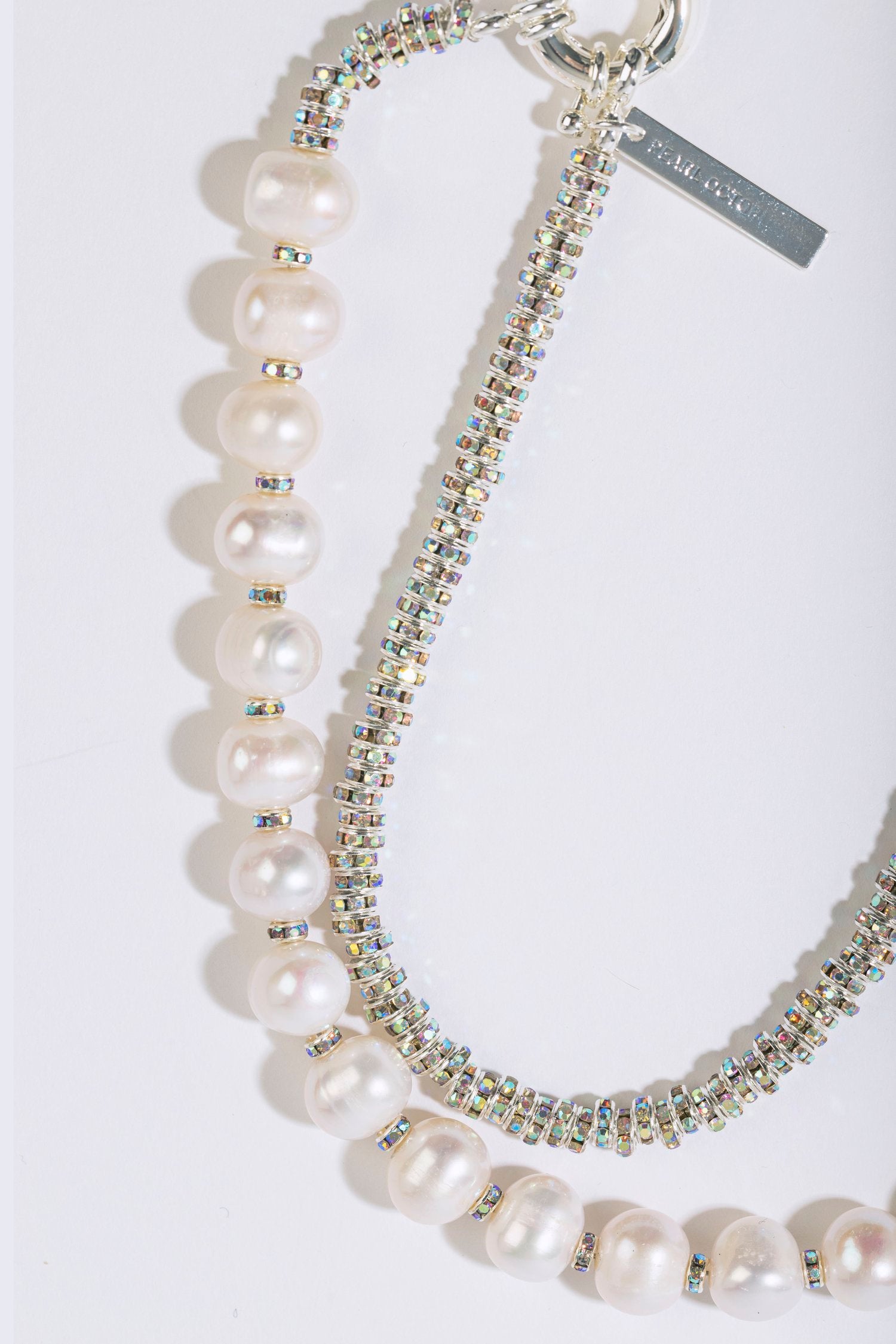PARIS DIAMOND NECKLACE er et håndlaget smykke med organiske ferskvannsperler og sølvbelagte rondelle-krystaller. Laget på en fleksibel aluminiumswire for at det skal forme seg pent rundt halsen. Det har rund fjærlås i sølv og er behagelig lett i vekt. Elegant todelt smykke som gir en stilig asymmetri.