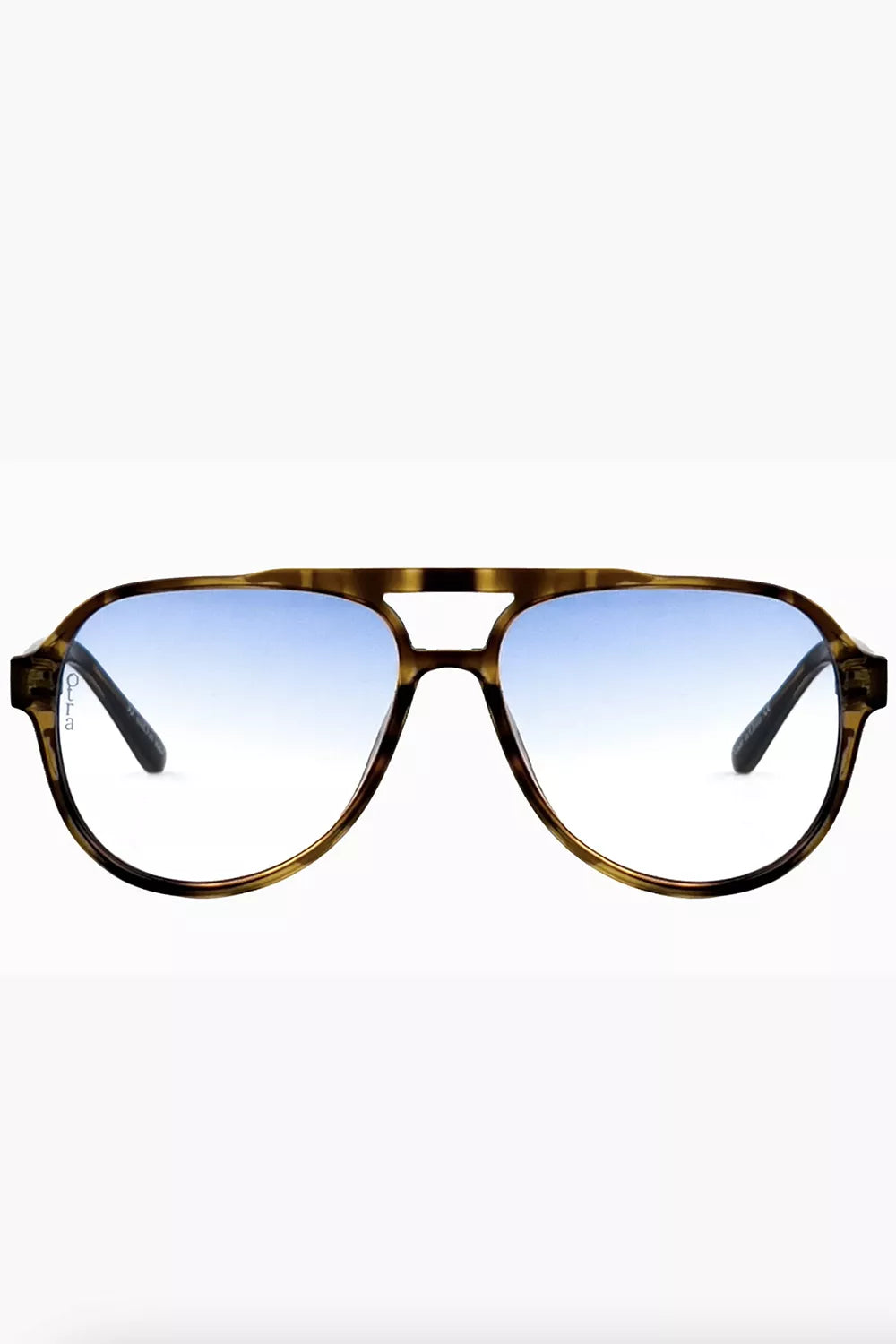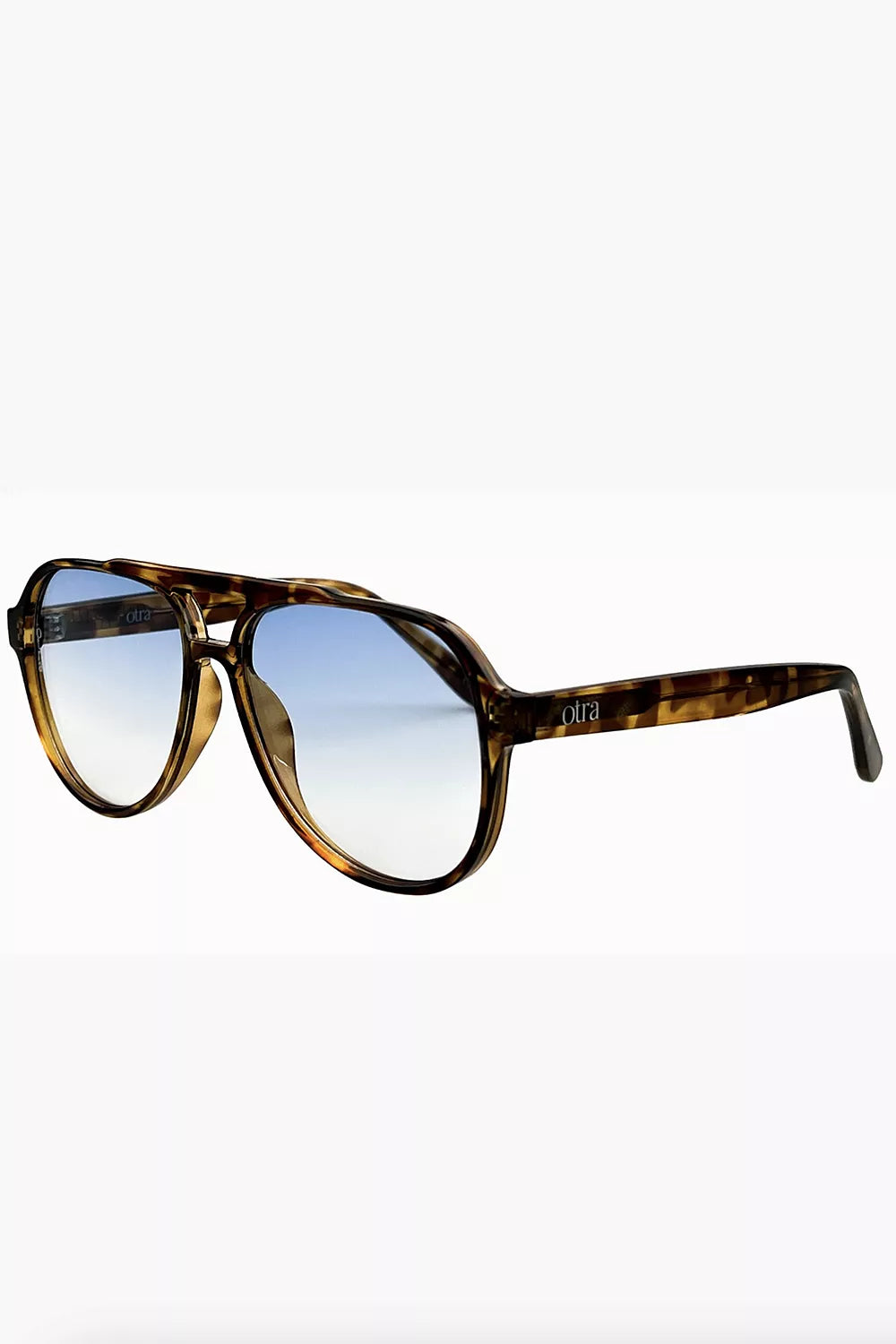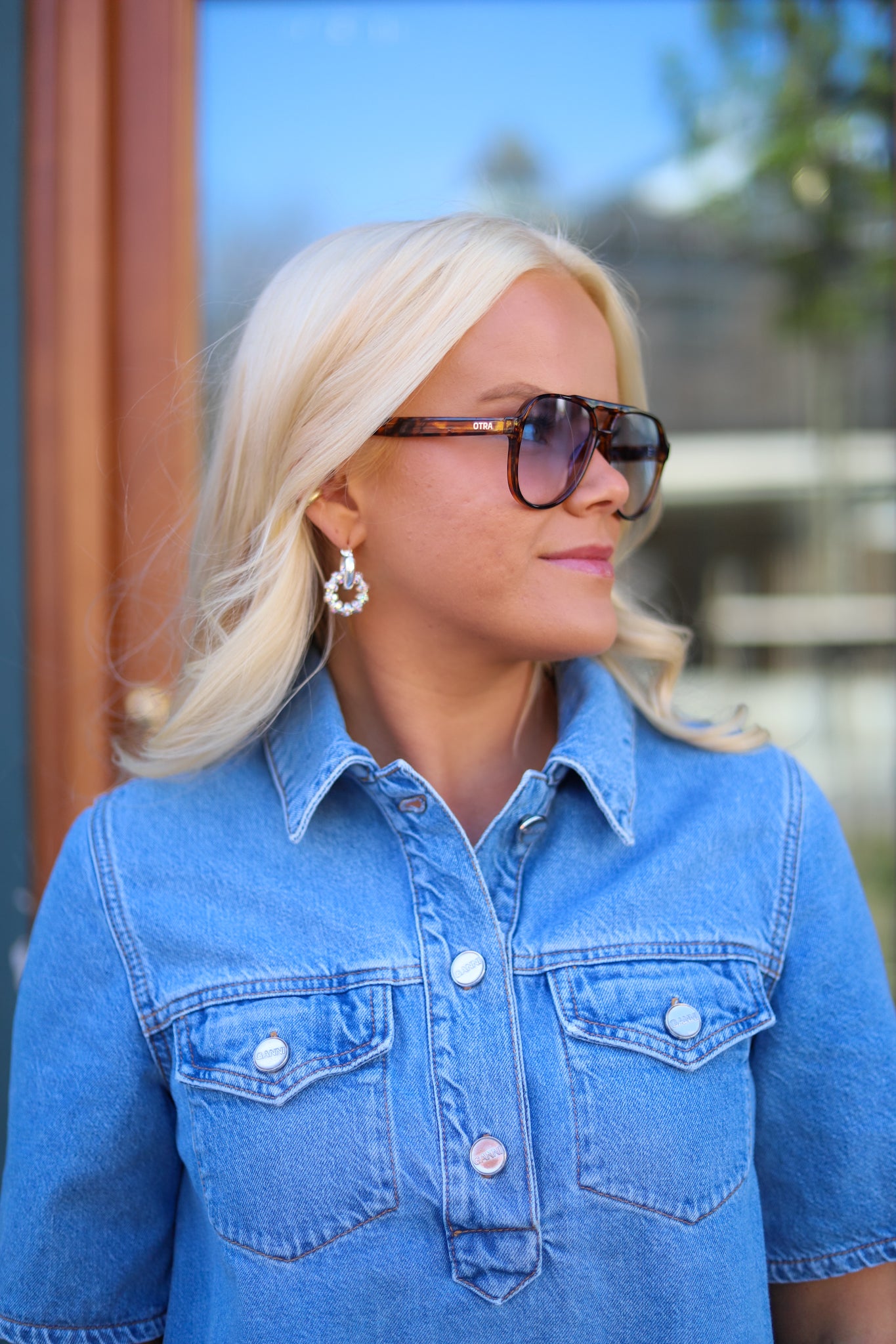 Retro og funksjonelle solbriller fra Otra. Kul oversized fasong med store linser og pilotformet innfatning. Tortise ramme med smale stenger og sotede linser i lys blå. 100% UV-beskyttelse. Mykt vegansk etui medfølger.