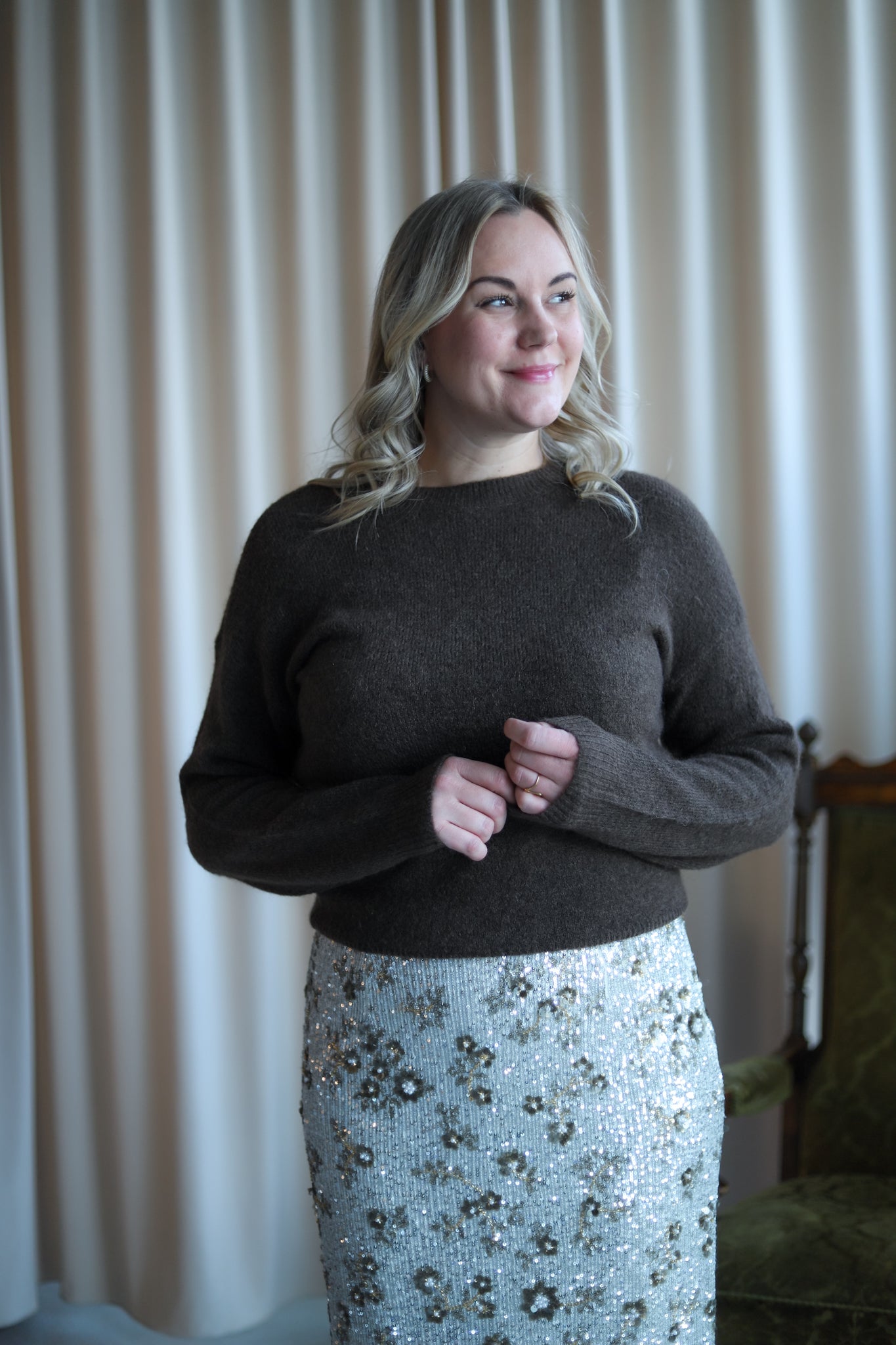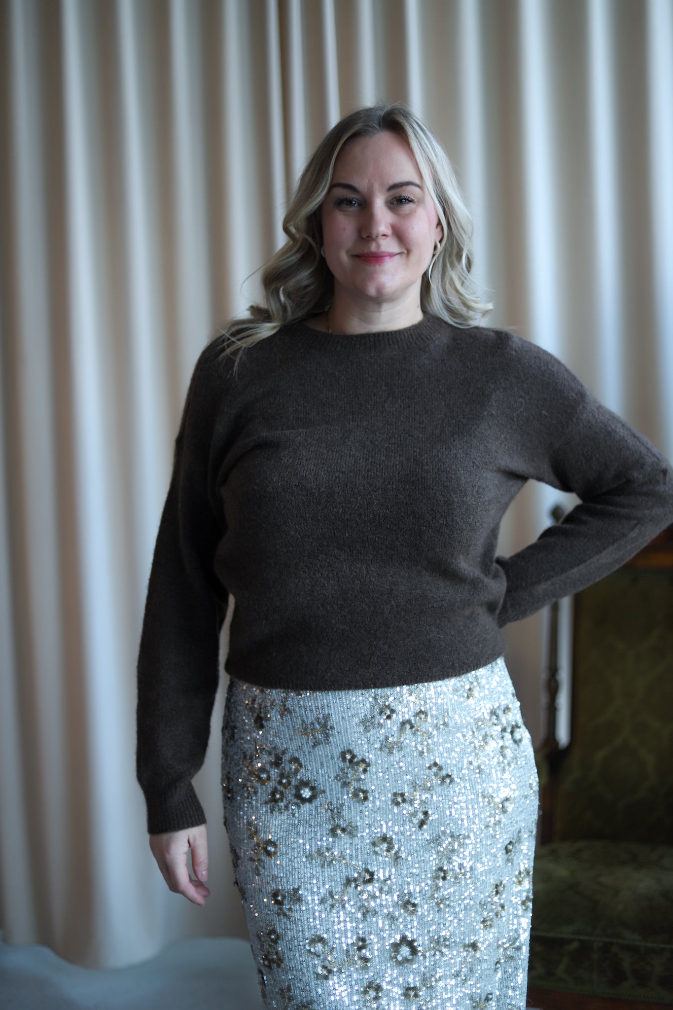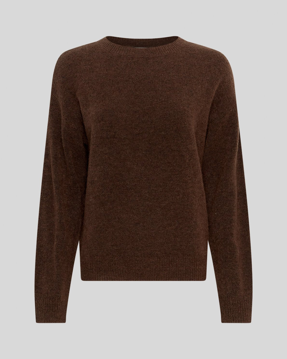 Tidløs strikk i melert mørk brun farge fra Moss Copenhagen. Klassisk modell med rund hals, hoftelengde og lange smale ermer med droppet skulder. Ribbestrikk i hem, mansjett og hals. Et sikkerstikk i garderoben.