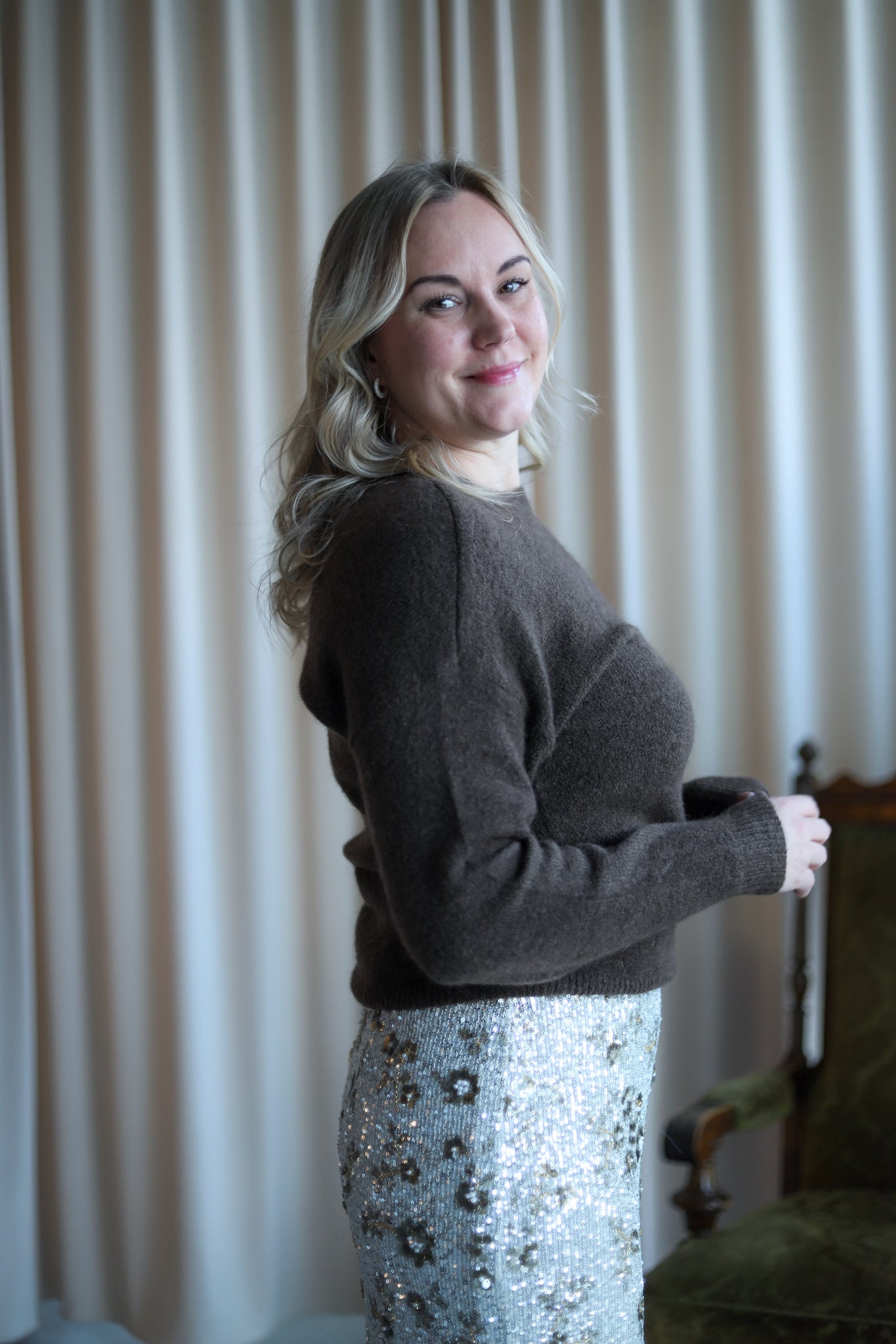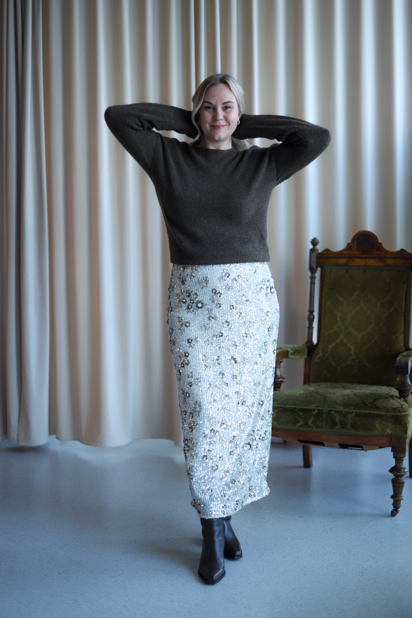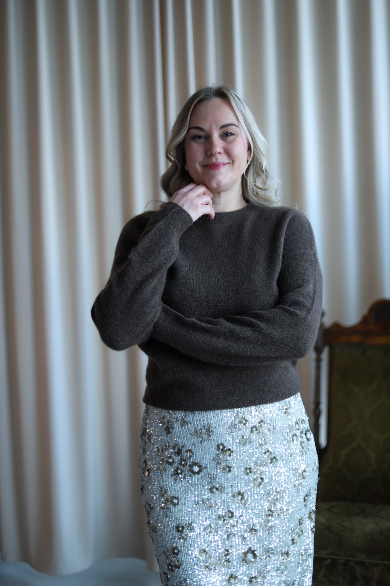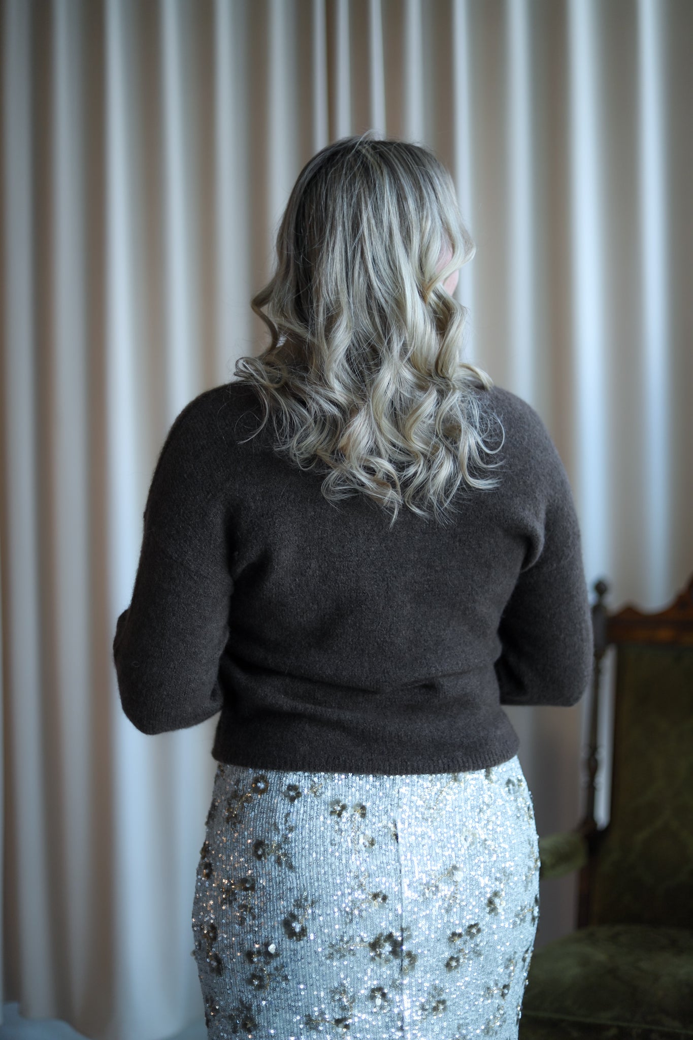 Tidløs strikk i melert mørk brun farge fra Moss Copenhagen. Klassisk modell med rund hals, hoftelengde og lange smale ermer med droppet skulder. Ribbestrikk i hem, mansjett og hals. Et sikkerstikk i garderoben.