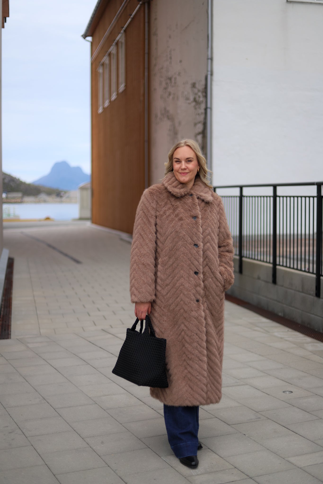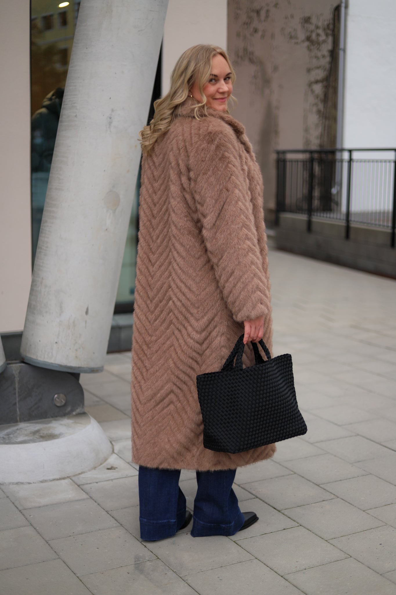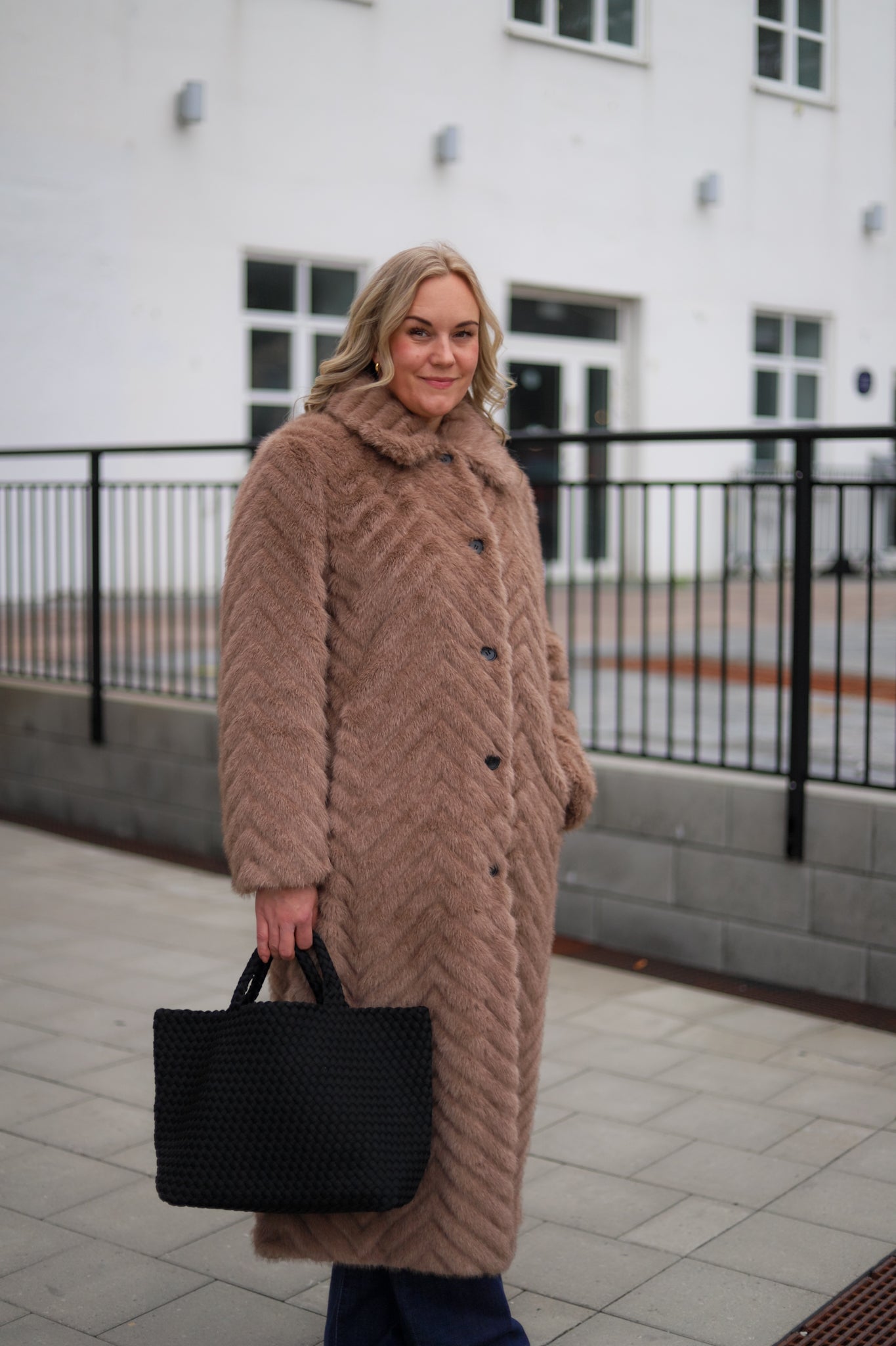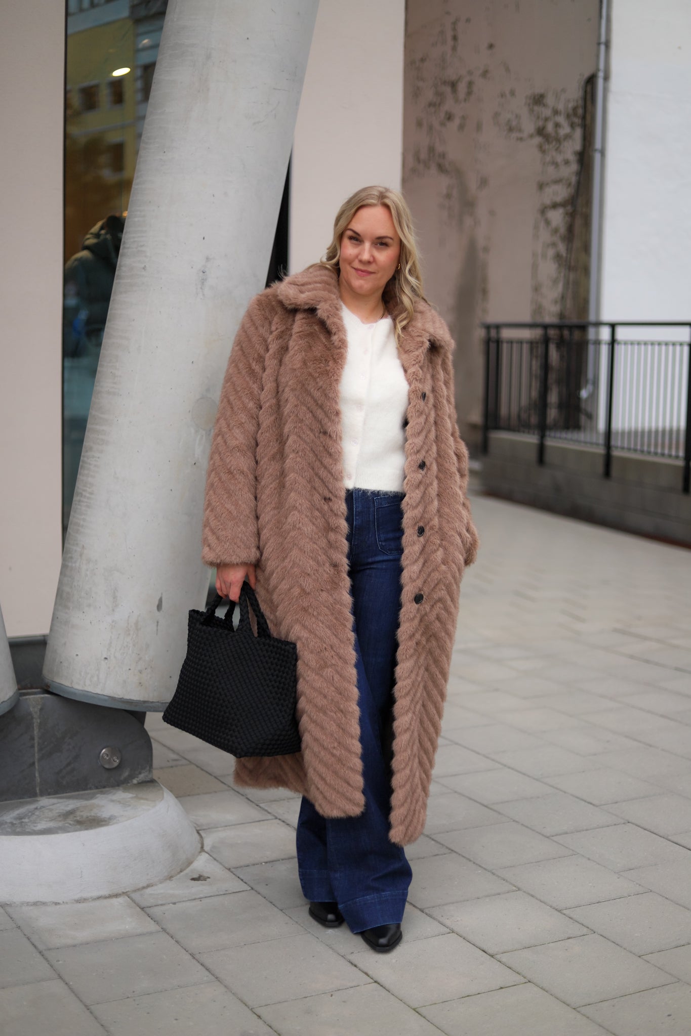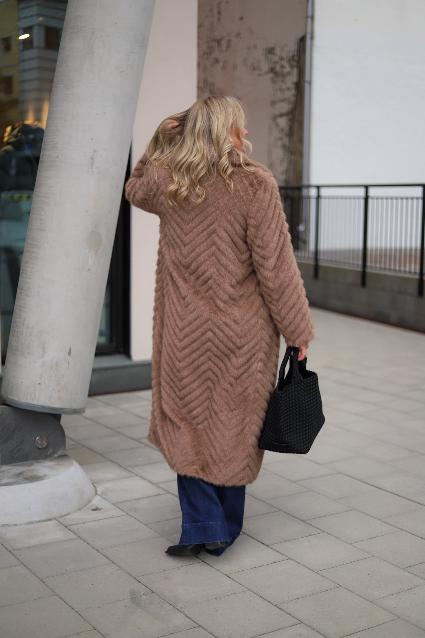 Statement kåpe i fuskepels fra Studio AR. Supermyk fuskepels i delikat camelfarge. Det lekre zigzag-mønsteret skaper en moderne twist på en klassisk kåpe. Modellen er rett og avslappet med lengde midt på leggen. Den har deilig stor krage, knepping med mørke kontrastknapper og to skrålommer i hoftehøyde. Denne luksuriøse fake fur mink skaper en uanstrengt eleganse. Og er like fin over hverdagsantrekk som til fest!