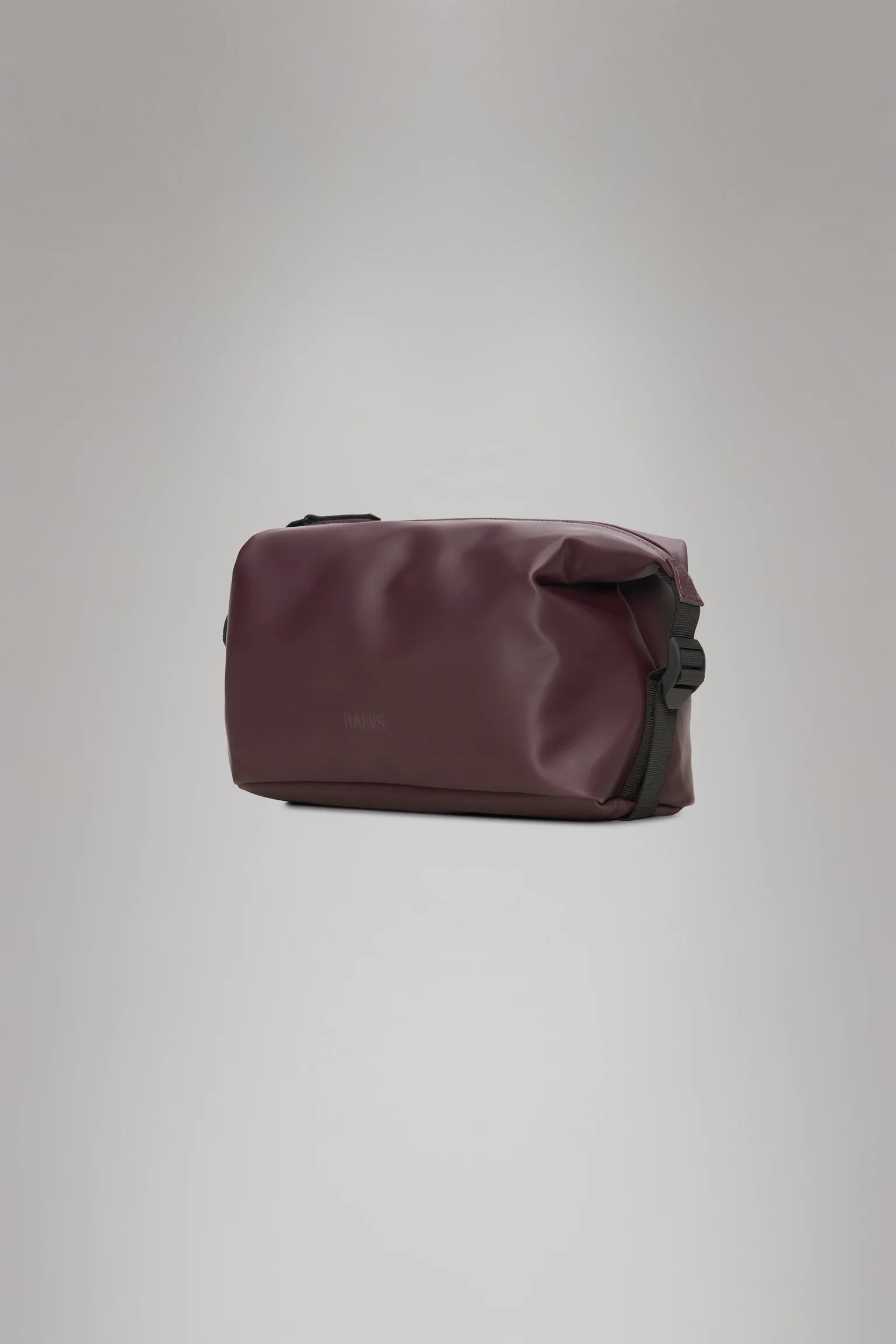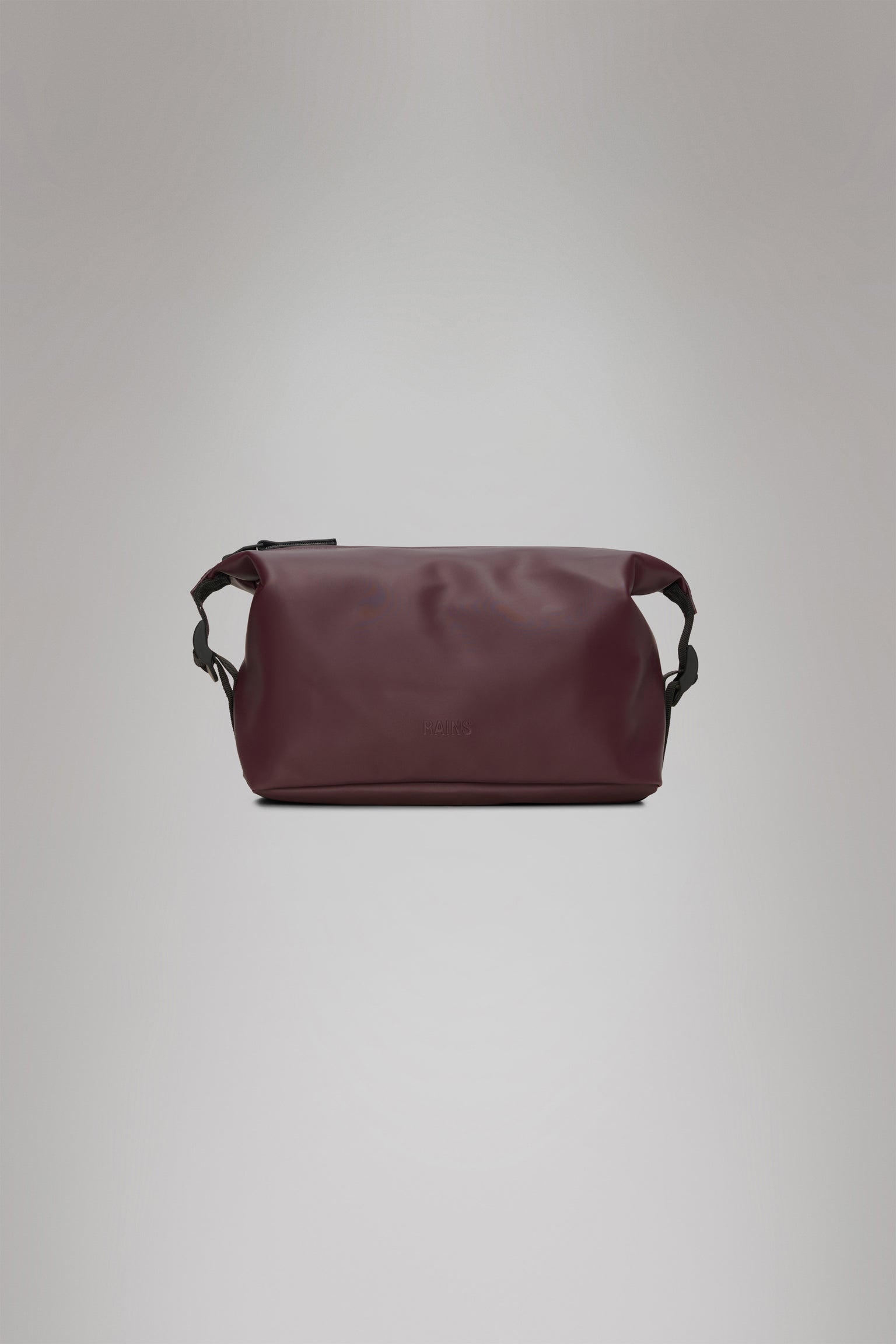 Romslig vanntett toalettmappe fra Rains. Her får du plass til det du måtte trenge. Praktisk flat bunn og glidelås på toppen. Justerbare spenner i sidene for å komprimere størrelsen. Mykt og holdbart materiale med trykket Rains logo. Her i vinrød med sorte detaljer.