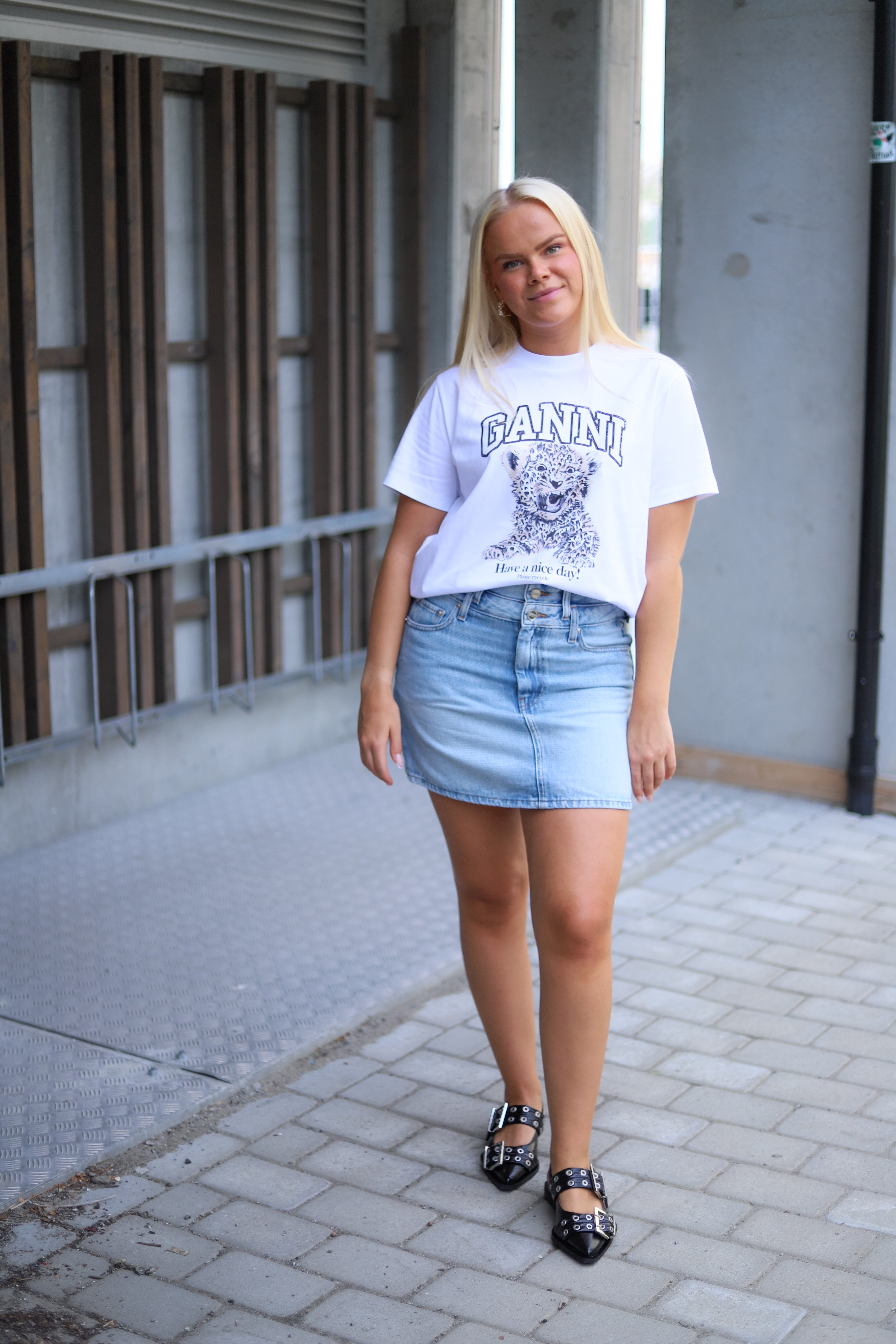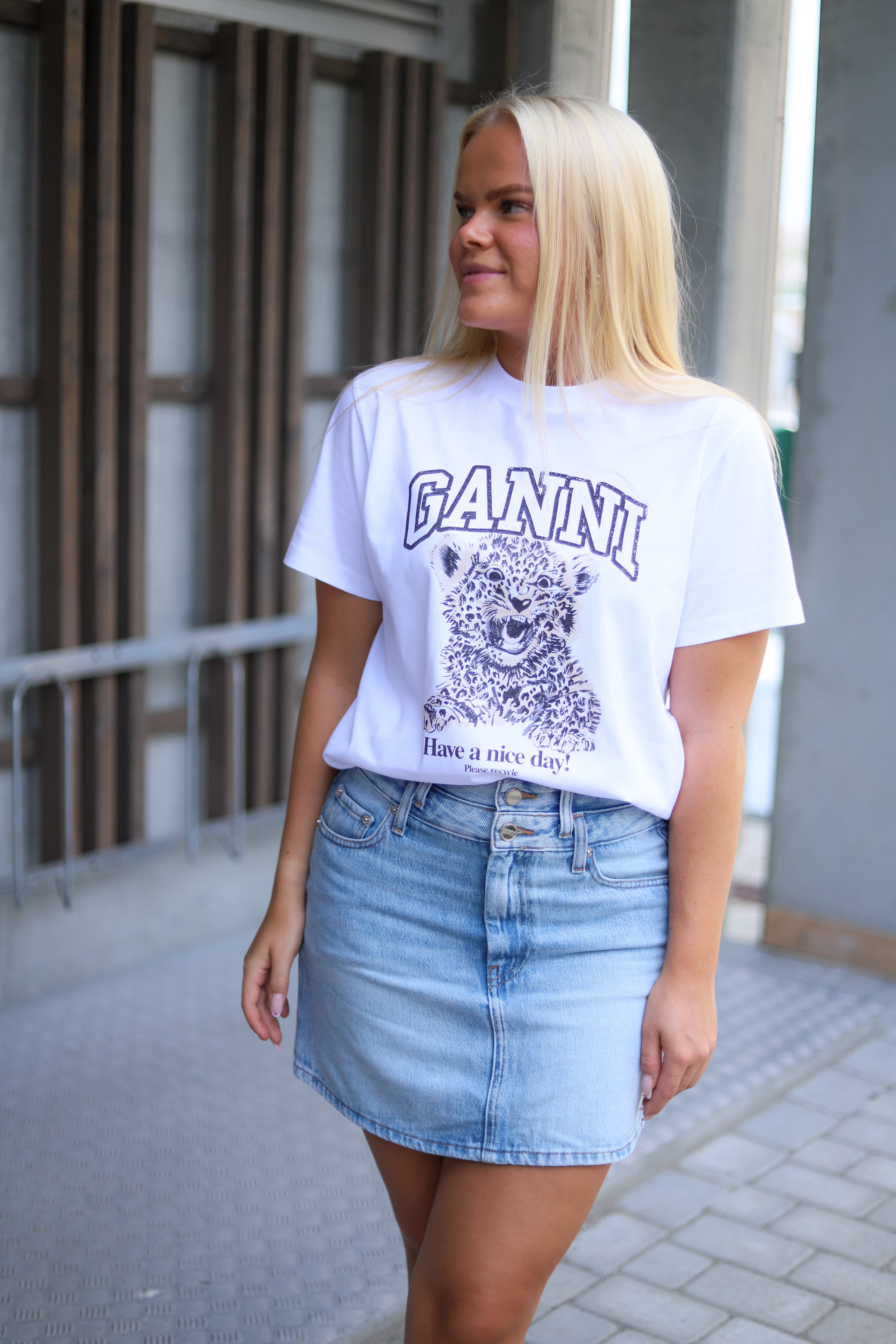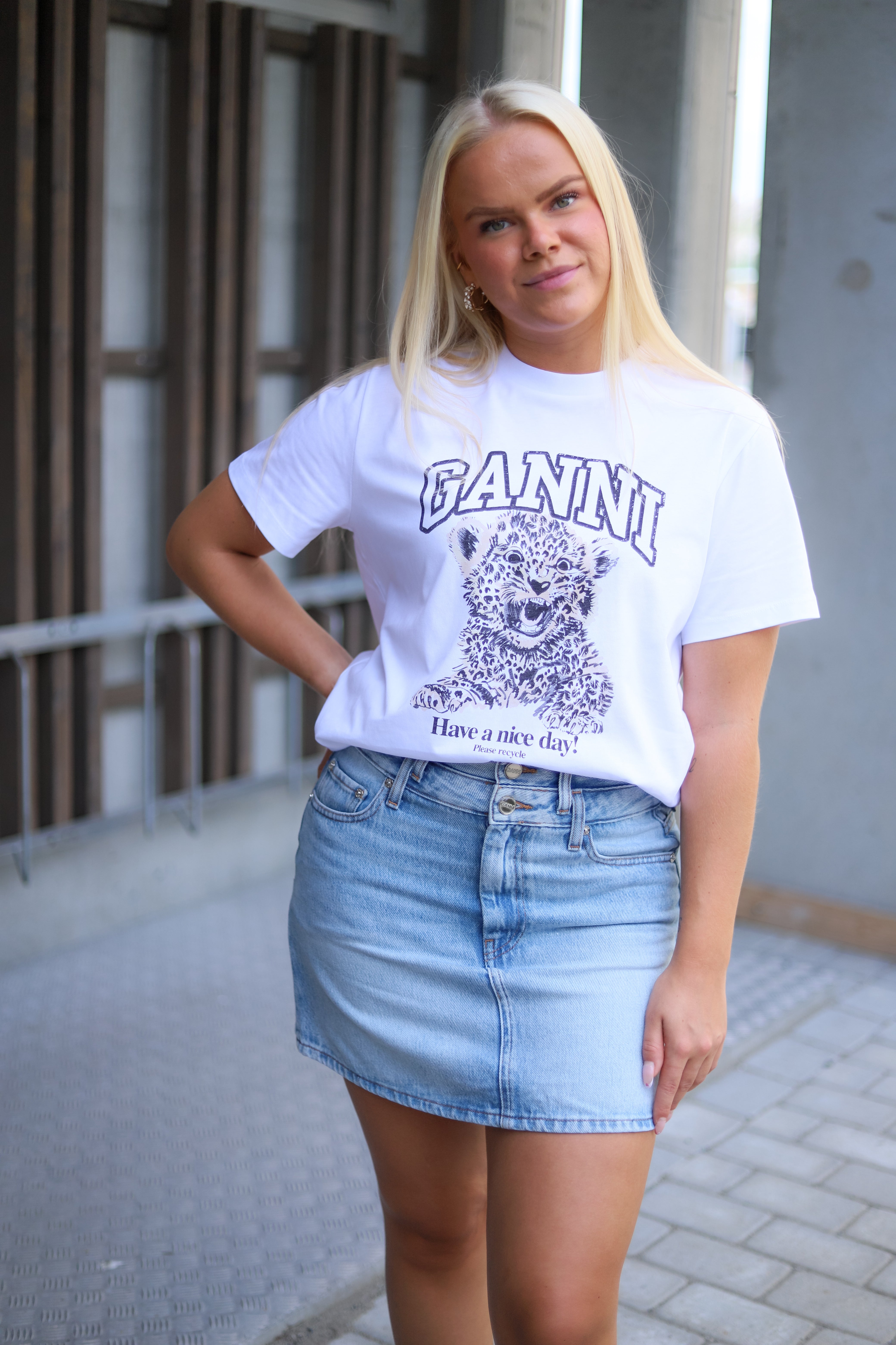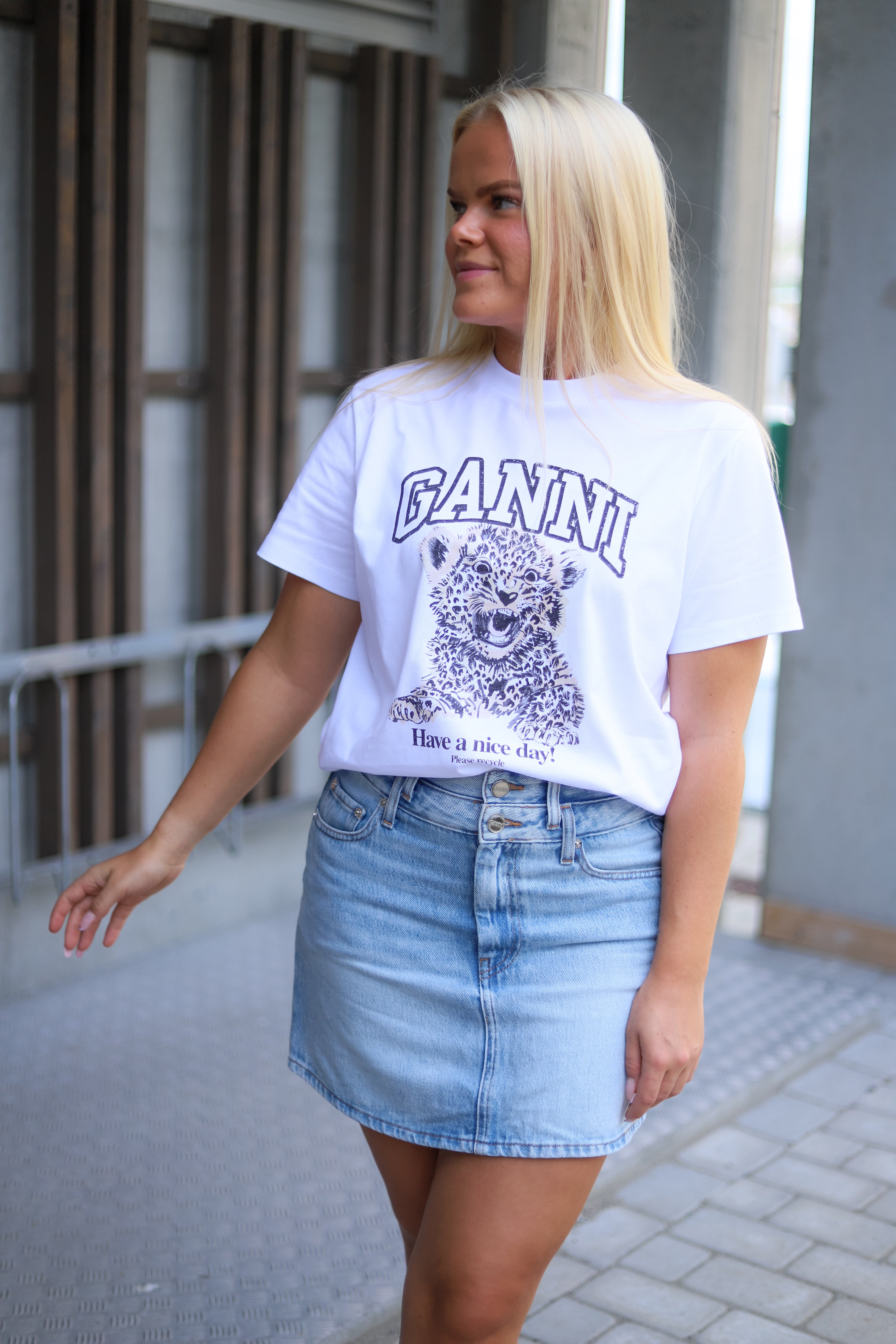 Klassisk hvit tee med grafisk print fra Ganni. Ganni logo og en liten leopard på brystet. T-skjorten er designet for en avslappet rett passform, har rund hals og korte nette ermer.