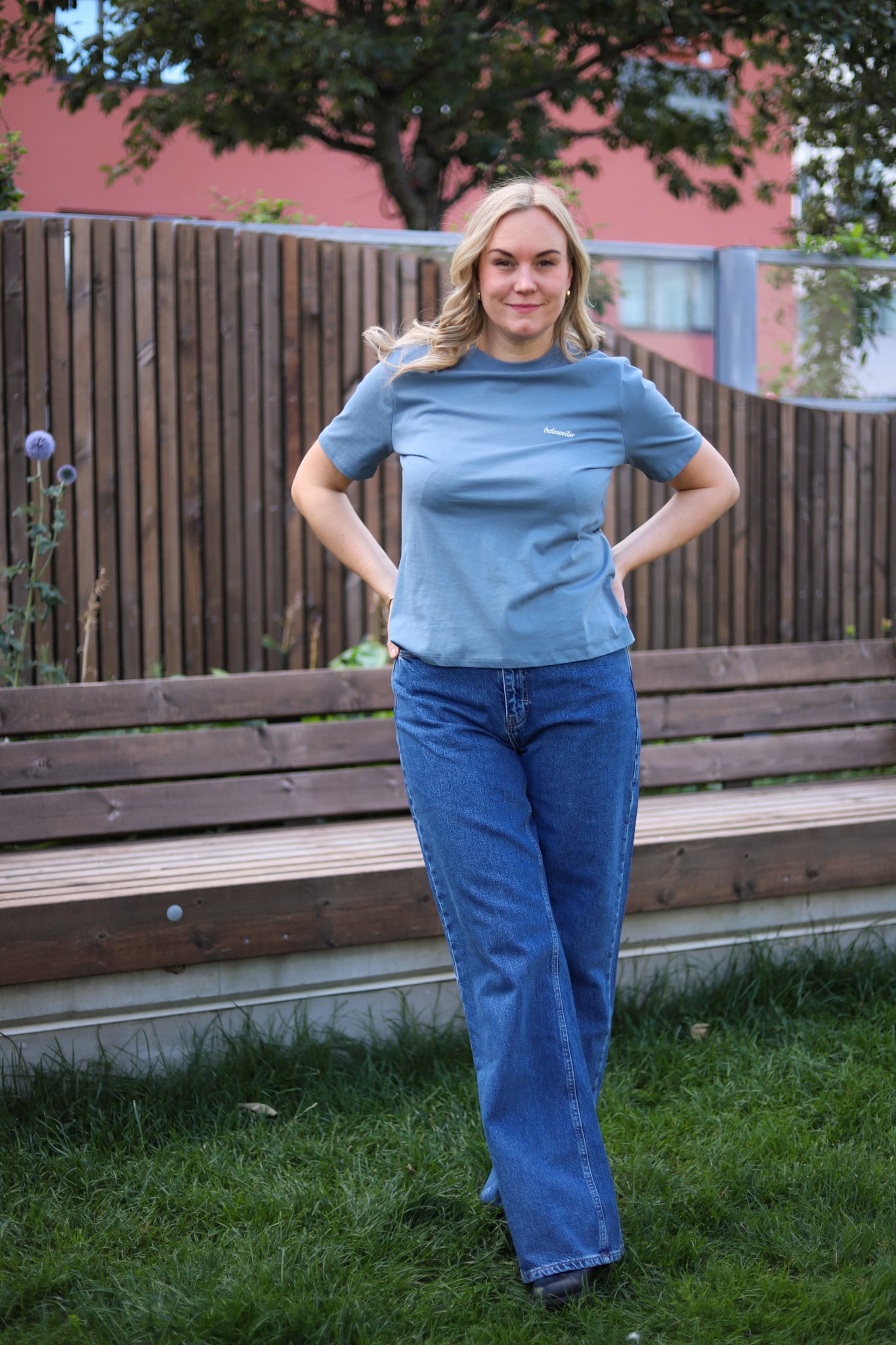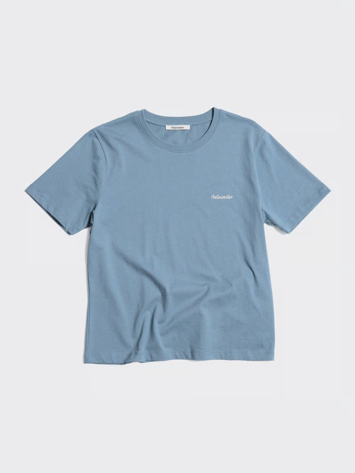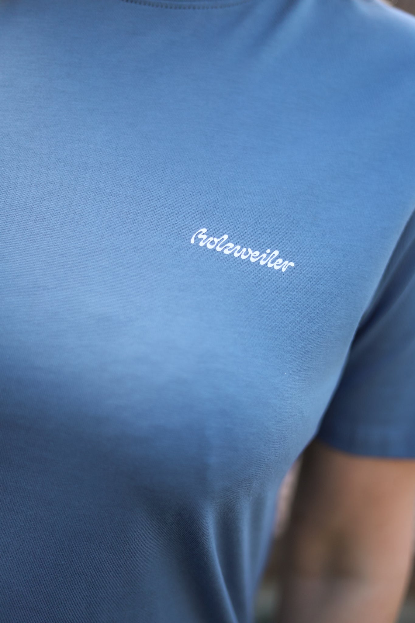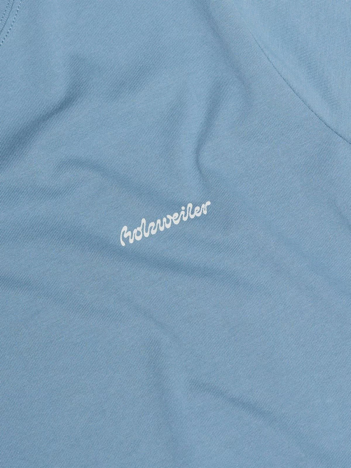 Klassisk t-skjorte i en nydelig blåtone fra Holzweiler. Modellen er rett med rund hals og korte ermer. Hvit liten logo på venstre bryst.