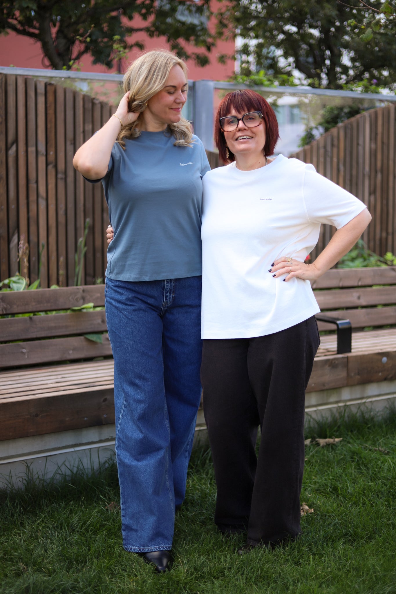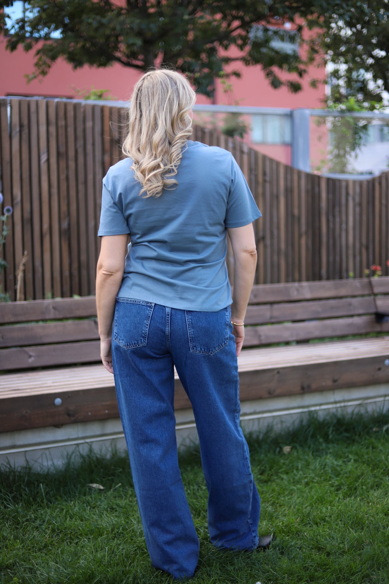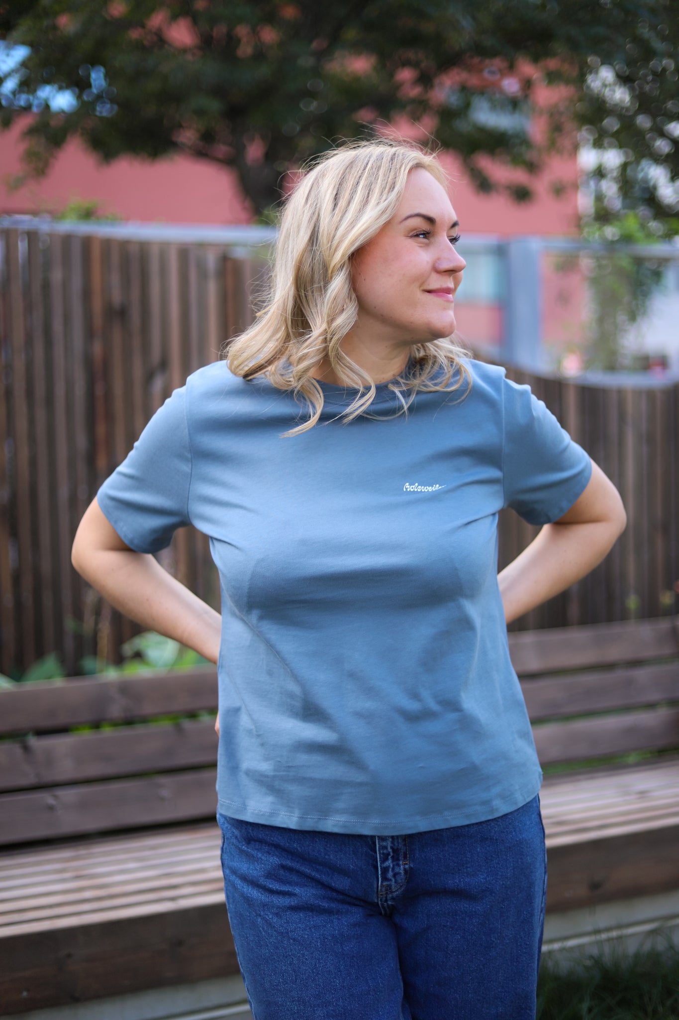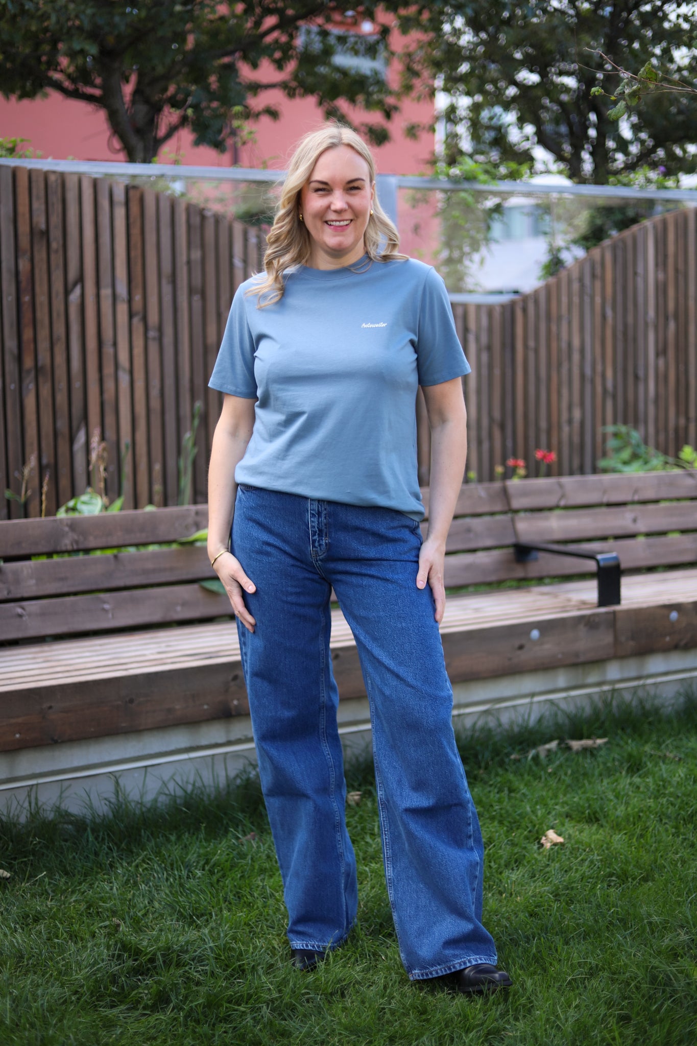 Klassisk t-skjorte i en nydelig blåtone fra Holzweiler. Modellen er rett med rund hals og korte ermer. Hvit liten logo på venstre bryst.
