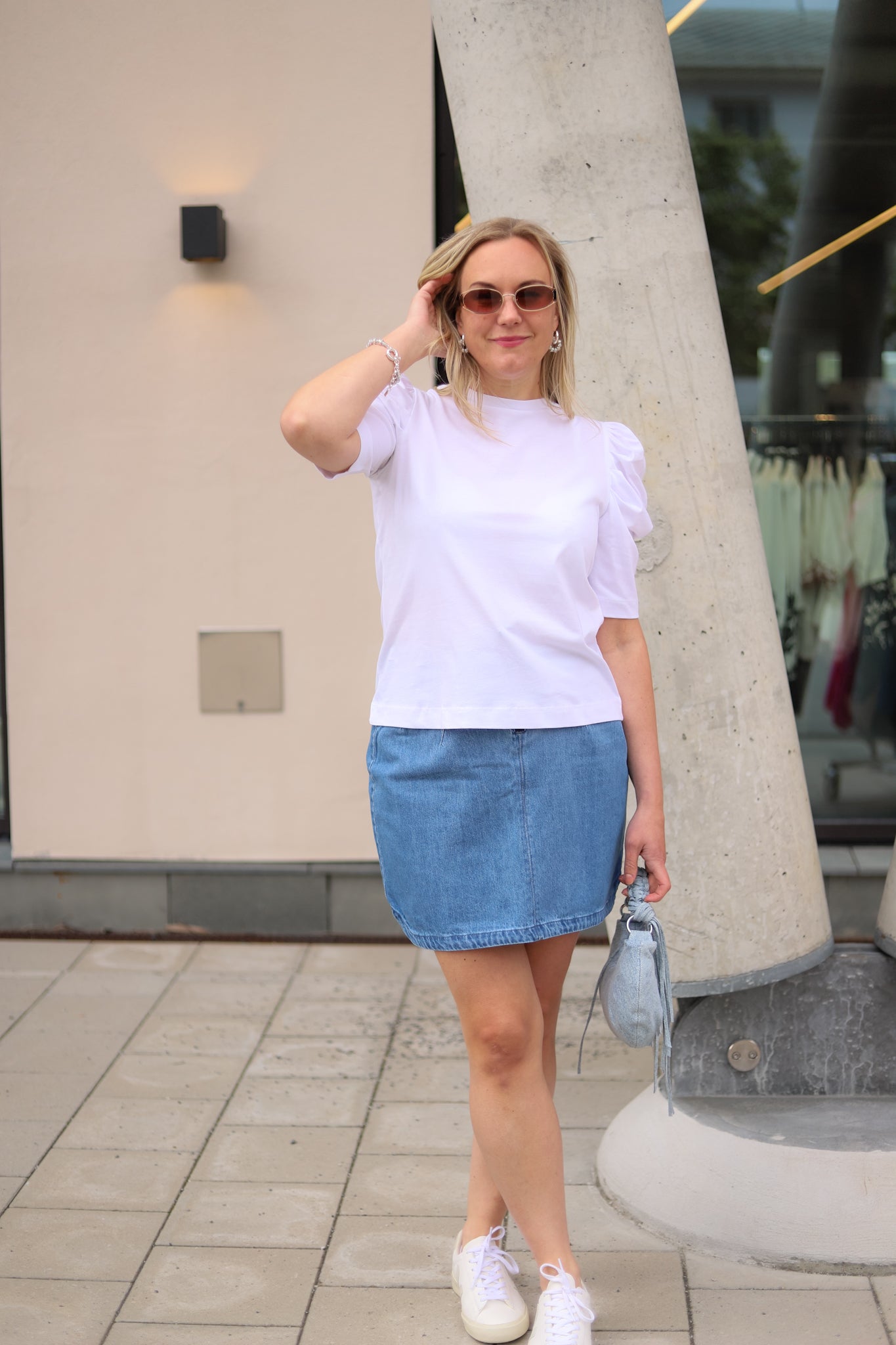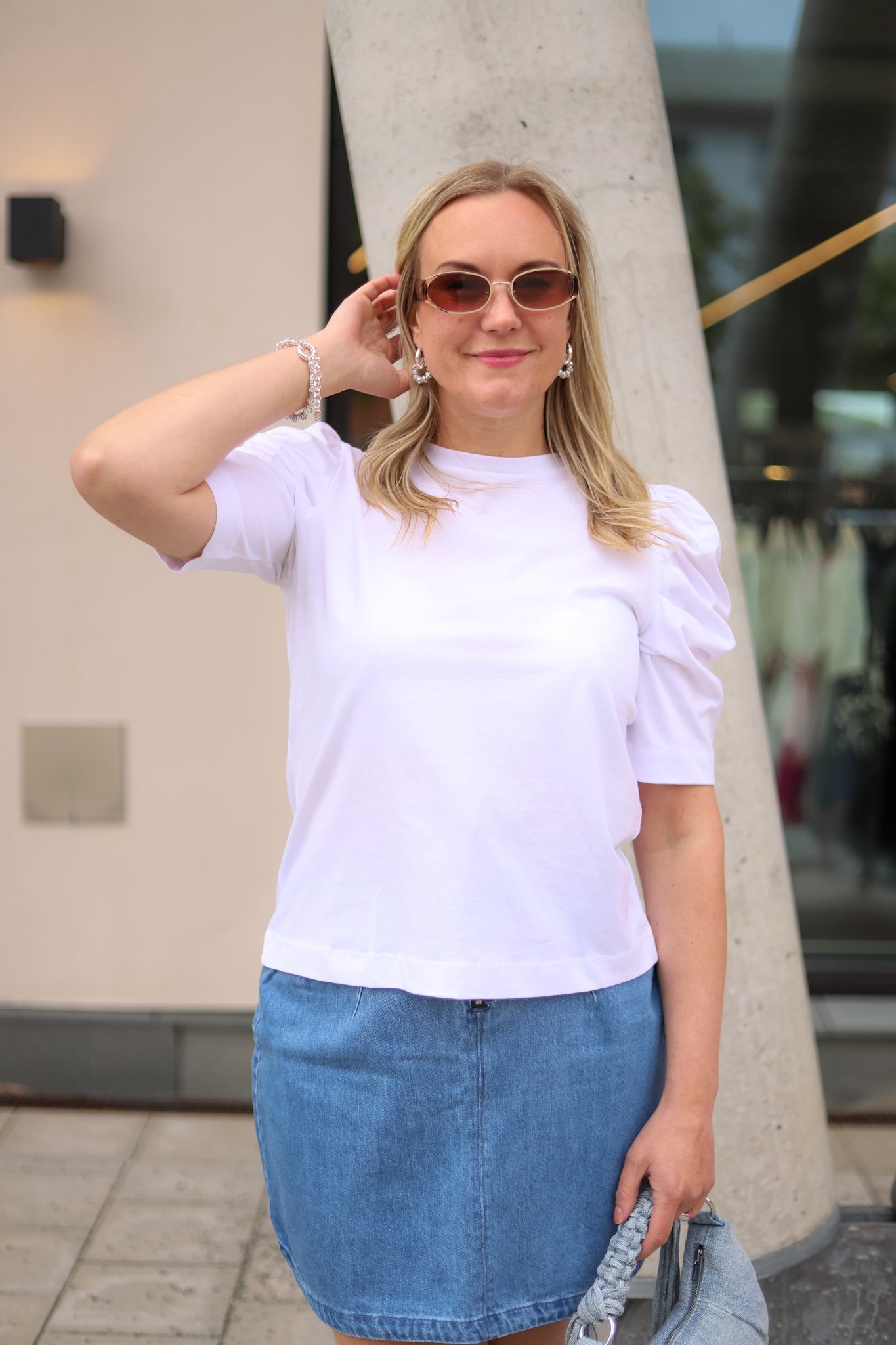 Lekker hvit t-skjorte med elegante puffermer fra Once Untold. Klassisk rett modell med rund hals og pen hoftelengde. En tidløs t-skjorte med feminine ermer som gjør det lille ekstra!