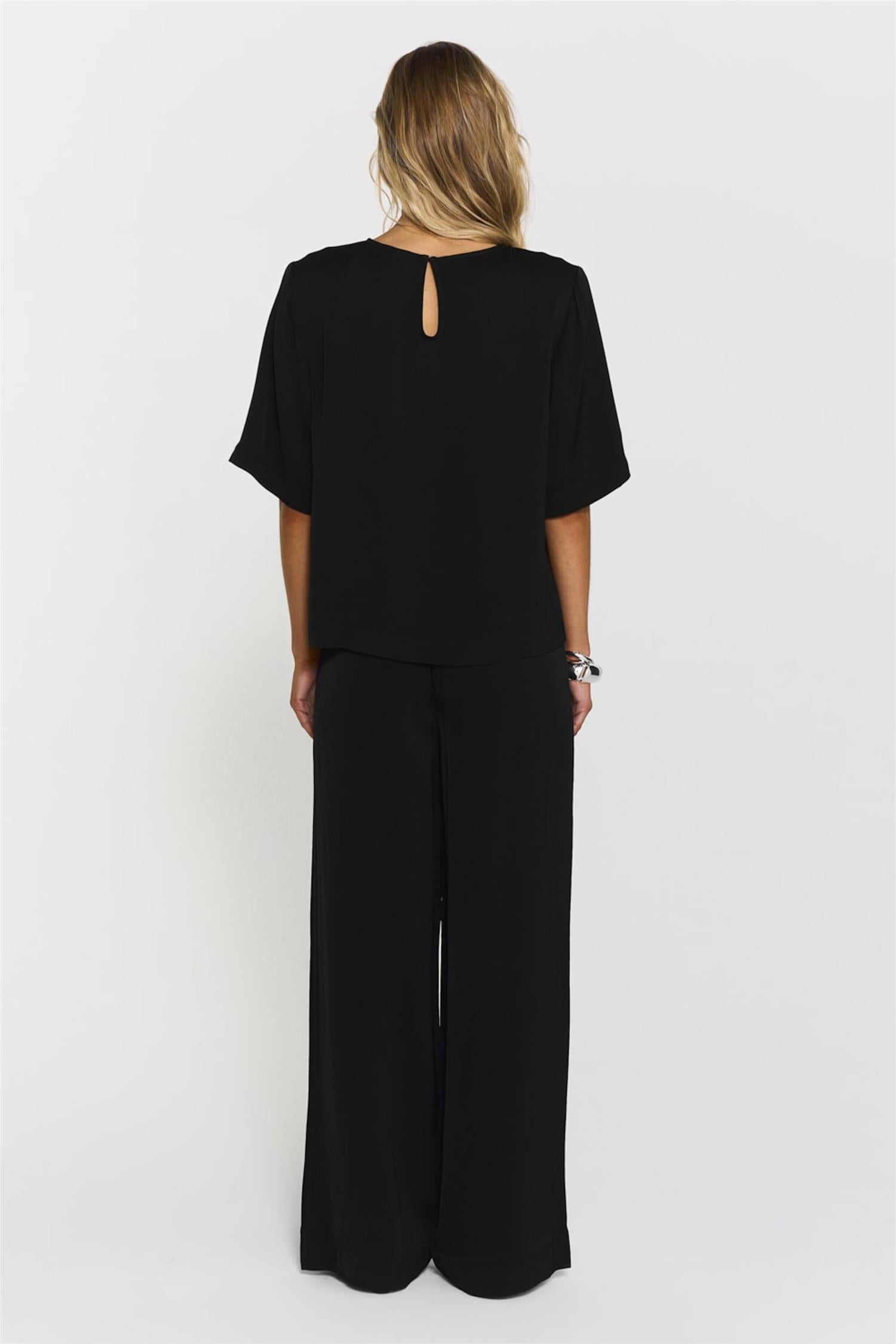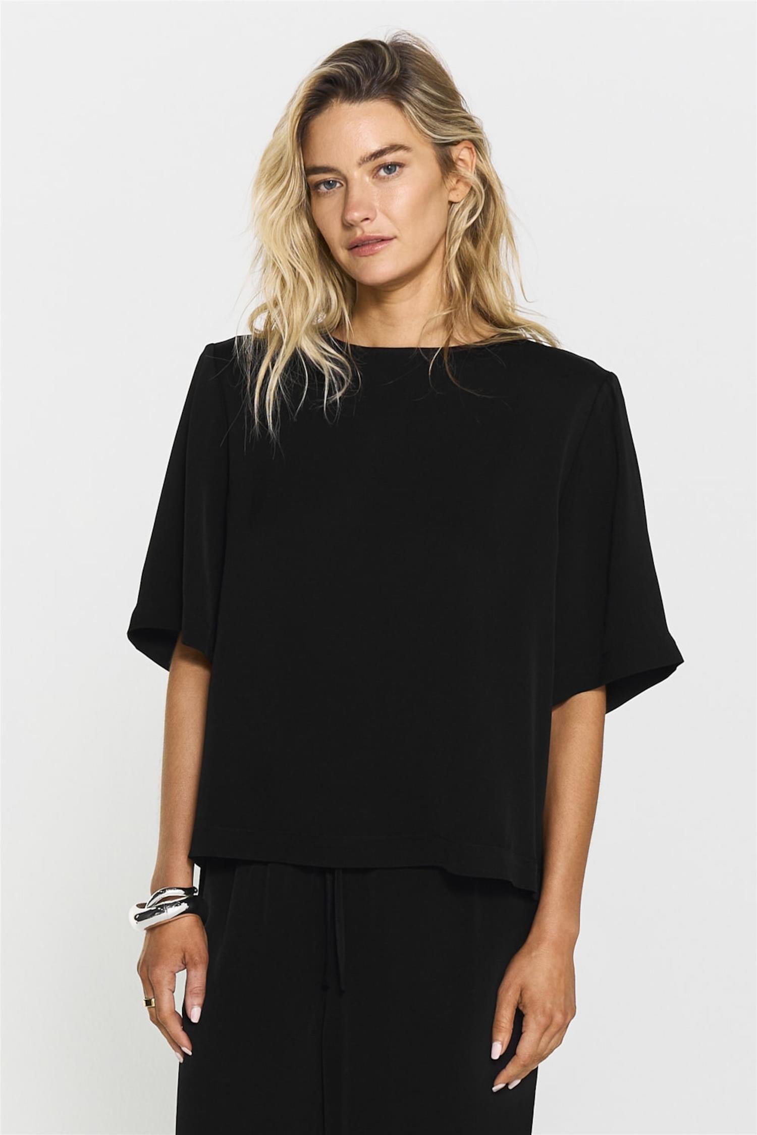 Lekker tee i luksuriøs viskose fra Twist & Tango. Deilig lett og myk satengfinish i tidløs sort. Boxy modell med rund hals og nøkkelhull med en enkel knapp i nakken. Albulange ermer med vidde og pen hoftelengde. En elegant og komfortabel topp i tidløs design.