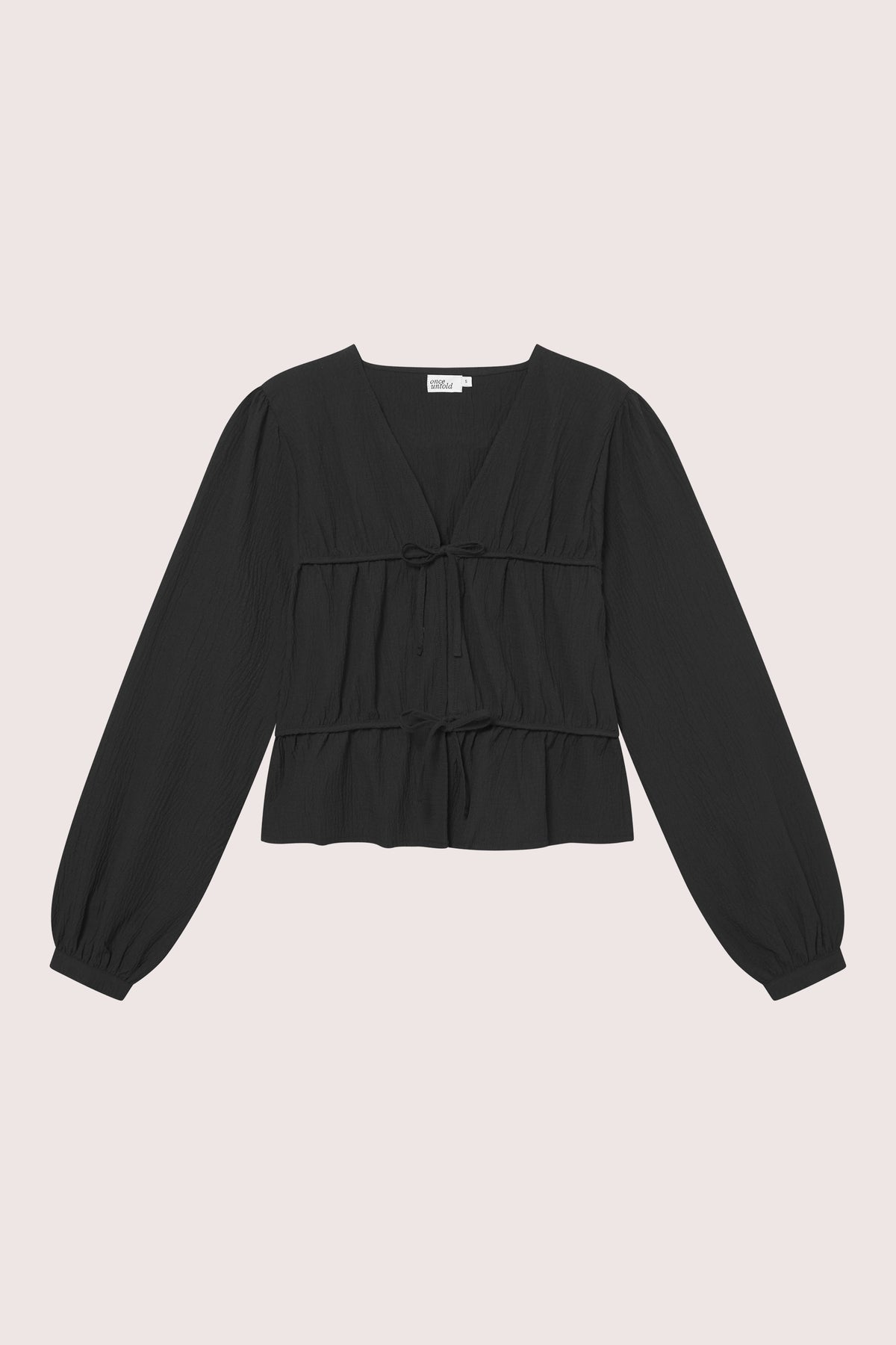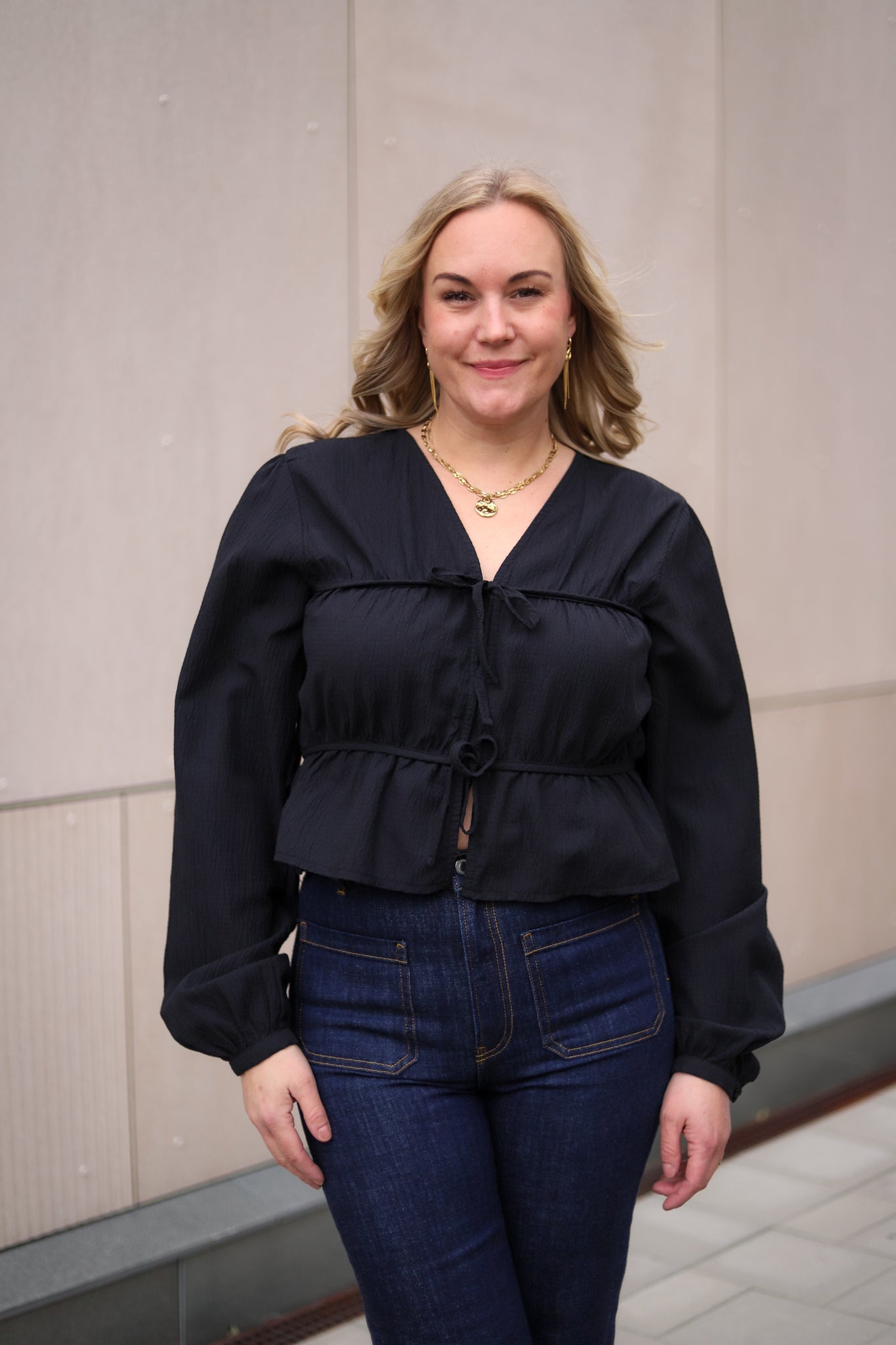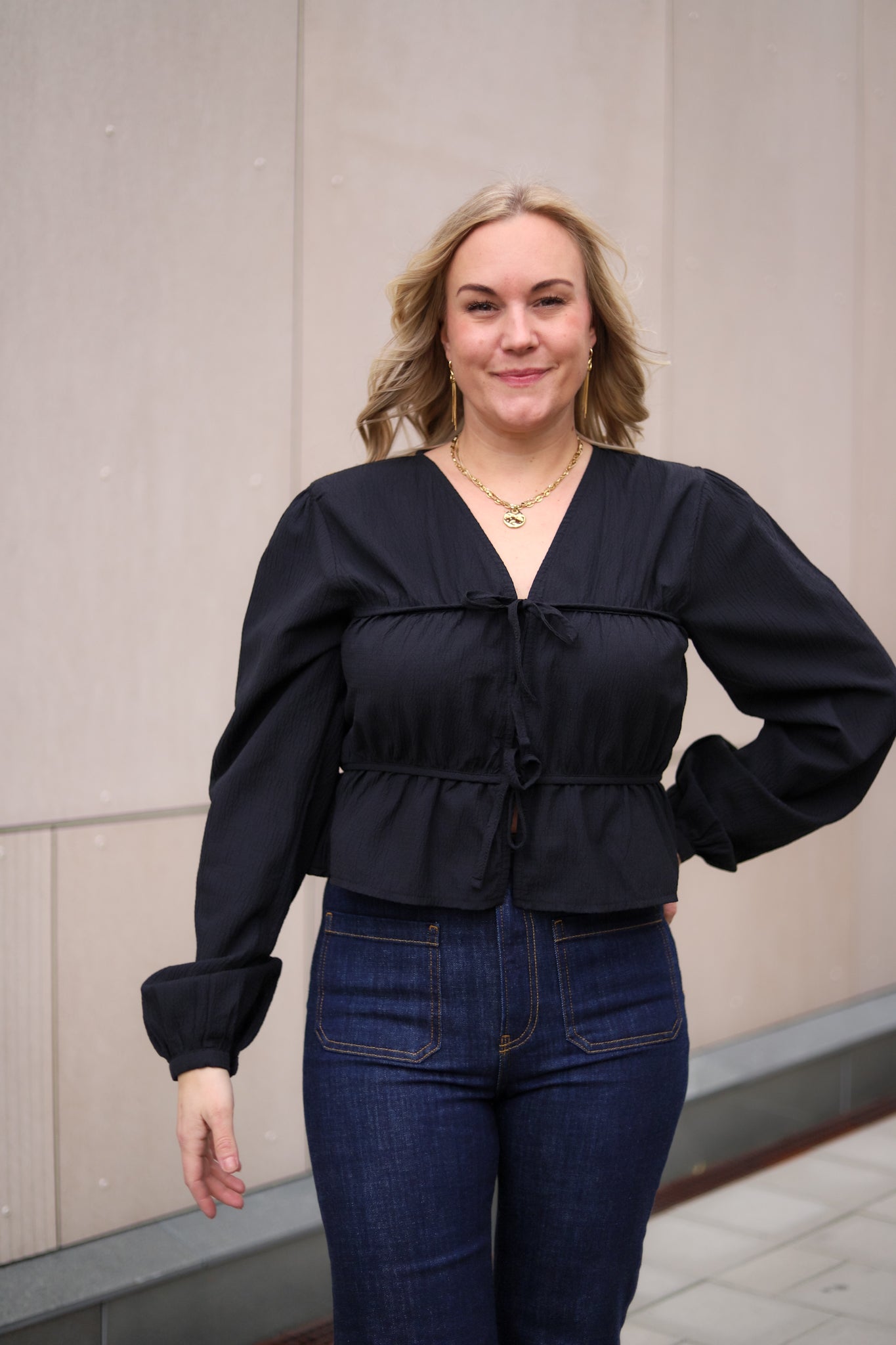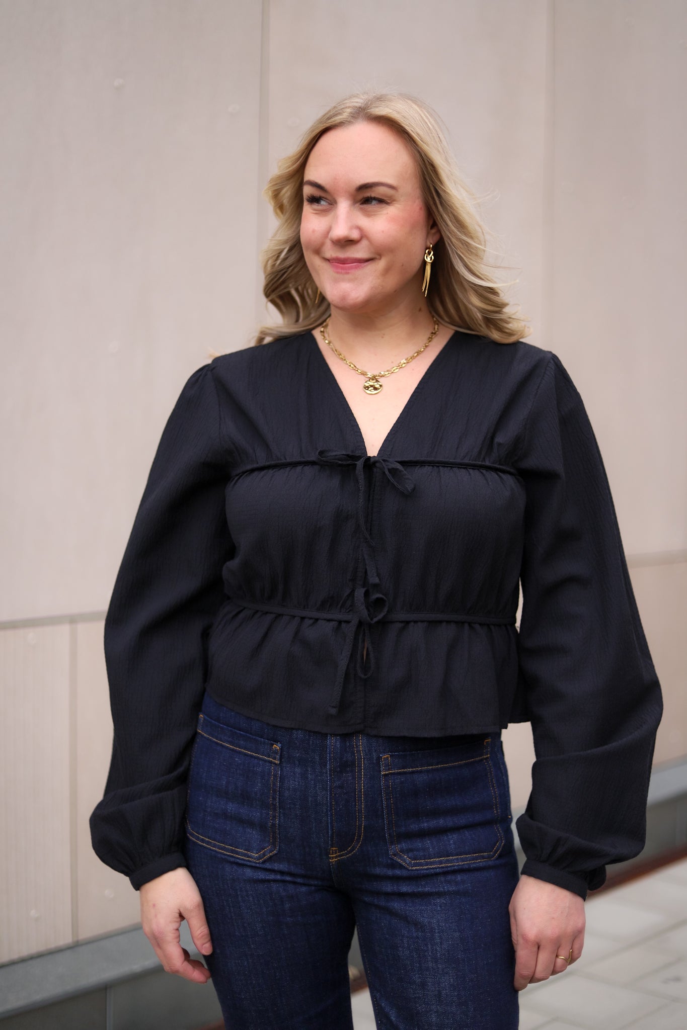 Søt smårutet bluse i klassisk sort fra Once Untold. Modellen er nett med v-hals, lett croppet lengde og knytebånd over brystet og i livet for en feminin fasong. Lange ermer med lett volum og knapper i smal mansjett. Deilig lett og luftig seersucker kvalitet. Den perfekte hverdagsblusen med lekre detaljer.