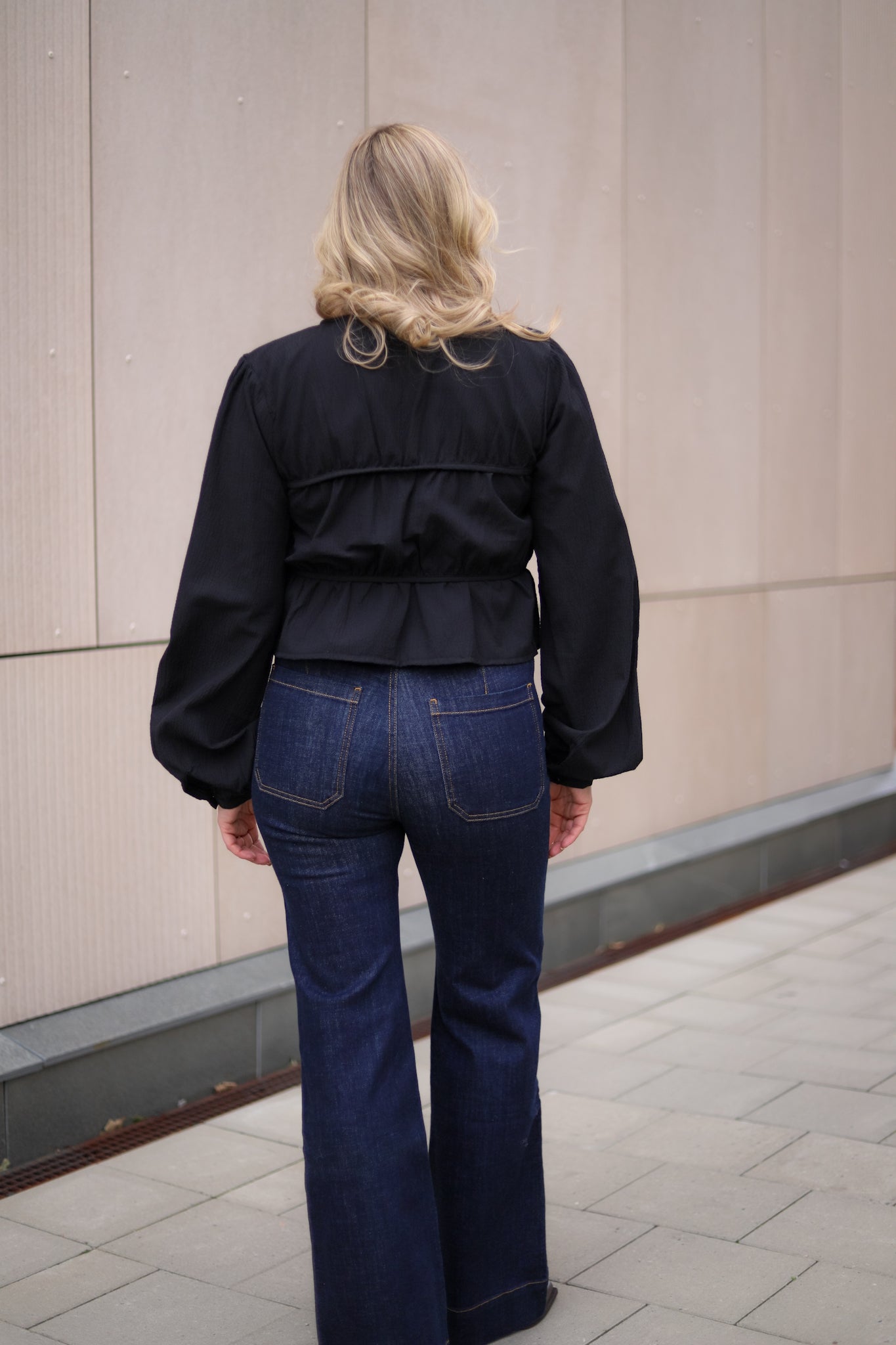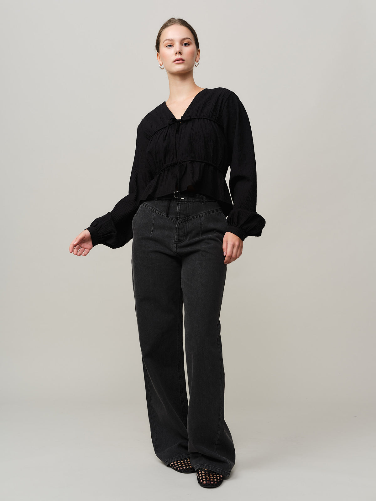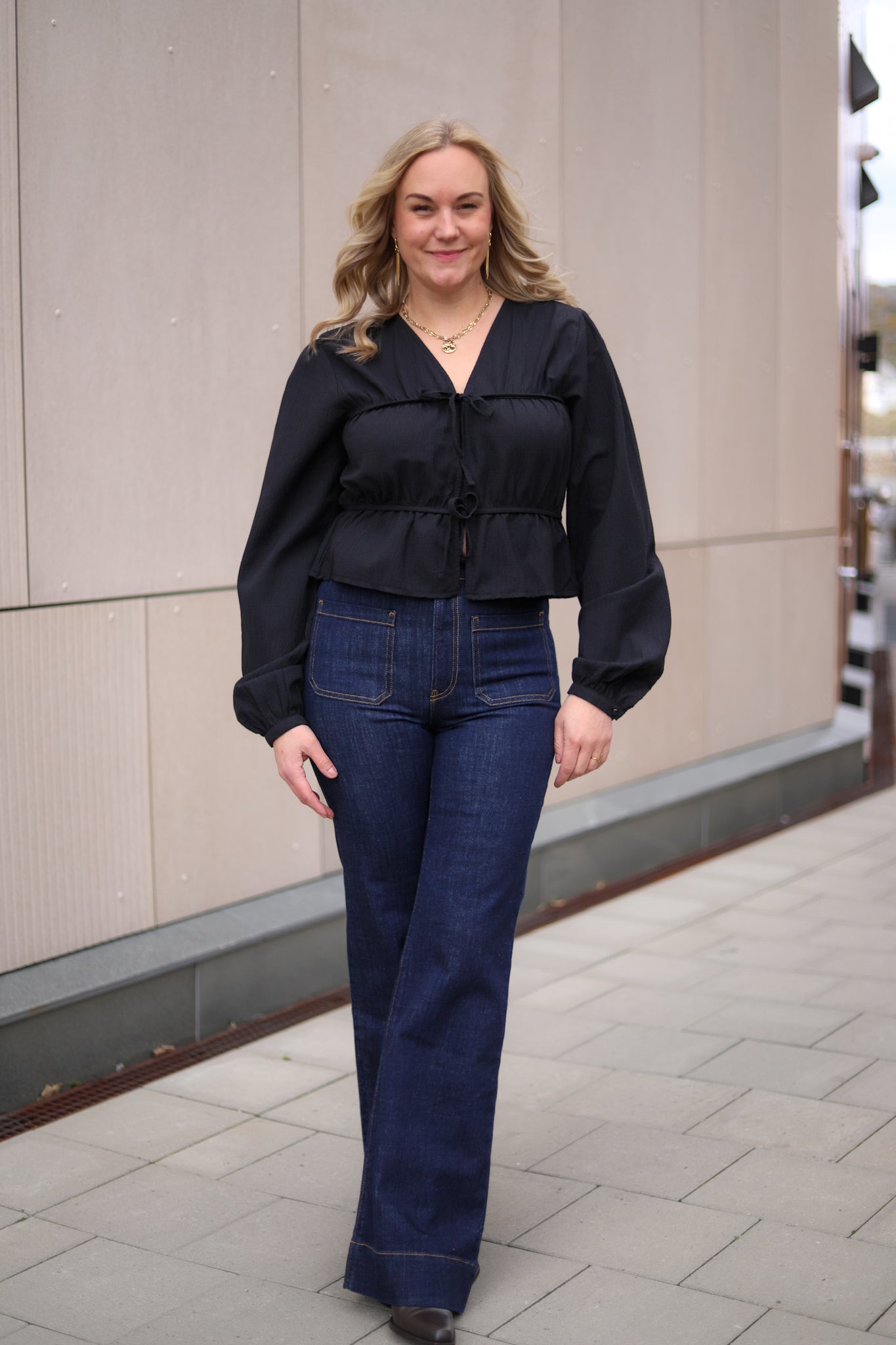 Søt smårutet bluse i klassisk sort fra Once Untold. Modellen er nett med v-hals, lett croppet lengde og knytebånd over brystet og i livet for en feminin fasong. Lange ermer med lett volum og knapper i smal mansjett. Deilig lett og luftig seersucker kvalitet. Den perfekte hverdagsblusen med lekre detaljer.