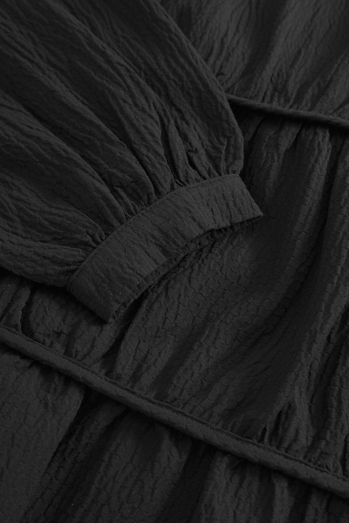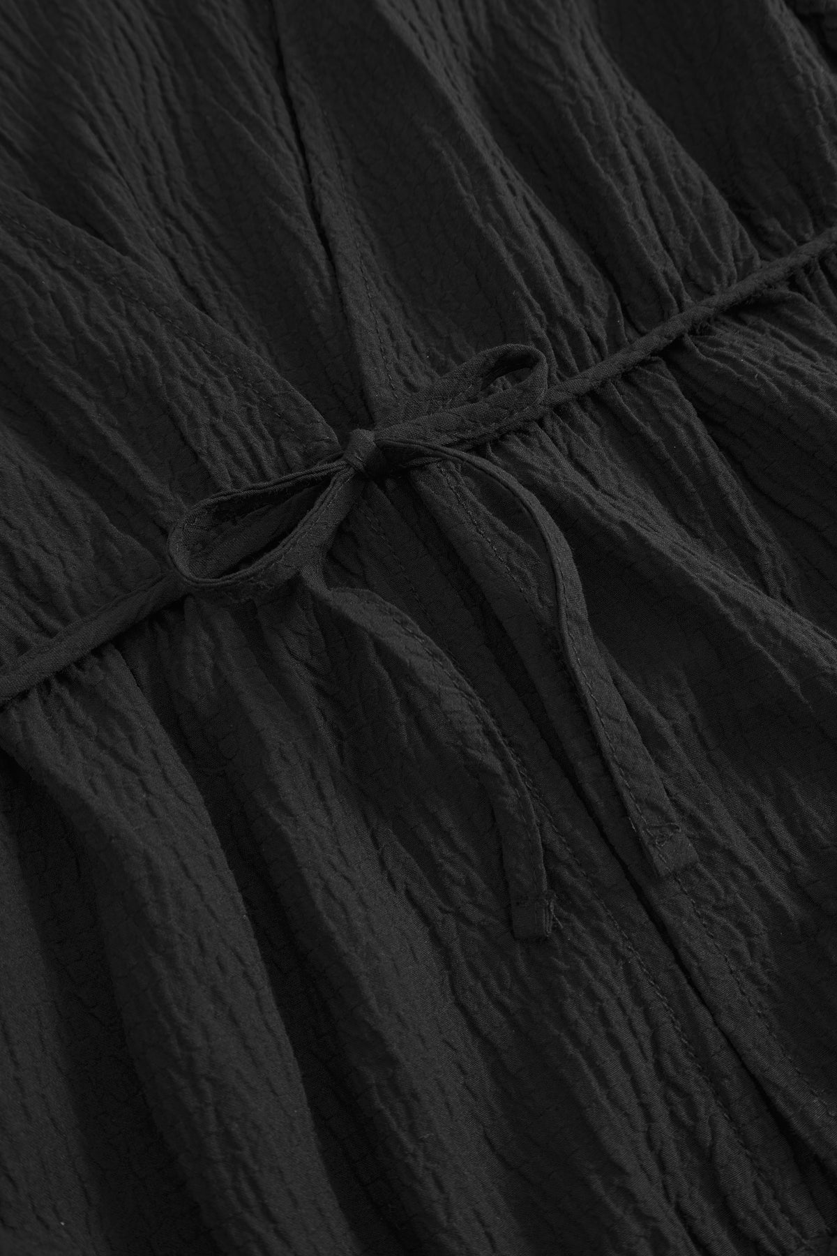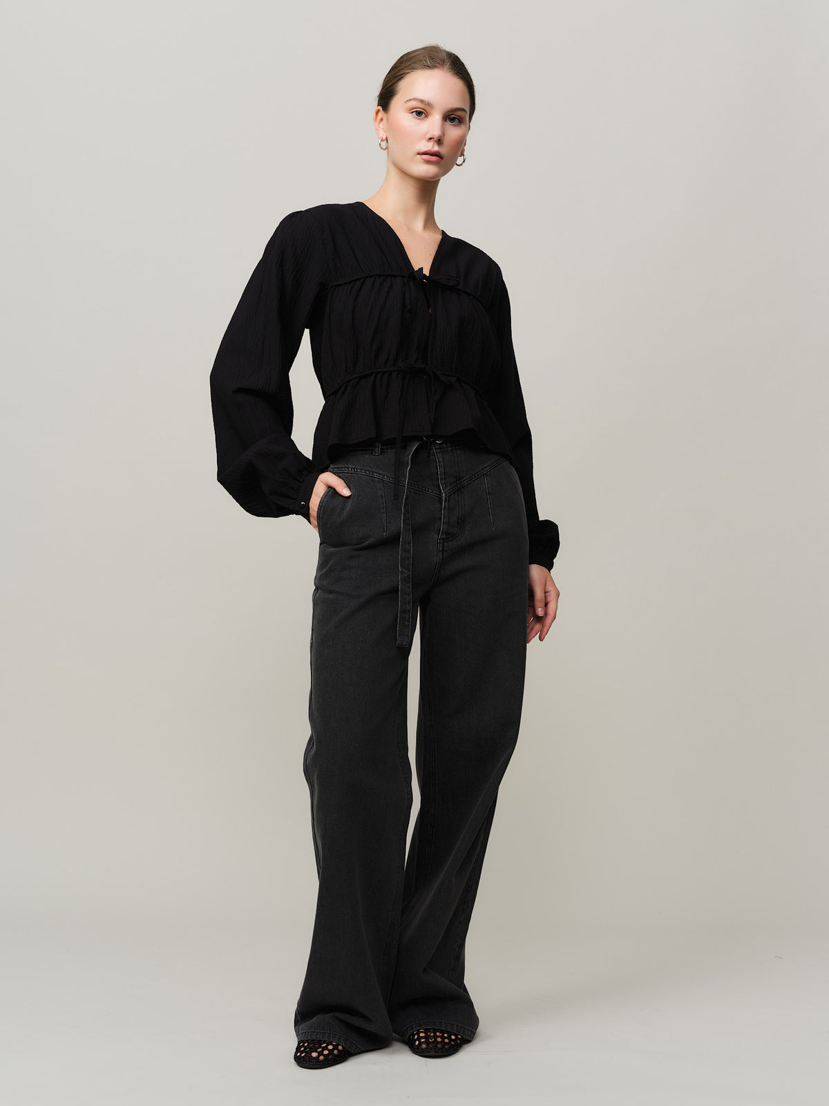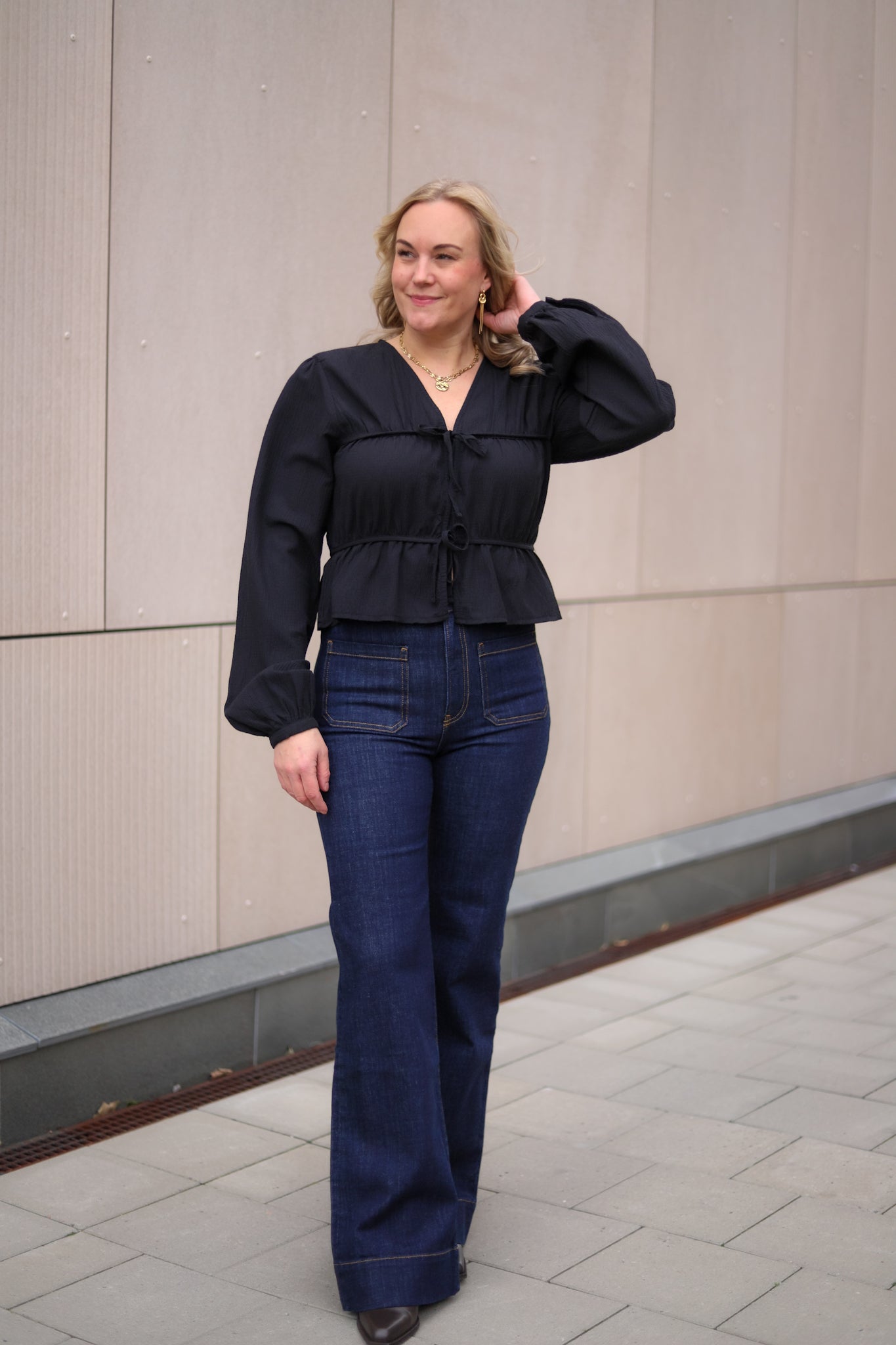 Søt smårutet bluse i klassisk sort fra Once Untold. Modellen er nett med v-hals, lett croppet lengde og knytebånd over brystet og i livet for en feminin fasong. Lange ermer med lett volum og knapper i smal mansjett. Deilig lett og luftig seersucker kvalitet. Den perfekte hverdagsblusen med lekre detaljer.