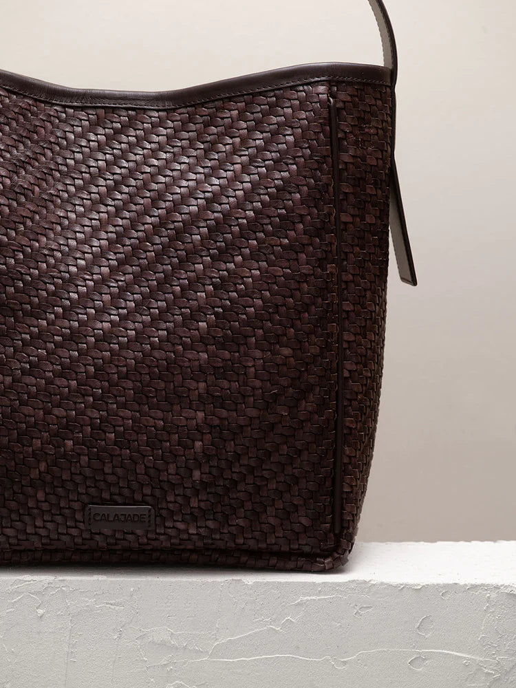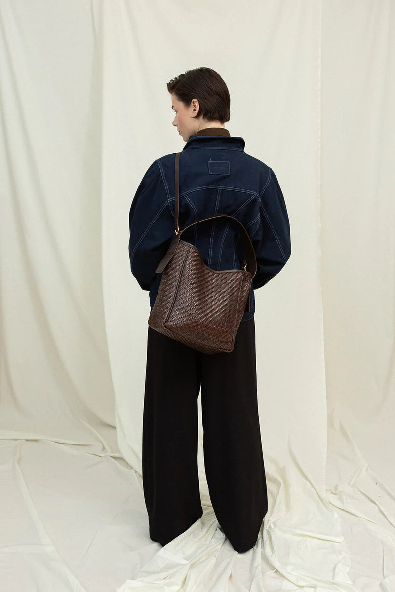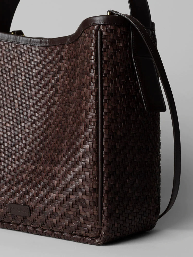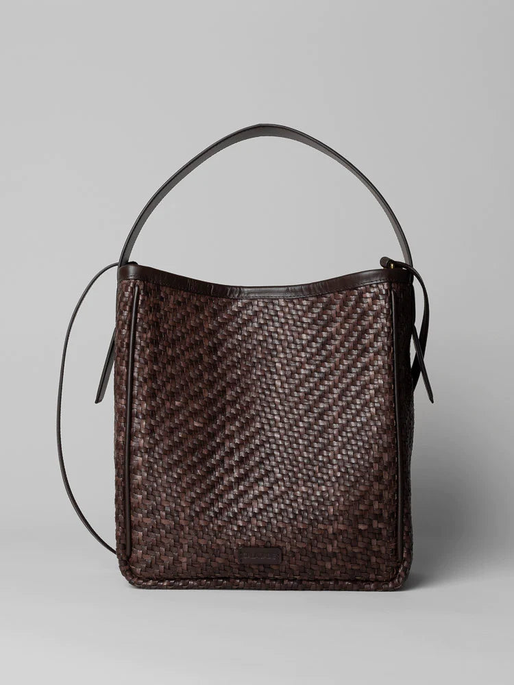 Iwa er tidløs og uanstrengt modell, men samtidig er den et blikkfang med sin vakre vevestruktur i lær og rette fasong. Den perfekte størrelsen for hverdagslige nødvendigheter. Innsiden inneholder en slip-in lomme og en hempe for å lukke vesken. Iwa har en bred skulderrem og en smal lang veskestropp. Her i en nydelig mørk brun skinnkvalitet.