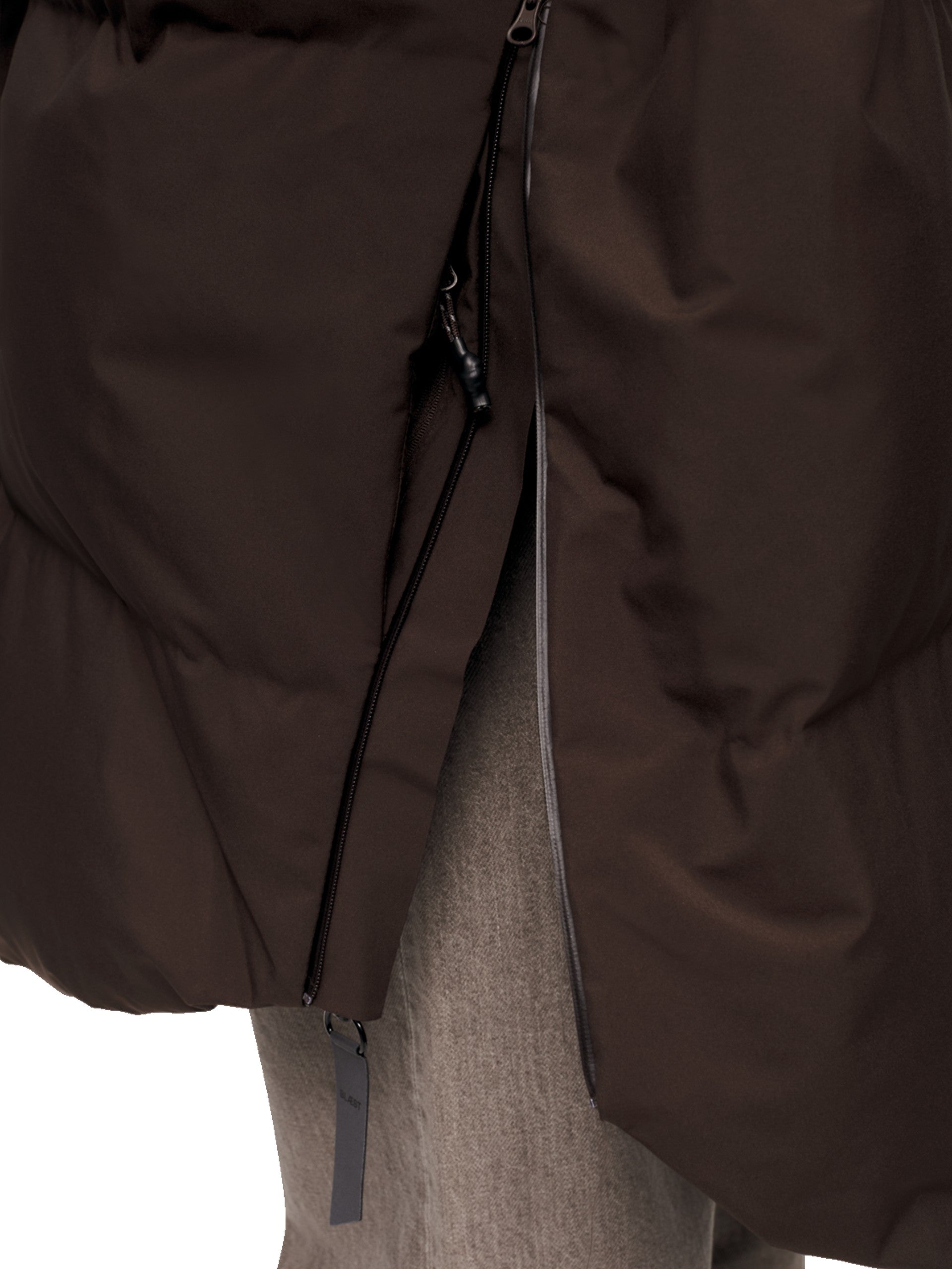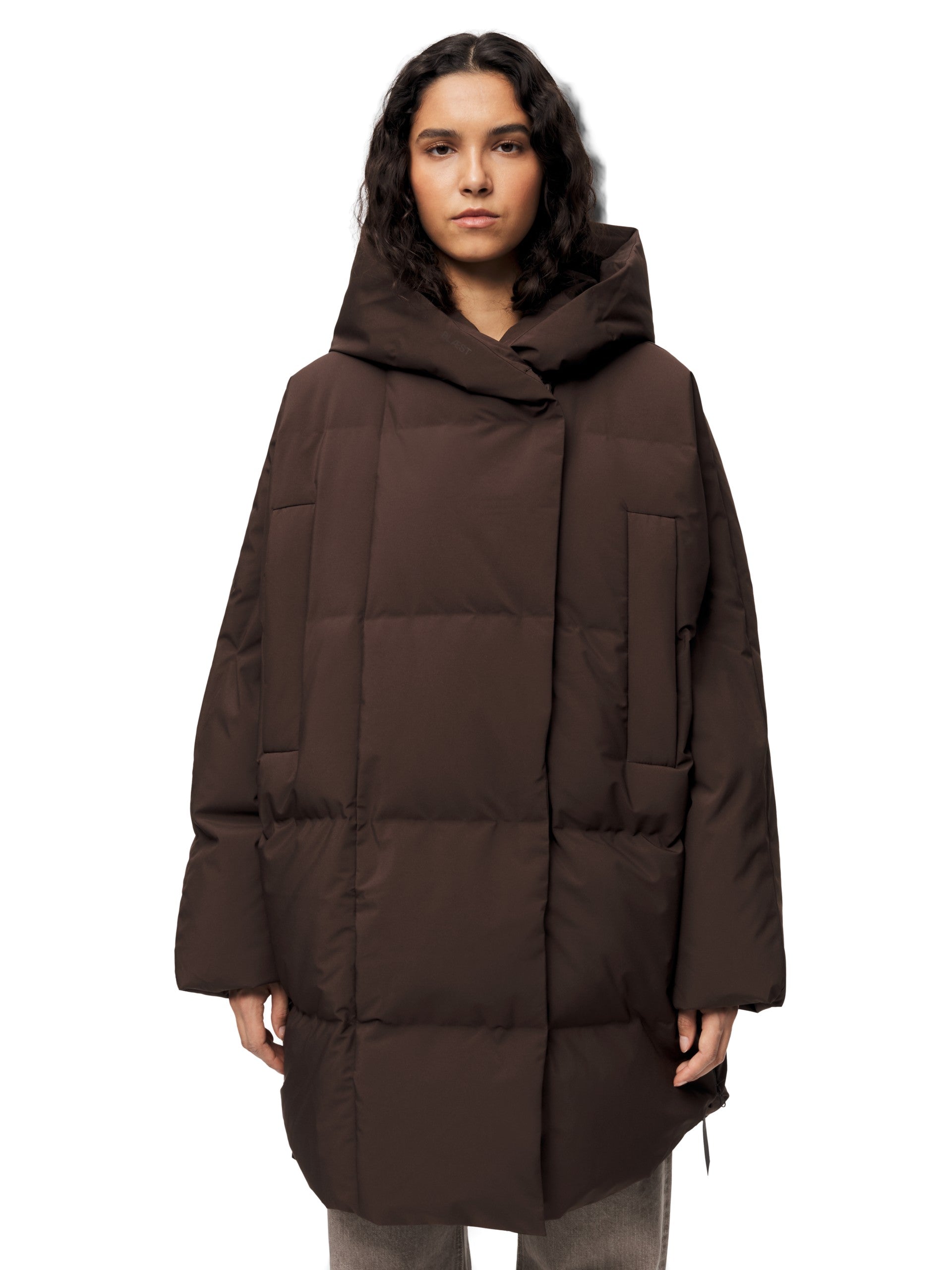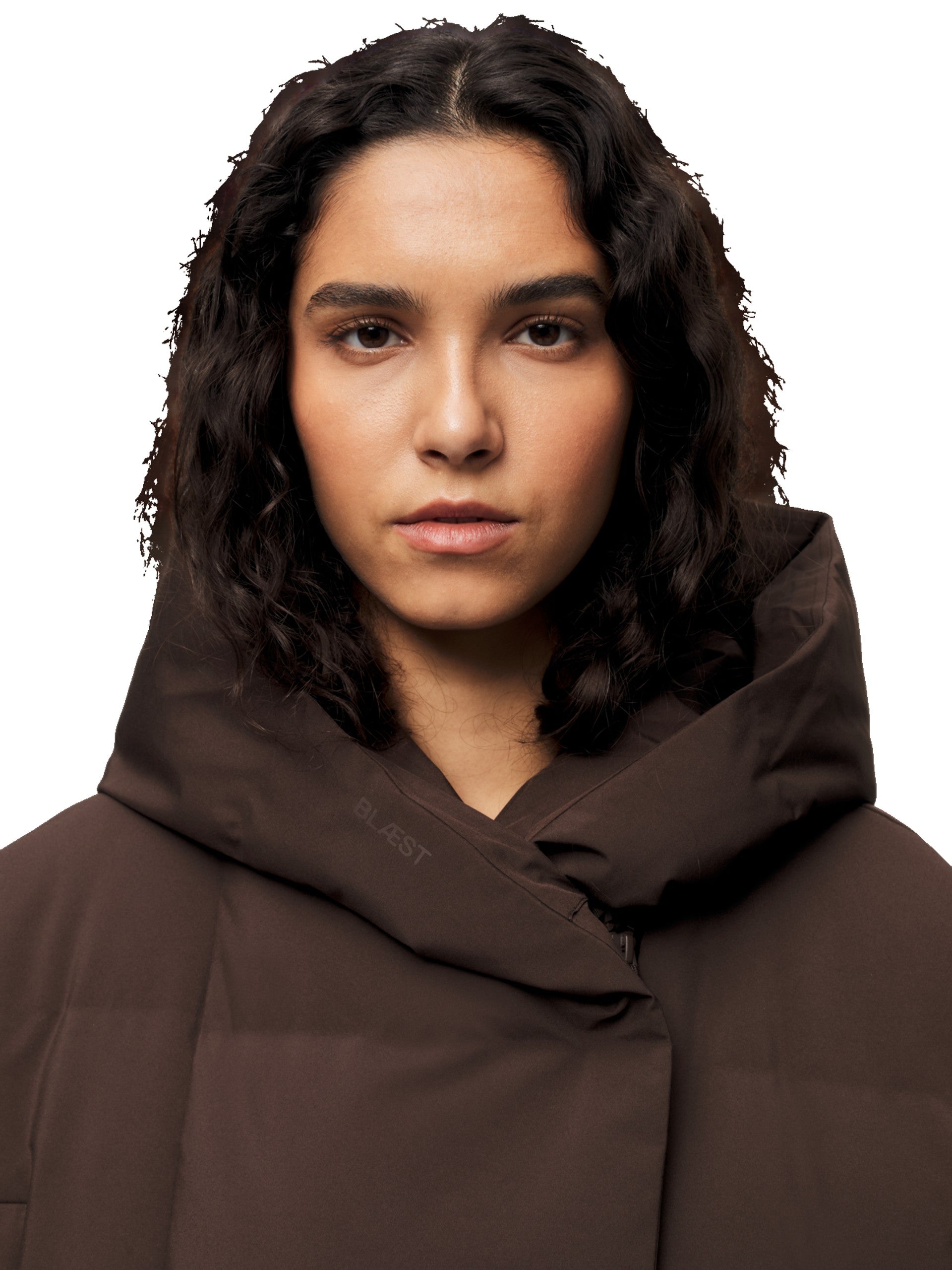 Stilig vinterjakke med oversized passform og deilig hette fra Blæst. Her i trendy brun. Modellen er rett med tøff buet hem og praktiske glidelås-splitter i sidene. Jakken har lett dunfyll av ypperste blanding, fylt i brede kanaler. Den har vanntett skall med teipede og forseglede sømmer. Jakken er lett i vekt og fantastisk behagelig, god og varm. Jakken har praktisk toveis glidelås i front og bred stormklaff. Behagelige lycra-mansjetter og elastikk langs hem. Den har to stikklommer i over brystet, to ved hoftene, samt en innerlomme. Det medfølger et stilig ton-i-ton belte for å gi jakken en mer feminin silhuett. Beltet har en egen lomme som gjør det enkelt å ta det på og av.