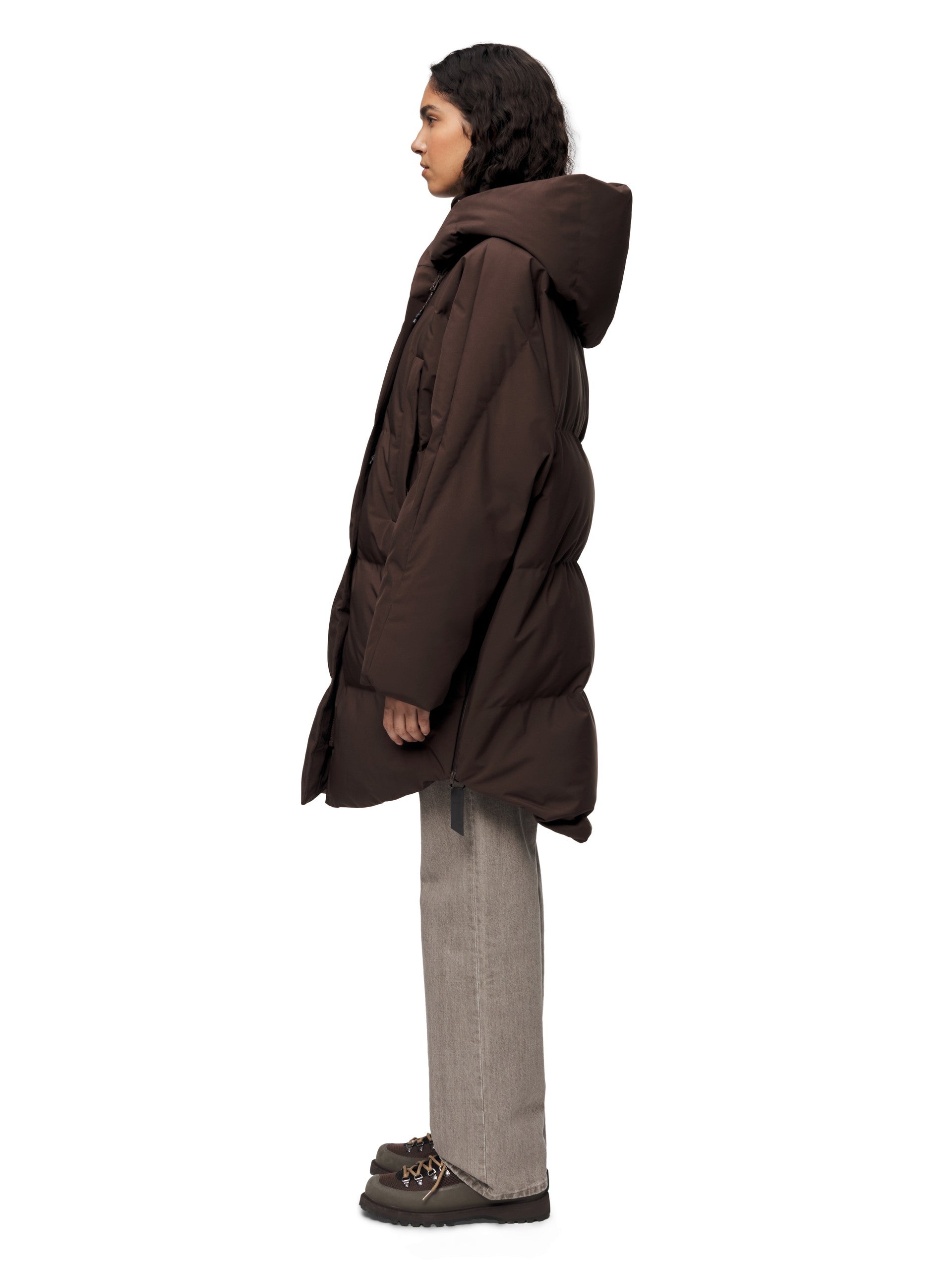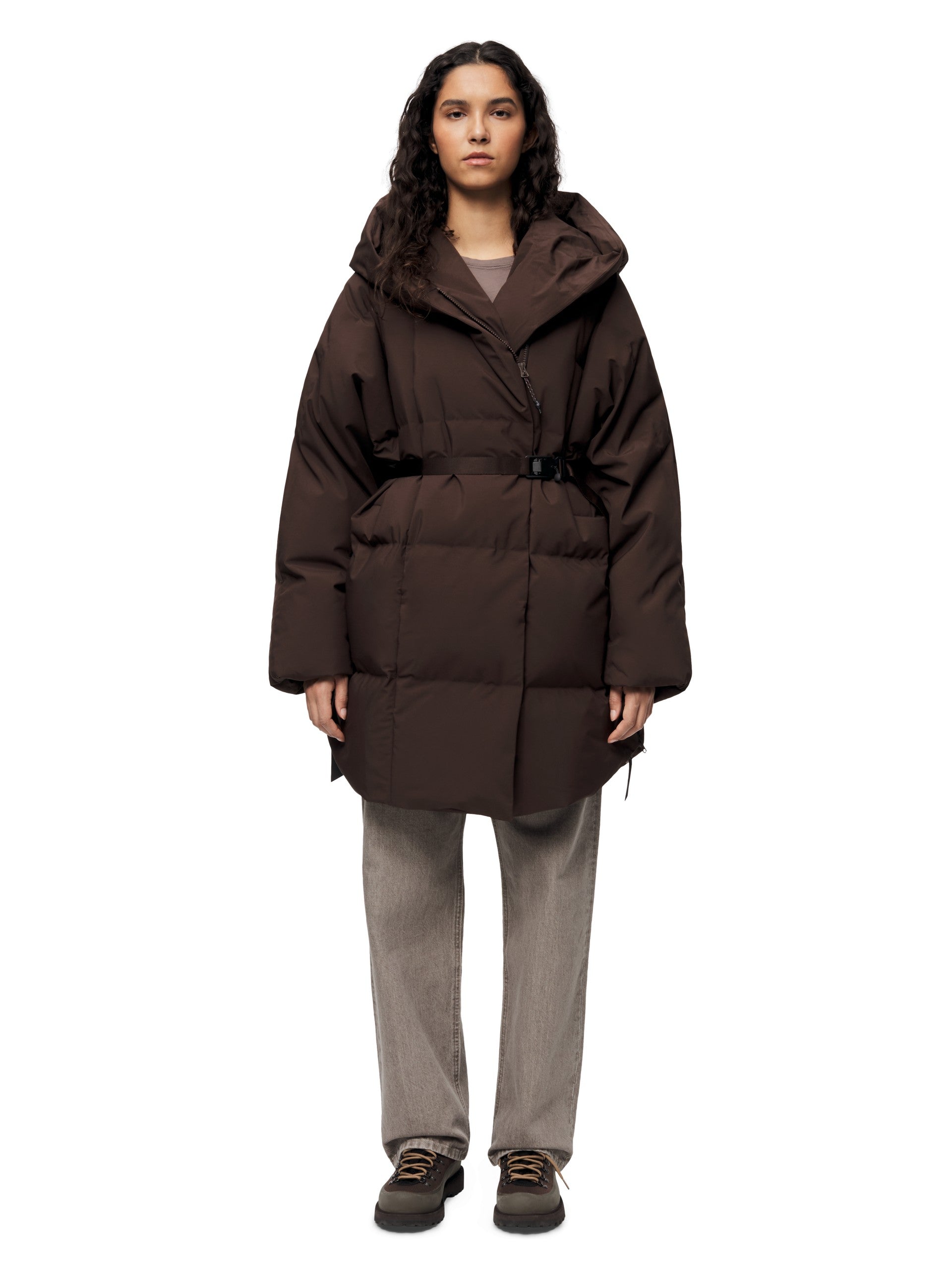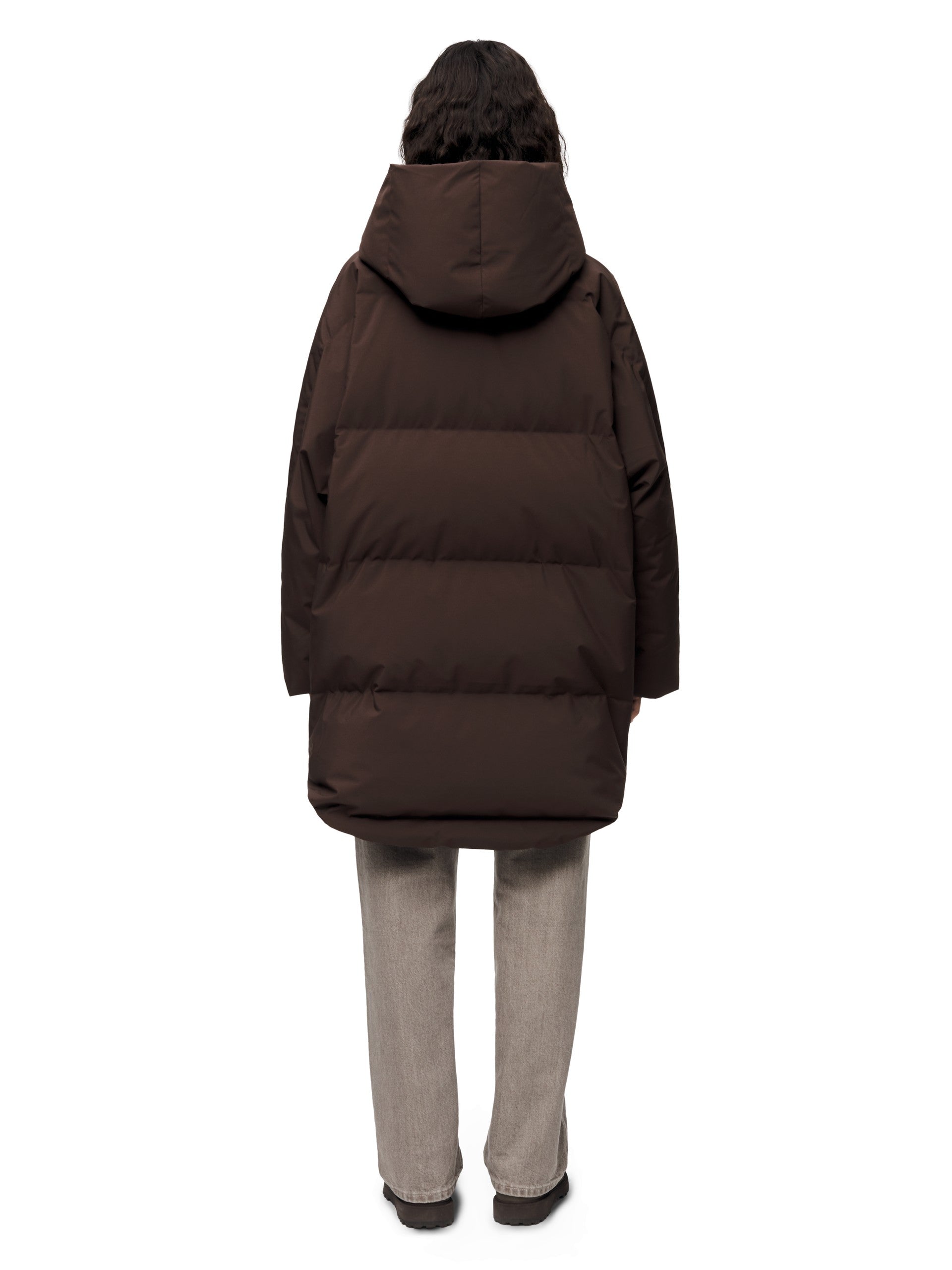Stilig vinterjakke med oversized passform og deilig hette fra Blæst. Her i trendy brun. Modellen er rett med tøff buet hem og praktiske glidelås-splitter i sidene. Jakken har lett dunfyll av ypperste blanding, fylt i brede kanaler. Den har vanntett skall med teipede og forseglede sømmer. Jakken er lett i vekt og fantastisk behagelig, god og varm. Jakken har praktisk toveis glidelås i front og bred stormklaff. Behagelige lycra-mansjetter og elastikk langs hem. Den har to stikklommer i over brystet, to ved hoftene, samt en innerlomme. Det medfølger et stilig ton-i-ton belte for å gi jakken en mer feminin silhuett. Beltet har en egen lomme som gjør det enkelt å ta det på og av.