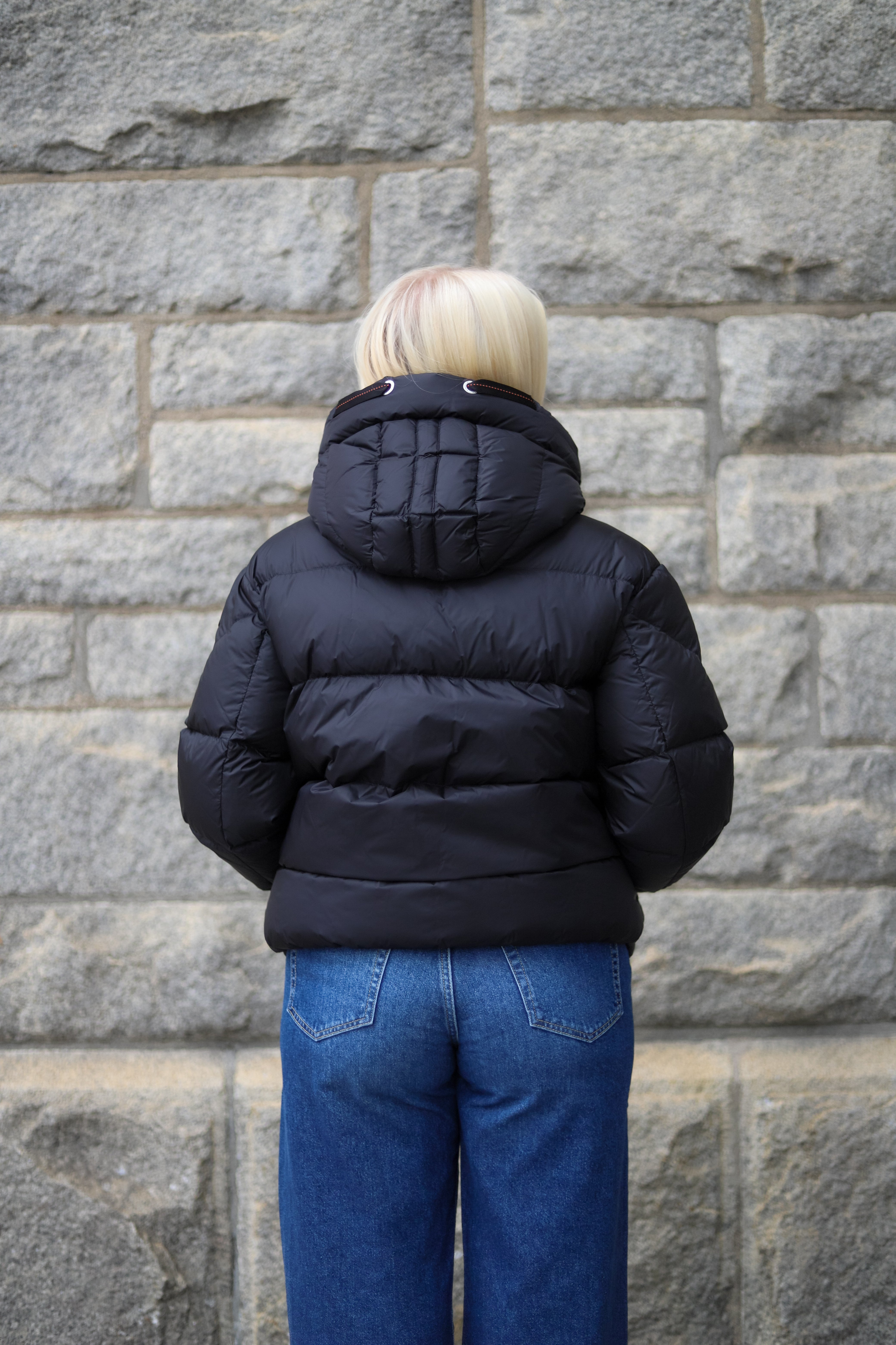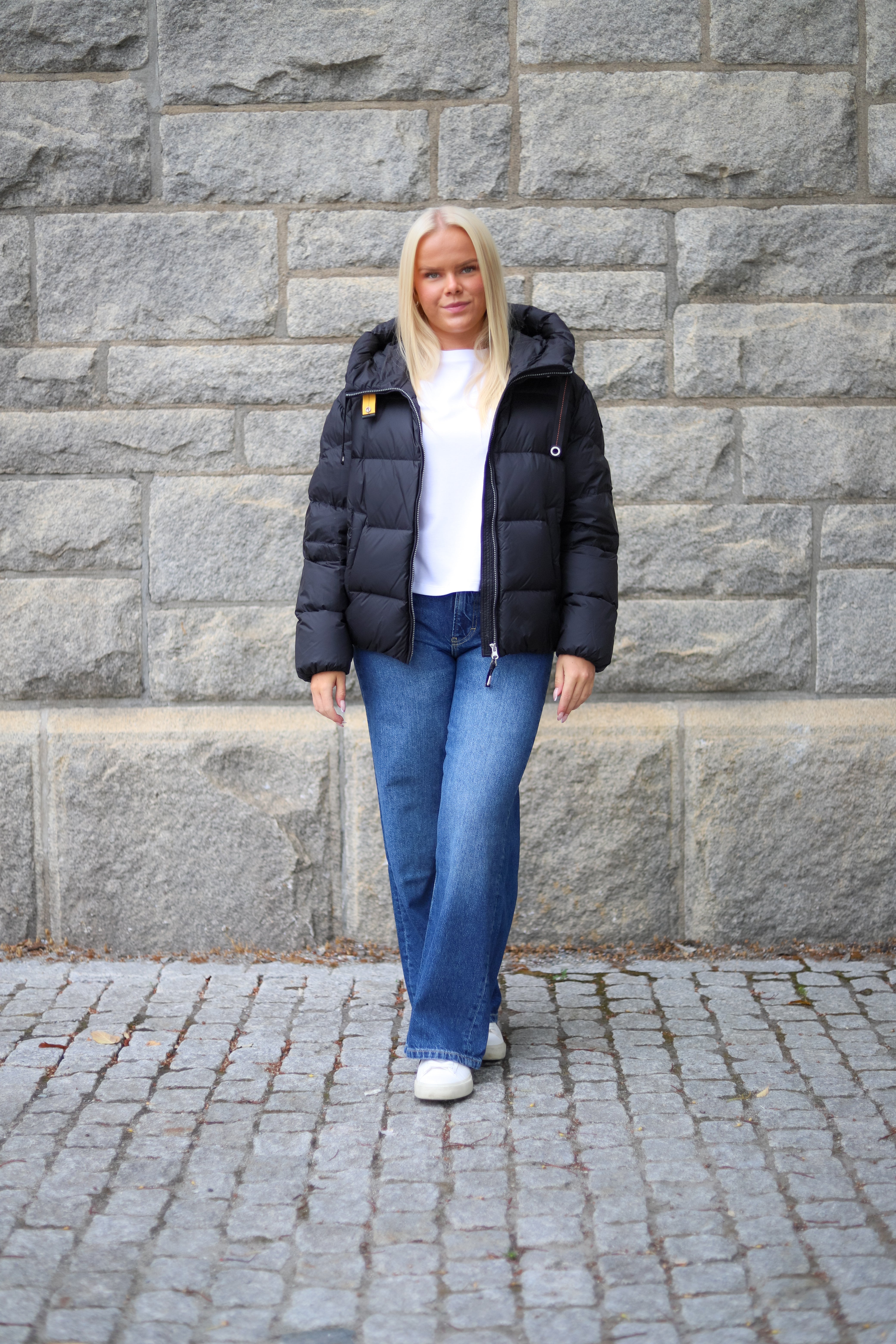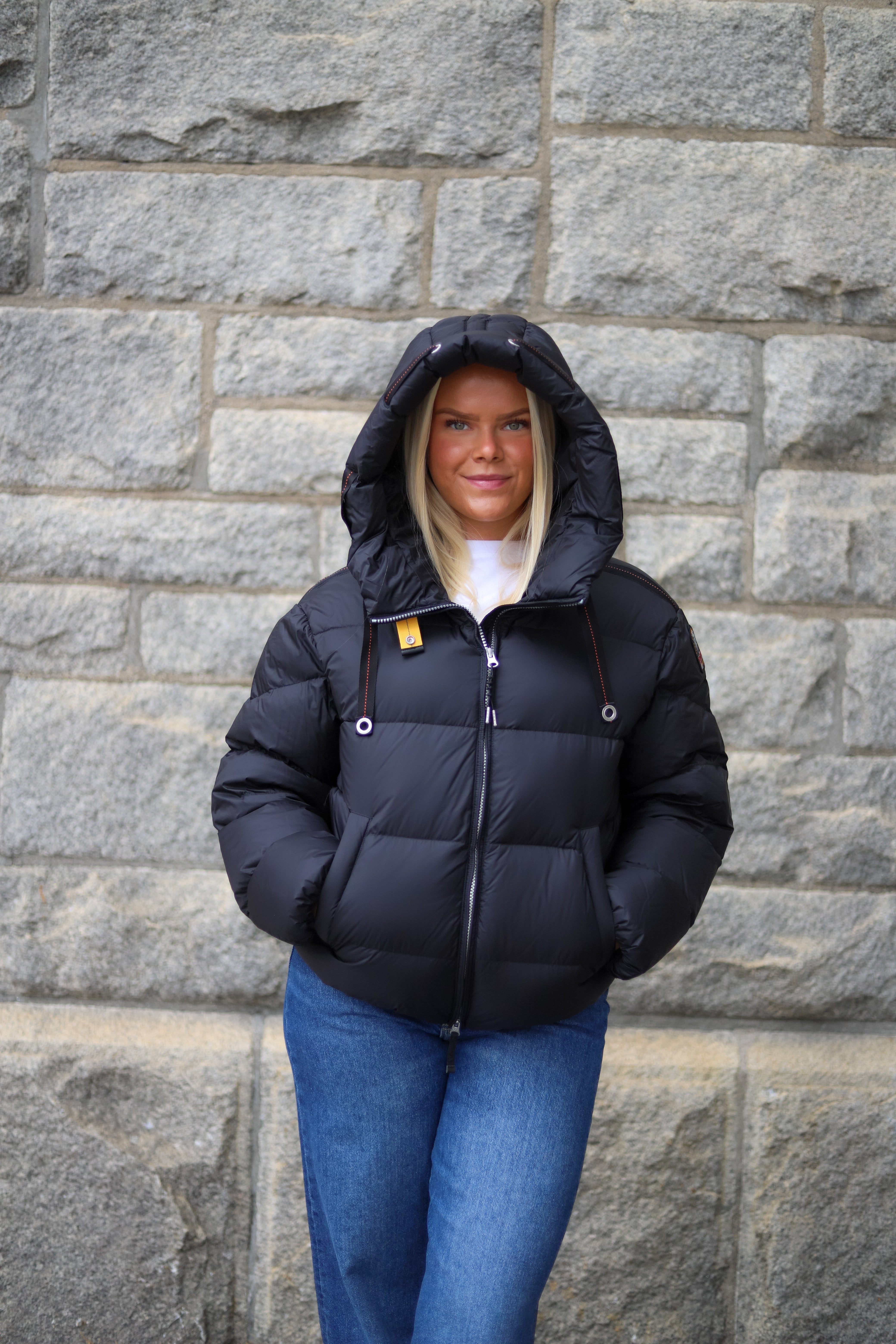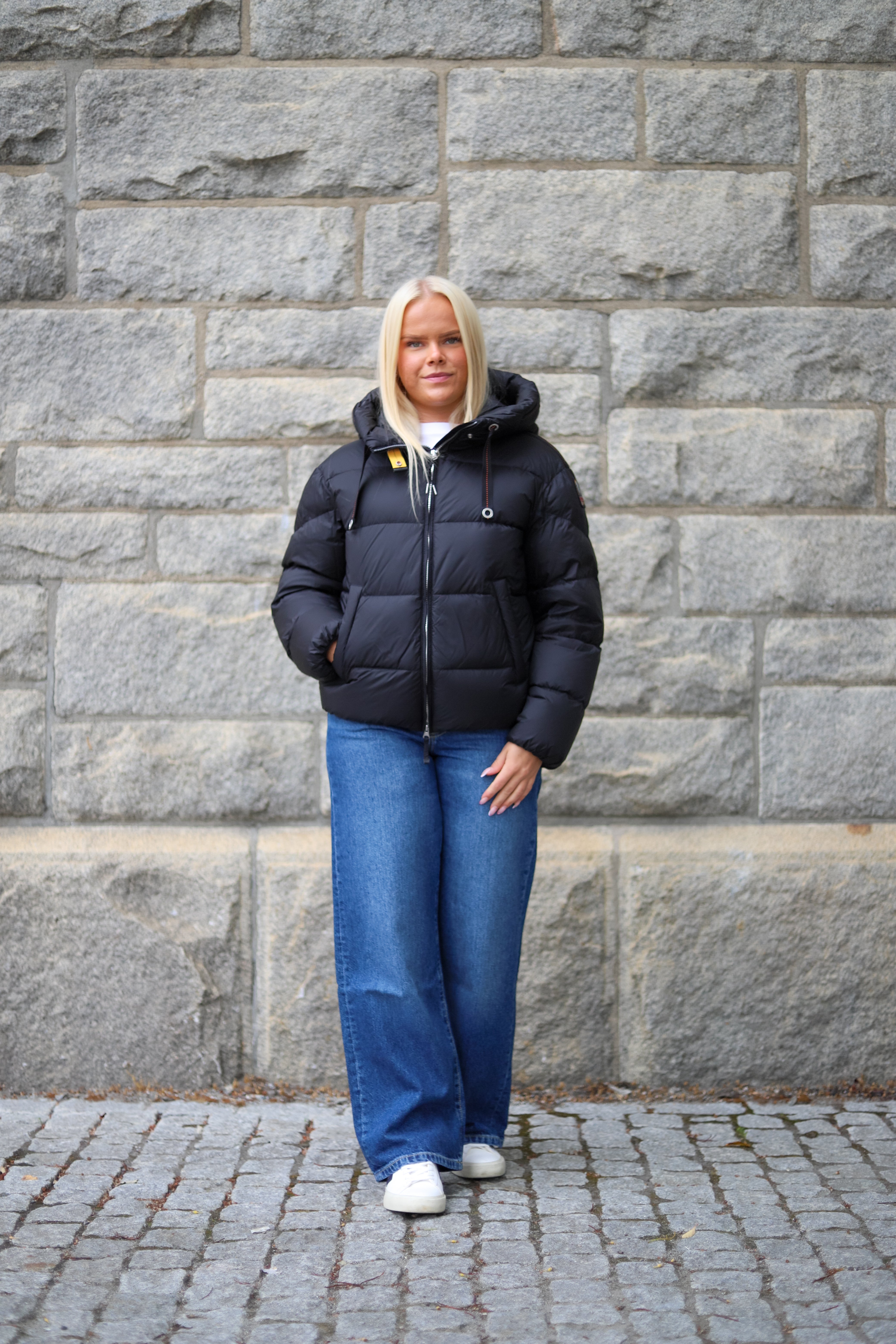 Lekker puffer i klassisk sort fra Parajumpers. Tilly er en sporty dunjakke med hette og tøffe detaljer. Den er myk med nett hoftelengde, fylt med ypperste kvalitet av 100% Andedun. Jakken er vannavvisende, vindtett og pustende. Ytterstoffet har en flott blank finish. Jakken er quiltet i brede kanaler og har en fyllmengde på 800 som egner seg godt i kaldt klima. Jakken har toveis glidelås og elastisk hem. Den har høy hals og digg hette med synlig snøring, samt behagelig ribb i mansjetten. To skrålommer med knapp og innerlomme i mesh. Jakken har ikoniske PJS detaljer med gul elastisk stropp i halsen og logopatch på overermen.
