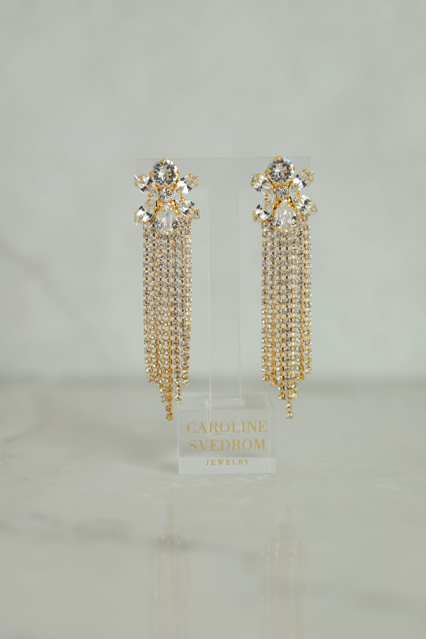 Ciara er lekre statement øredobber med heng i Swarovski-krystaller. Her i en klassisk kombinasjon av blanke stener i forskjellige størrelser. Stift og bakside i gullforgyllt rhodium.