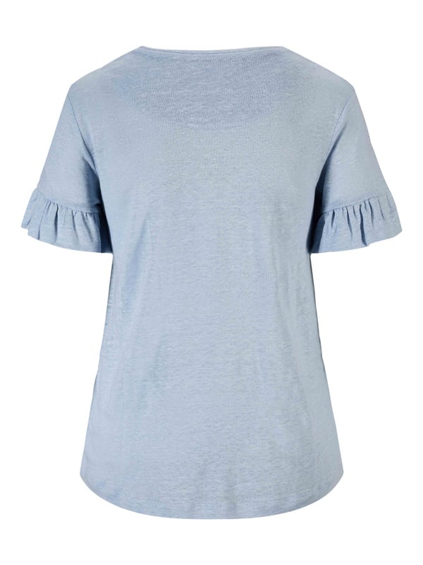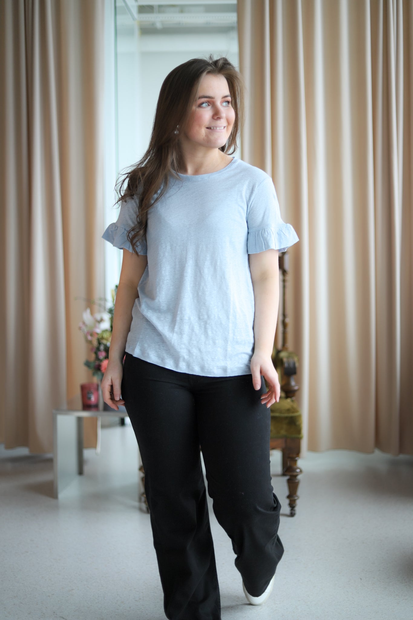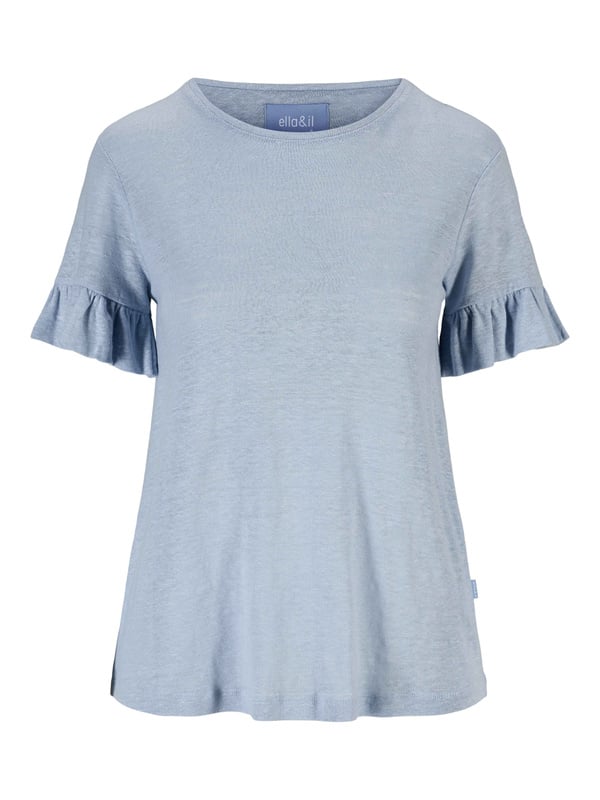 Fantastisk basic fra norske ella&il. Lara linen tee er en søt t-shirt med ruffle detaljer i ermene. En rett modell med hoftelengde, lett droppede skuldersømmer og feminine nette emer. Passformen er løs og avslappet. Linkvaliteten er lett transparent og har en flott tekstur i vevingen. Her i lys blå.