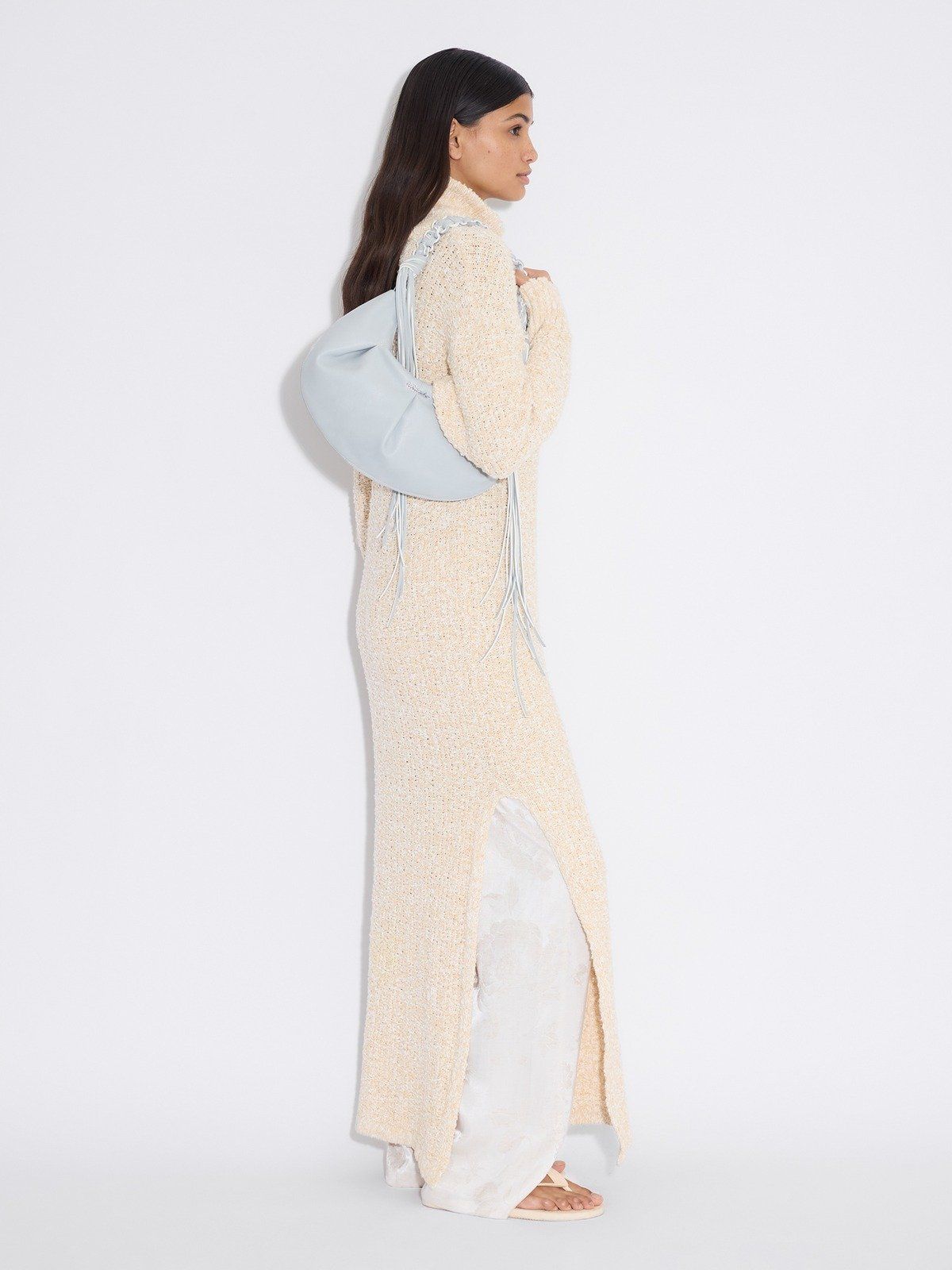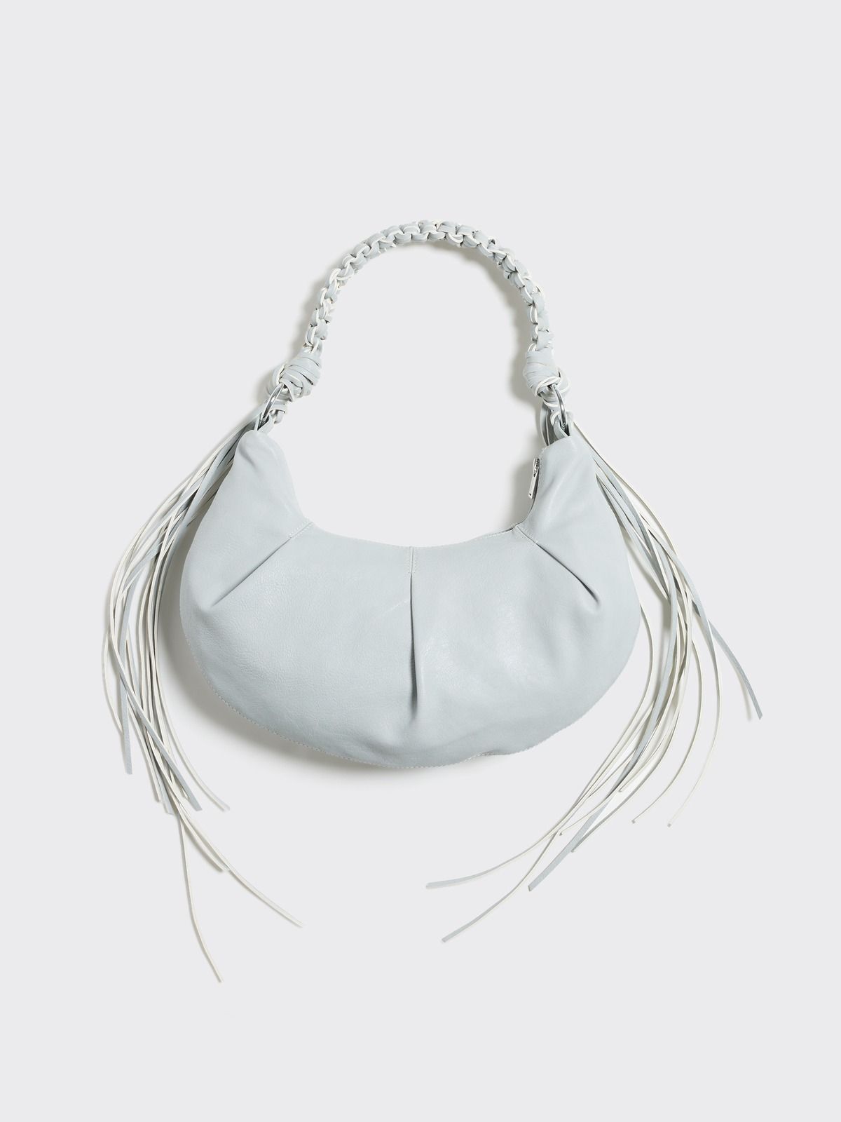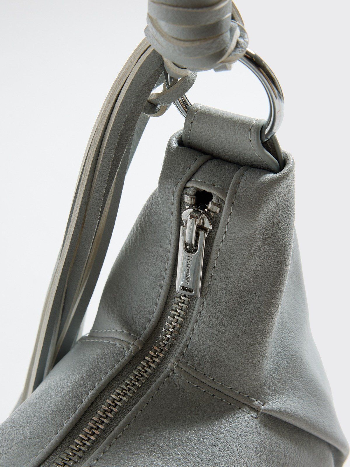 Stilig veske i lys grå fra Holzweiler. Modellen er formet som en halvmåne med flettet håndtak og stilige rysjer. Diskret metallogo i front og glidelåslukking i toppen. Topp antrekket med sesongens kuleste veske!