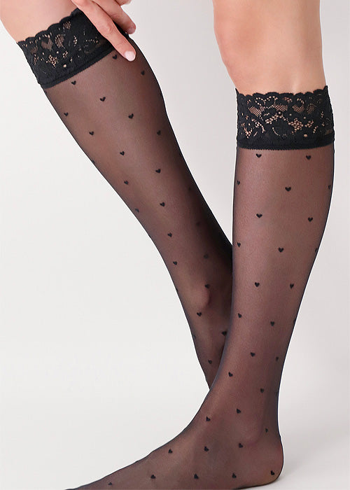 Søte knestrømper i klassisk sort med små hjerter og blondekant fra Oroblu i 20 denier.