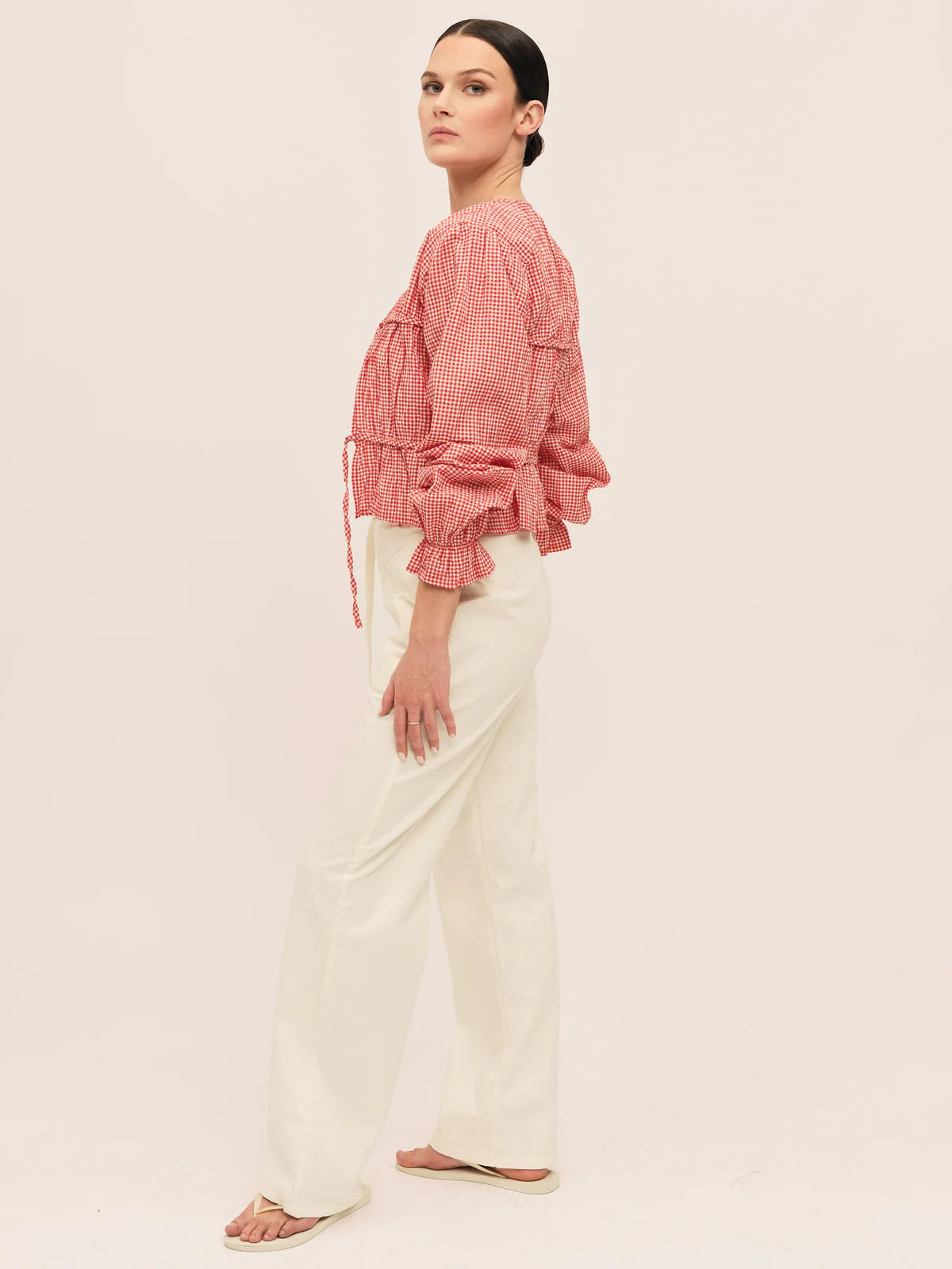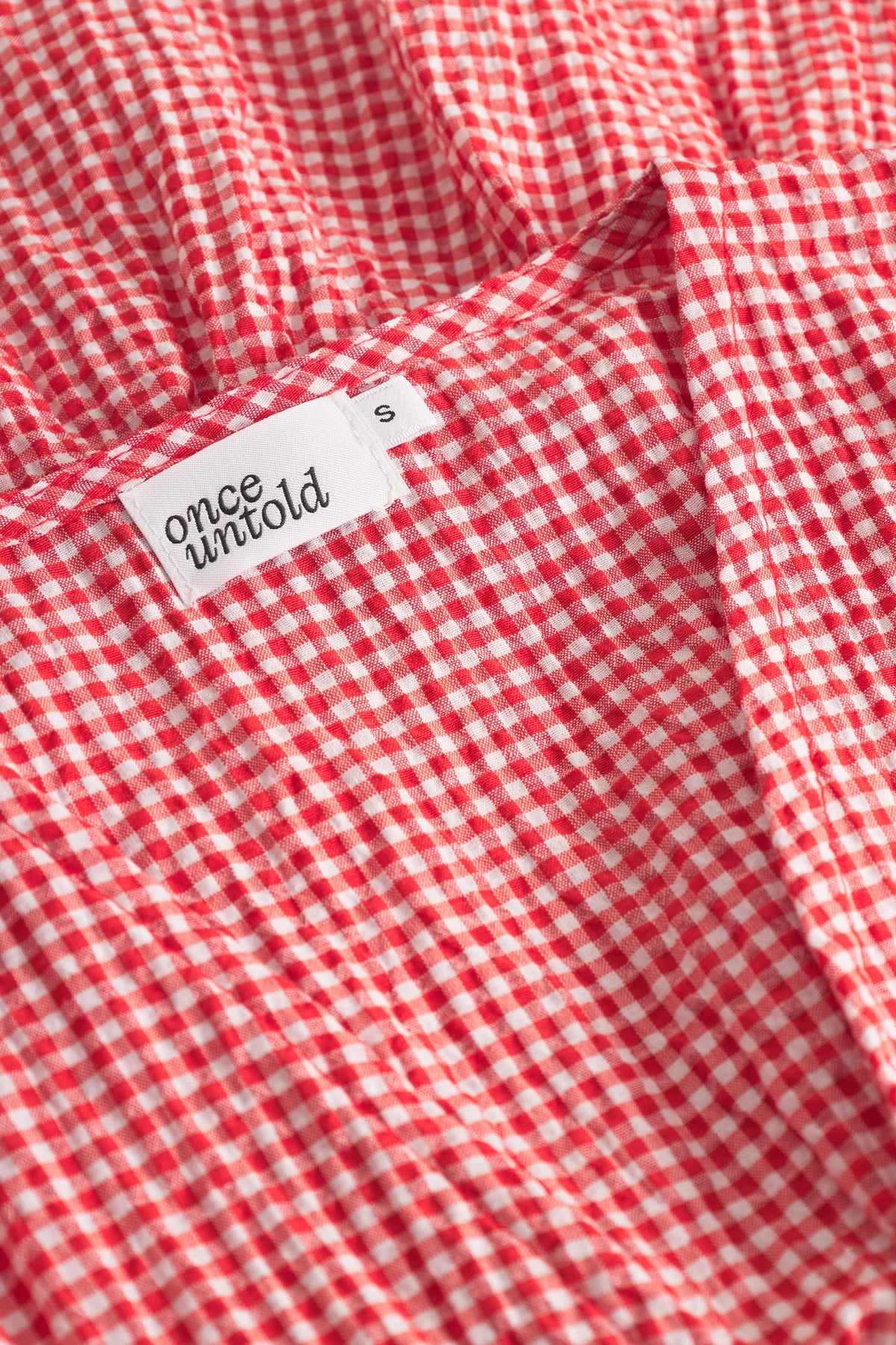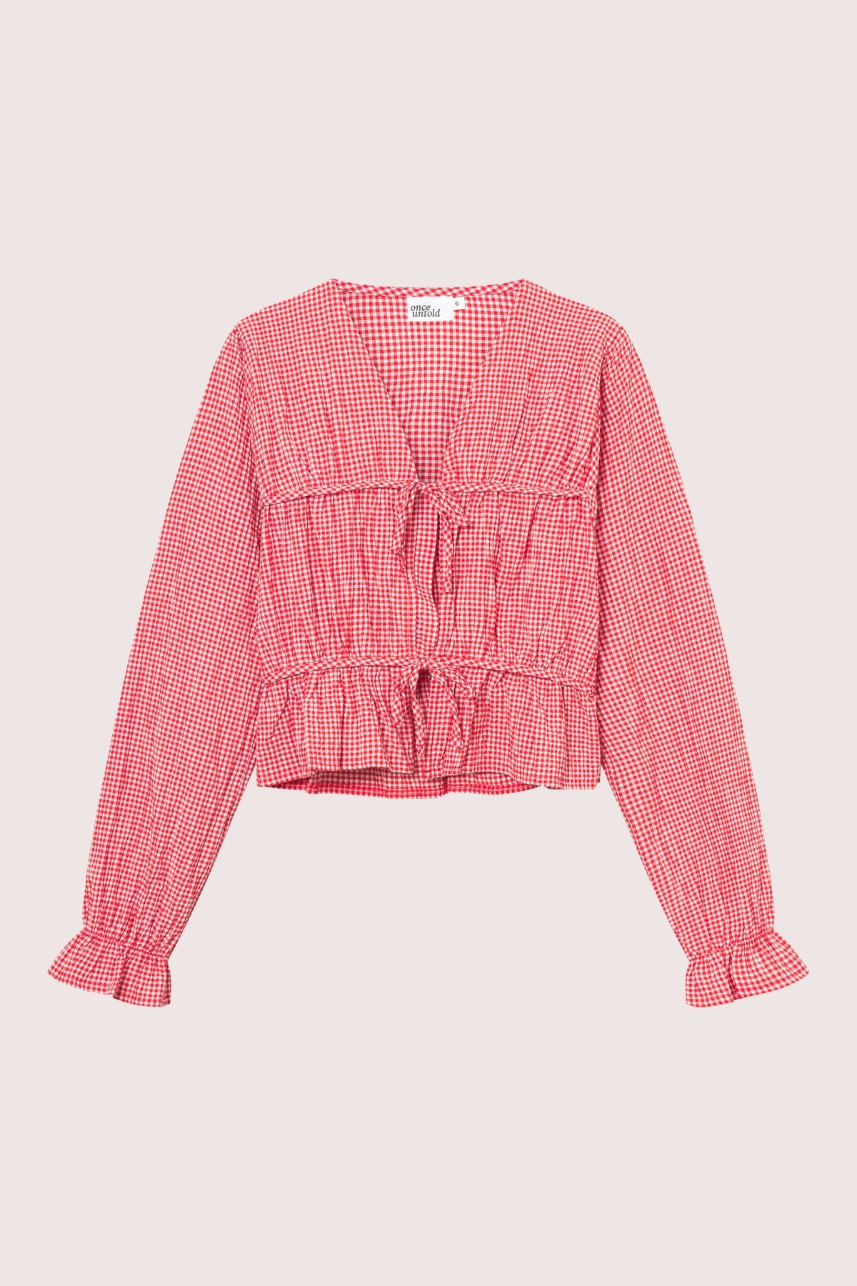 Søt smårutet bluse i rød og hvit fra Once Untold. Modellen er nett med v-hals, lett croppet lengde og knytebånd over brystet og i livet for en feminin fasong. Lange ermer med lett volum og knapper i smal mansjett. Deilig lett og luftig seersucker kvalitet. Den perfekte hverdagsblusen med lekre detaljer.