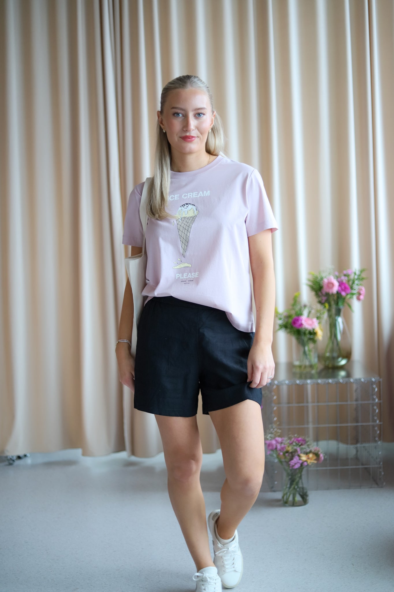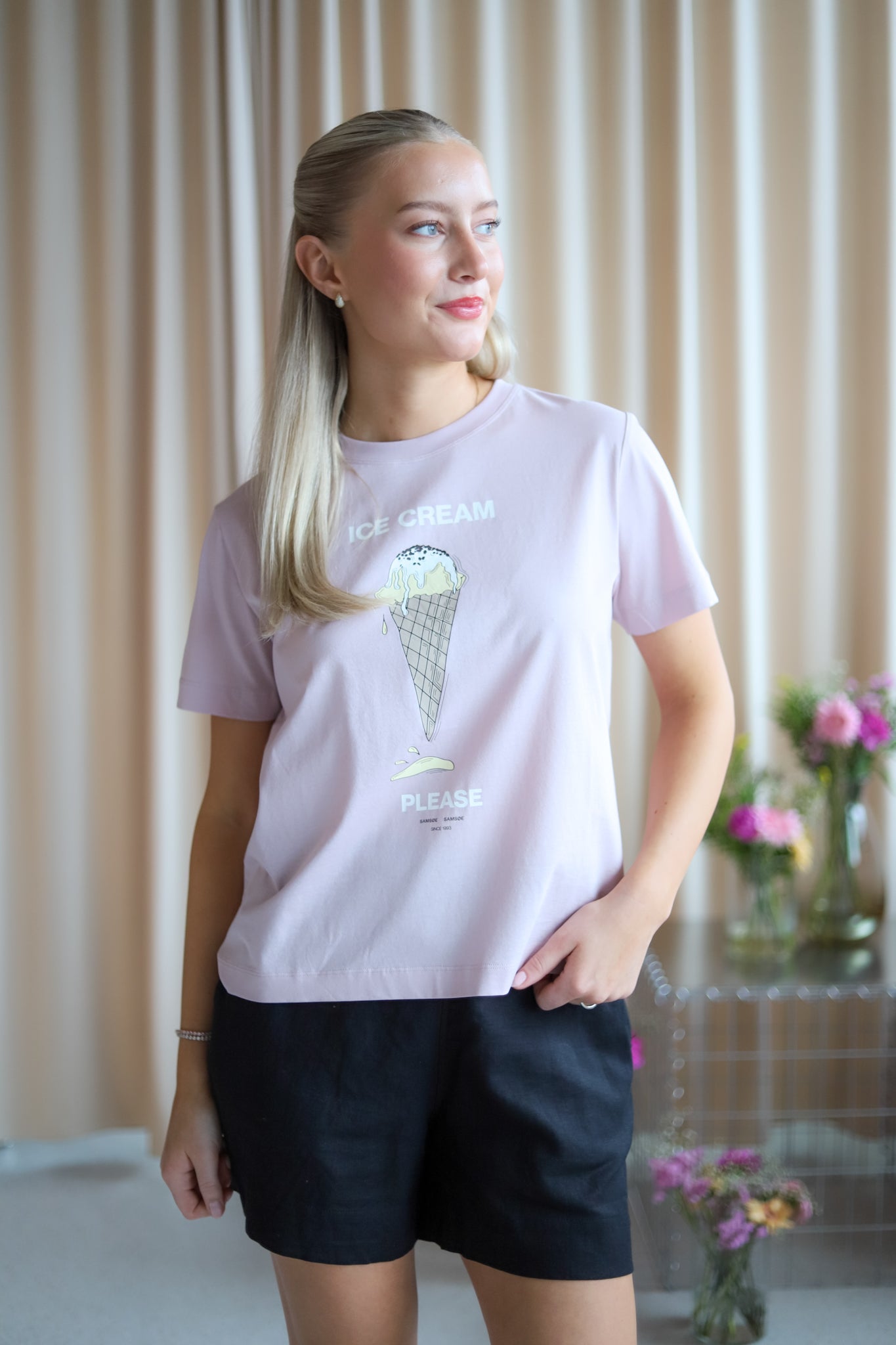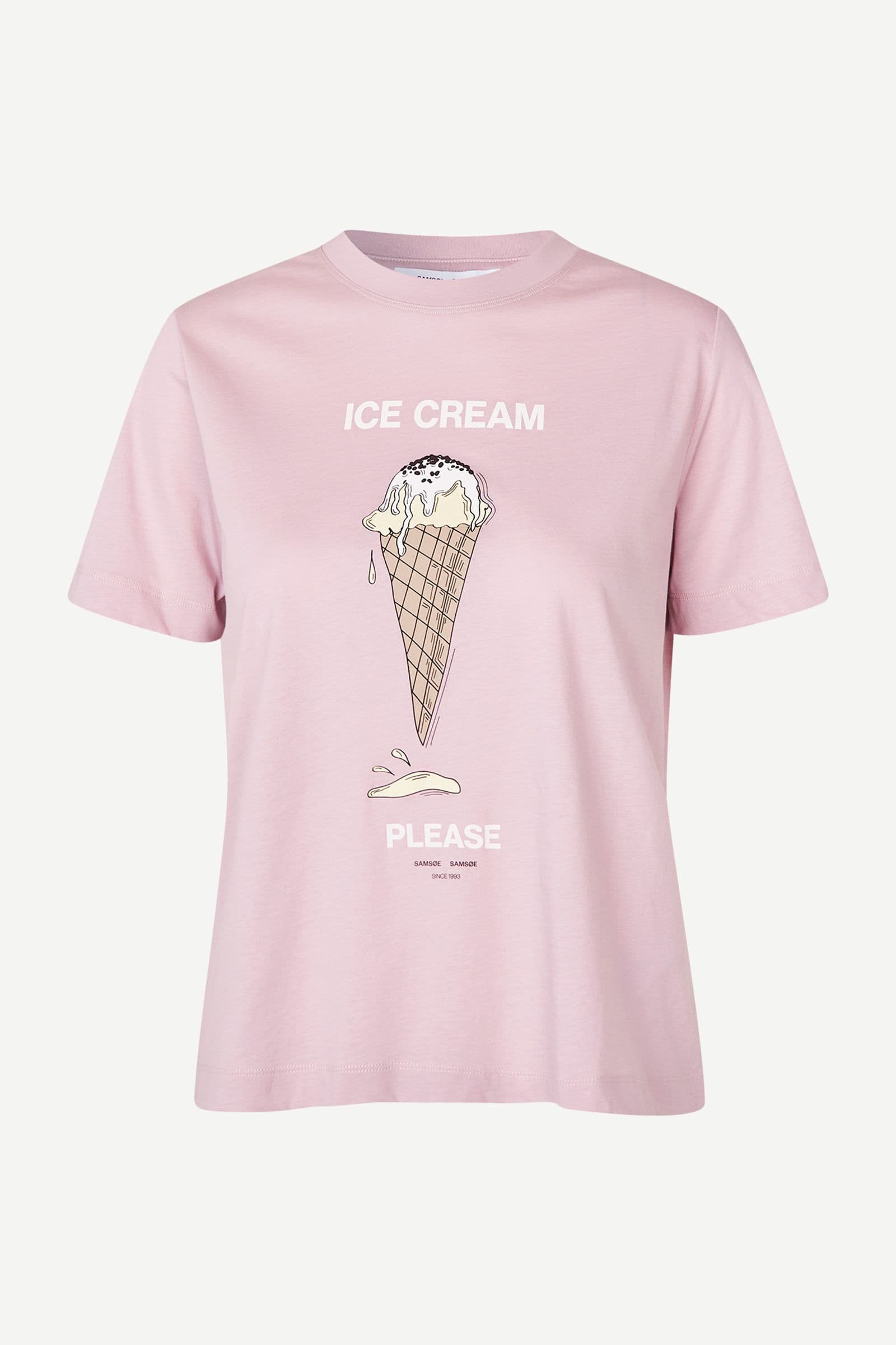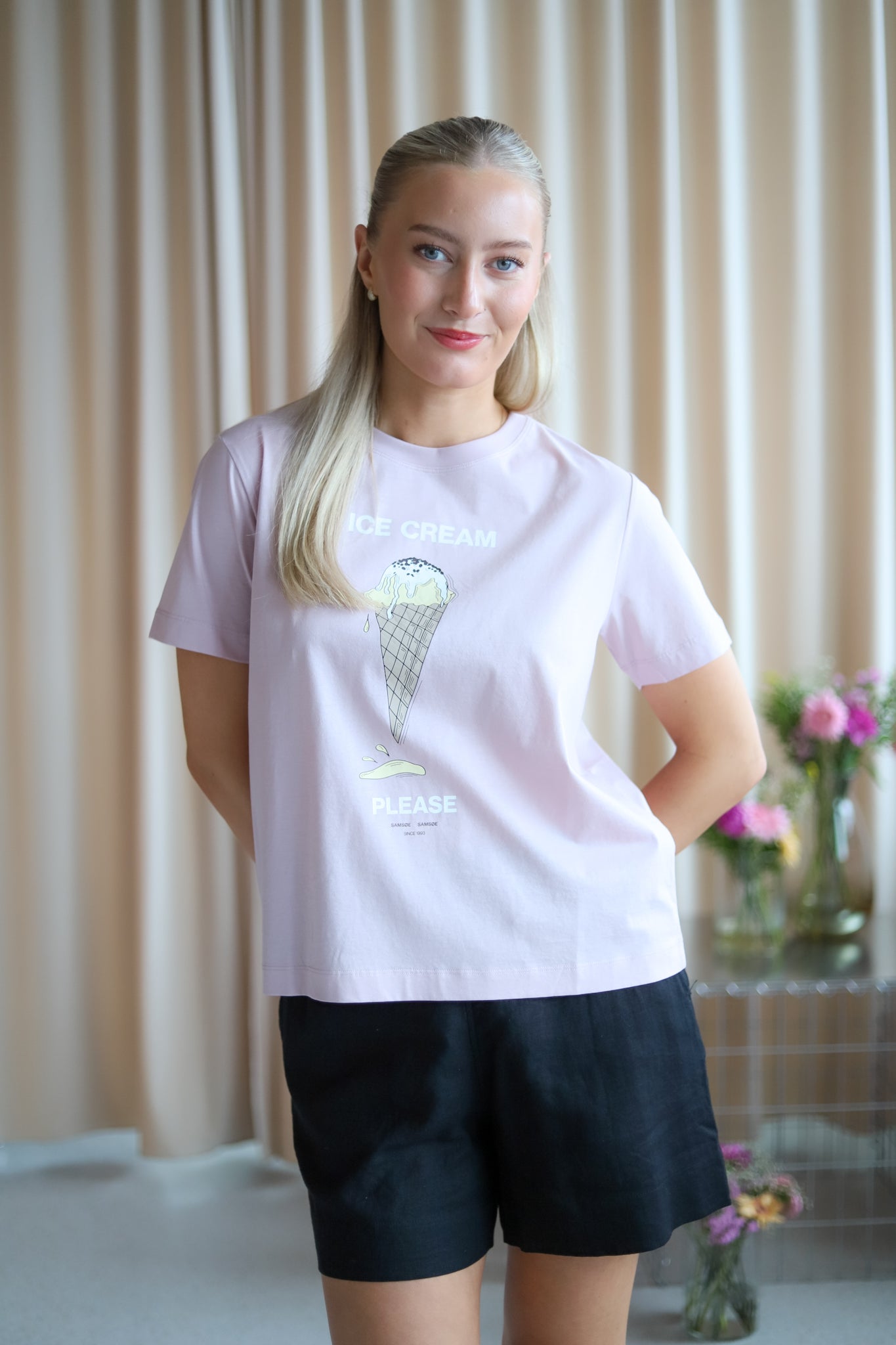 Leken t-skjorte i lys rosa med iskremprint på front fra Samsøe. Modellen er rett med rund hals, korte ermer og pen hoftelengde. Søt t-skjorte til sommerseongen.