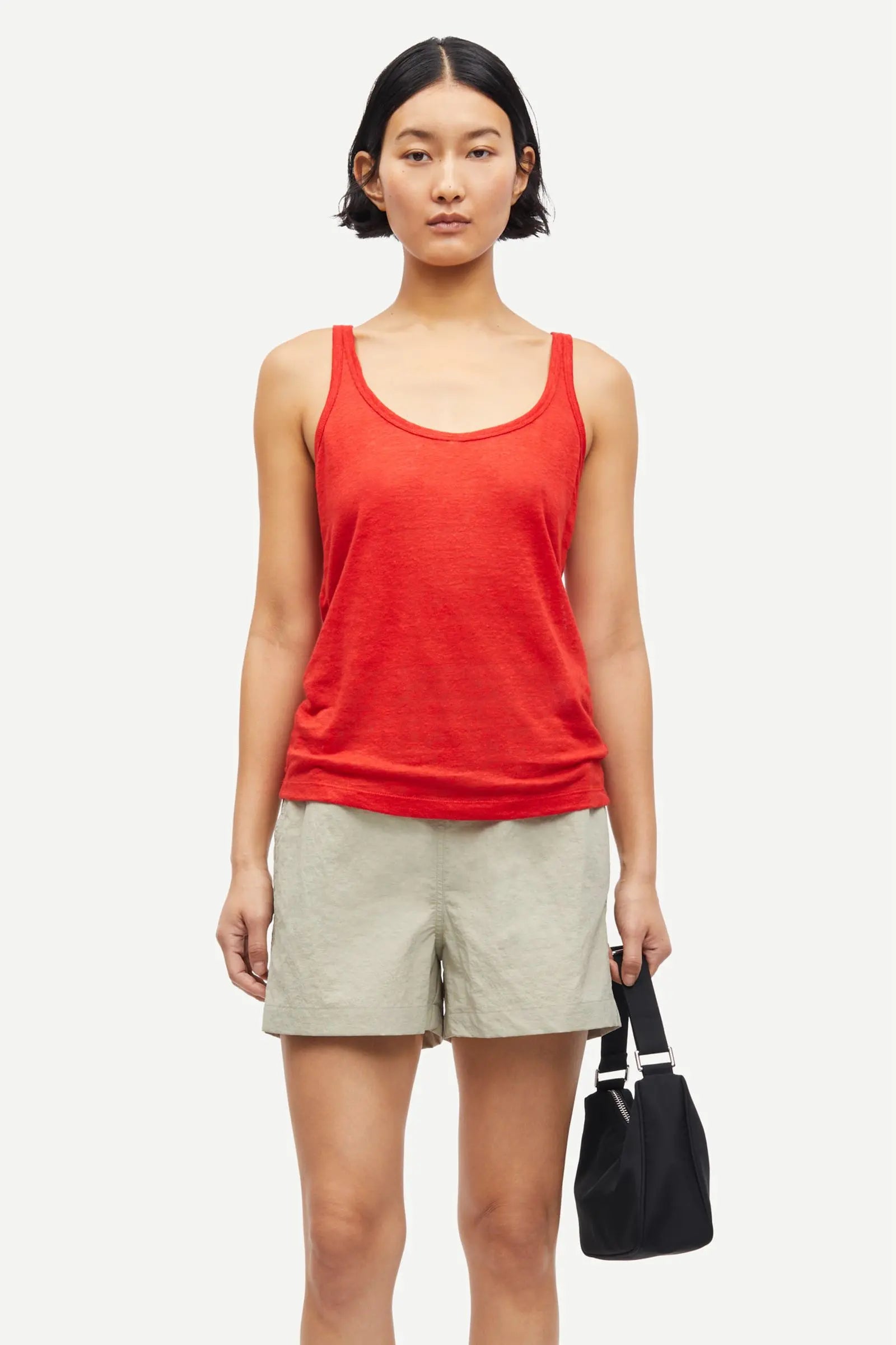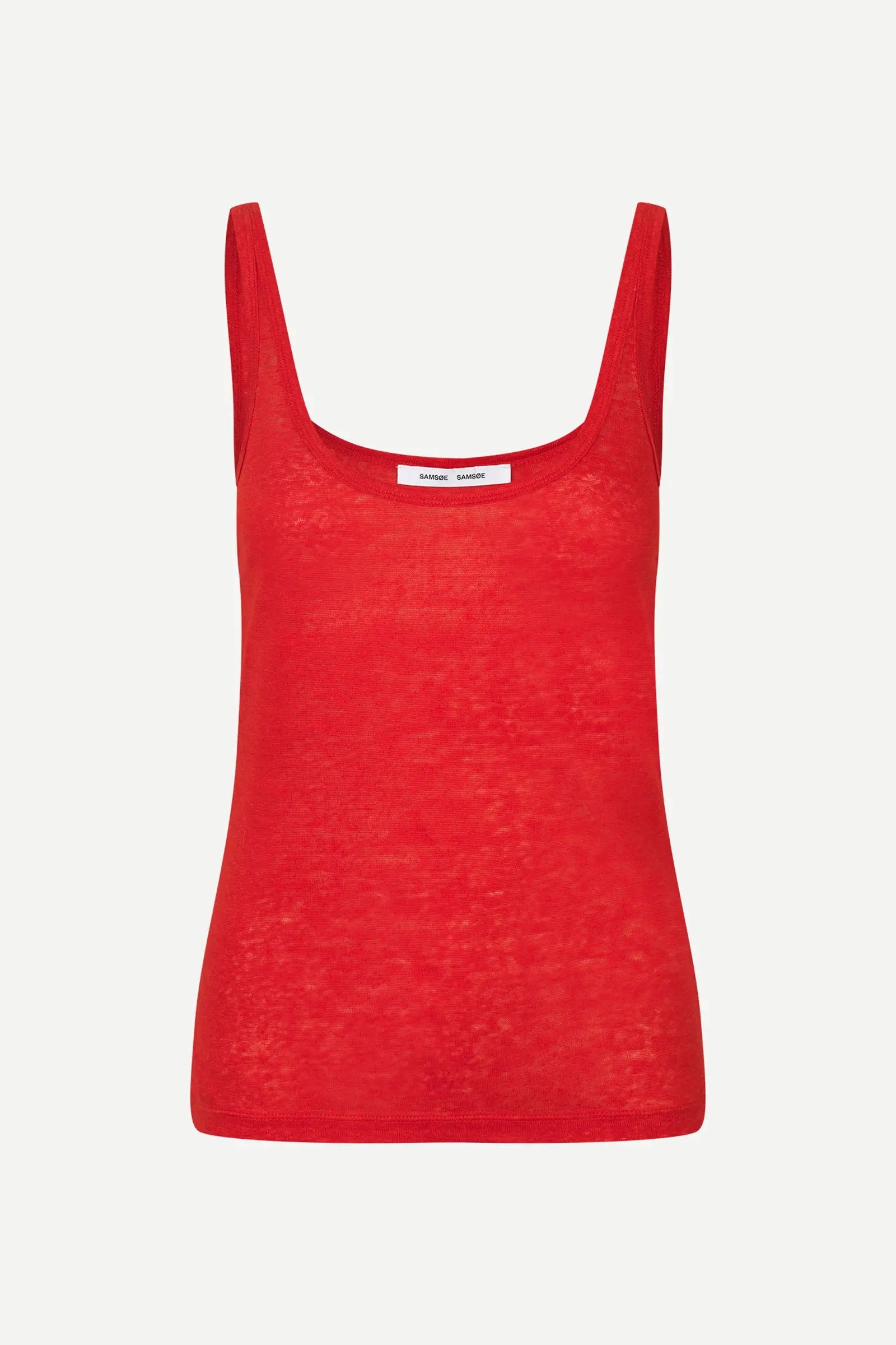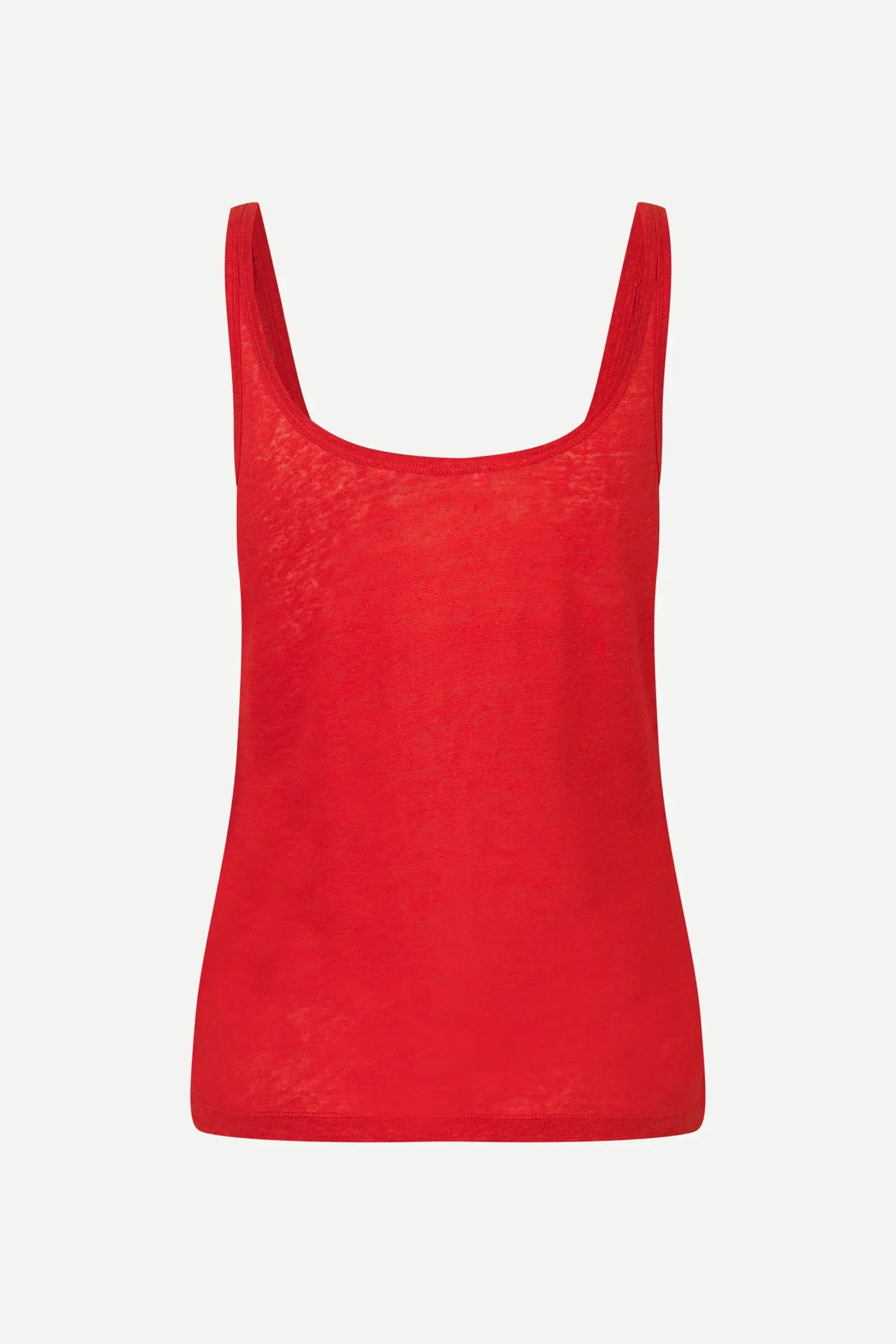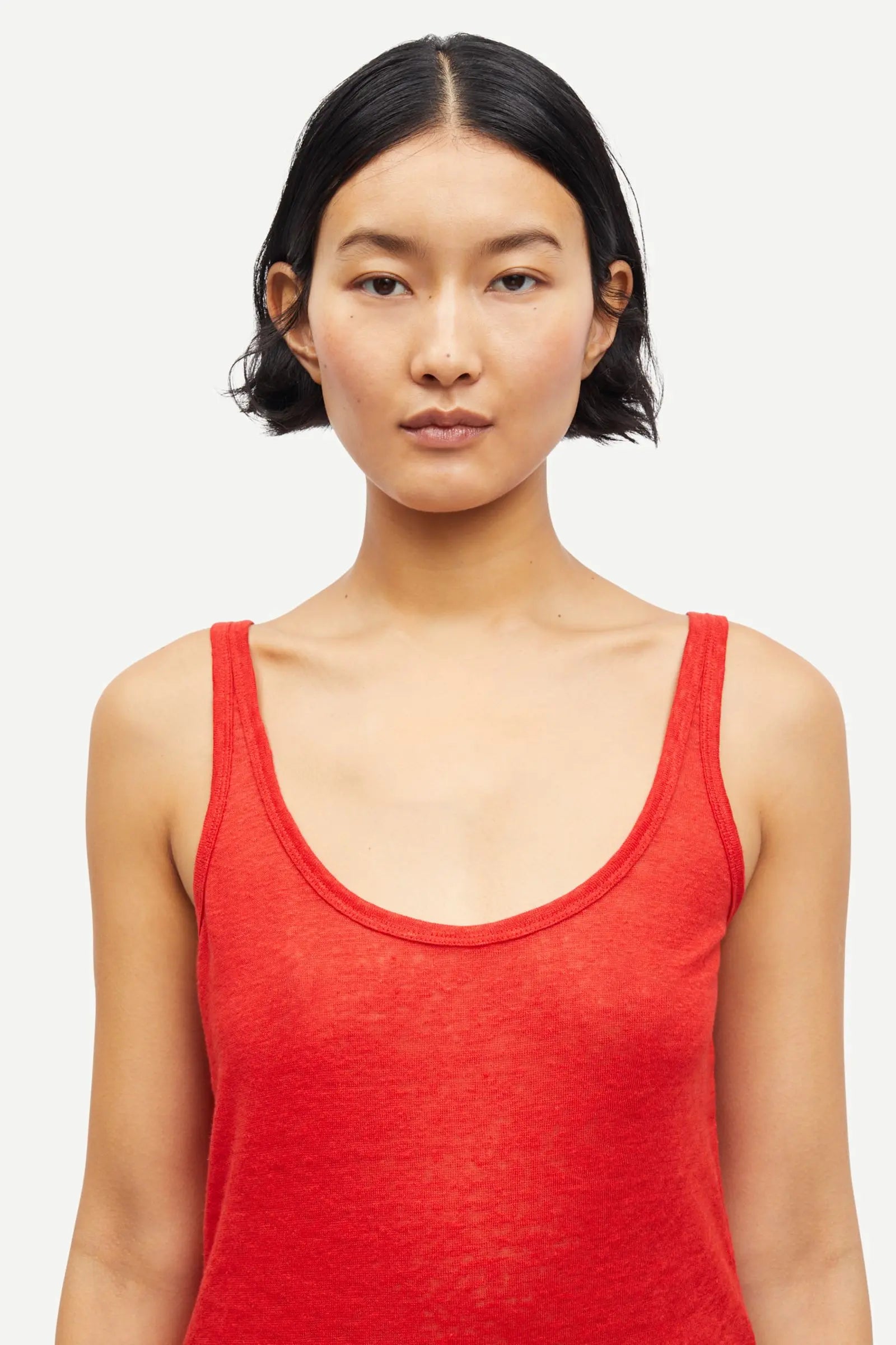 Deilig singlet myk lin fra Samsøe. Deilig lett kvalitet med fin struktur i en fresh rød farge. Regulær rett modell med hoftelengde og pen utringning.