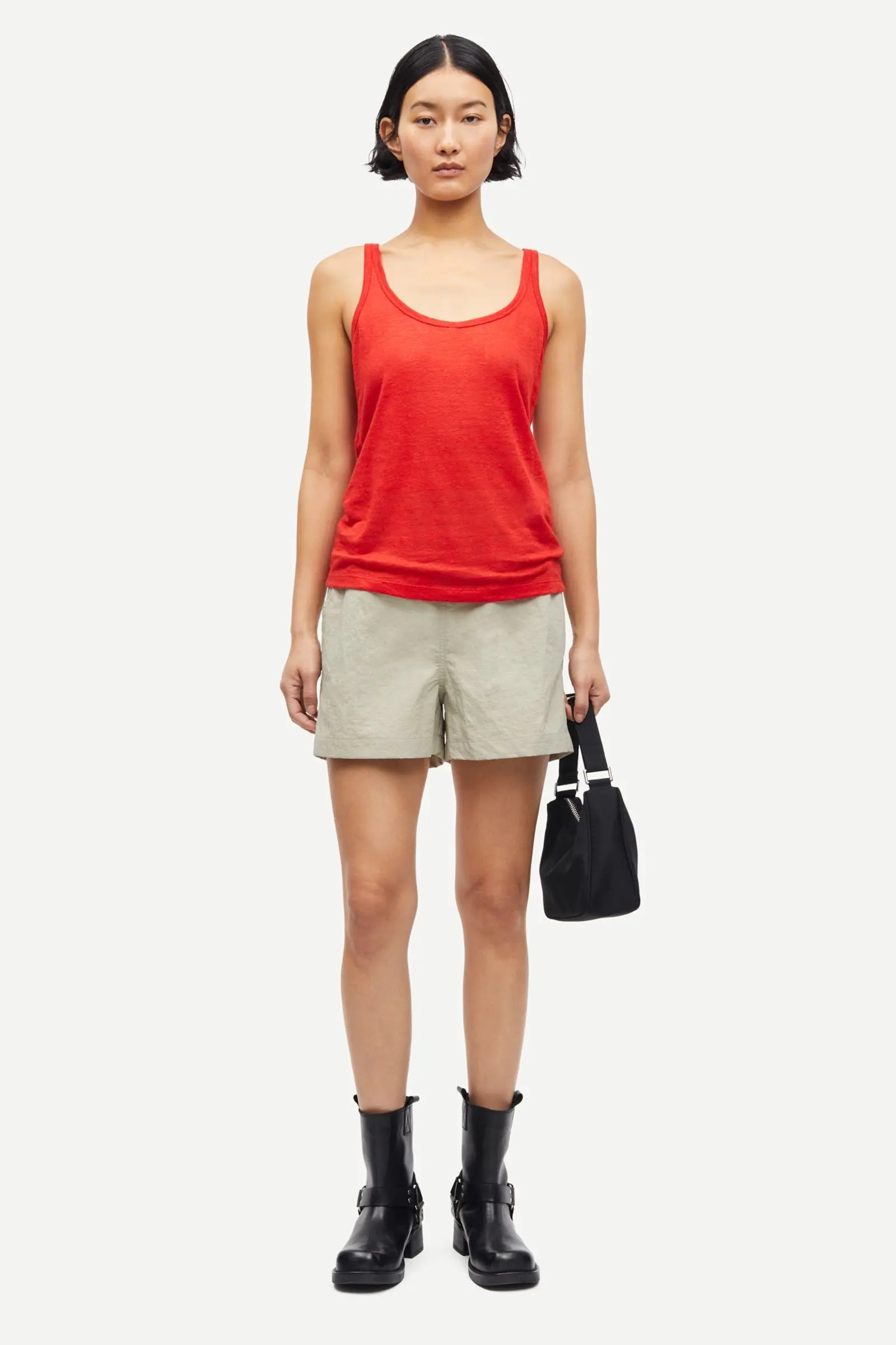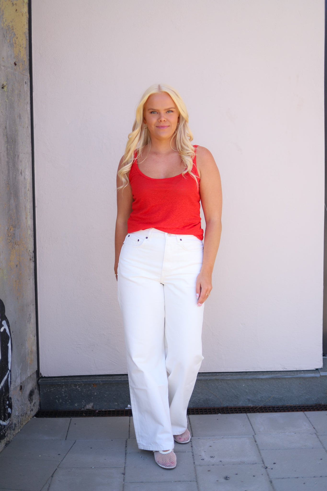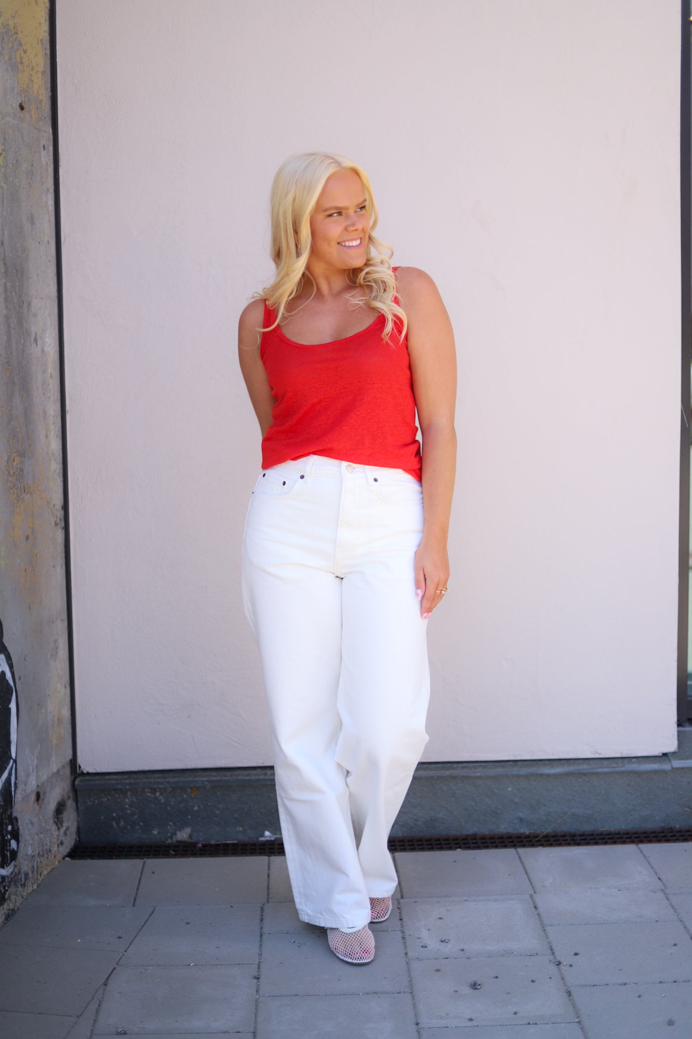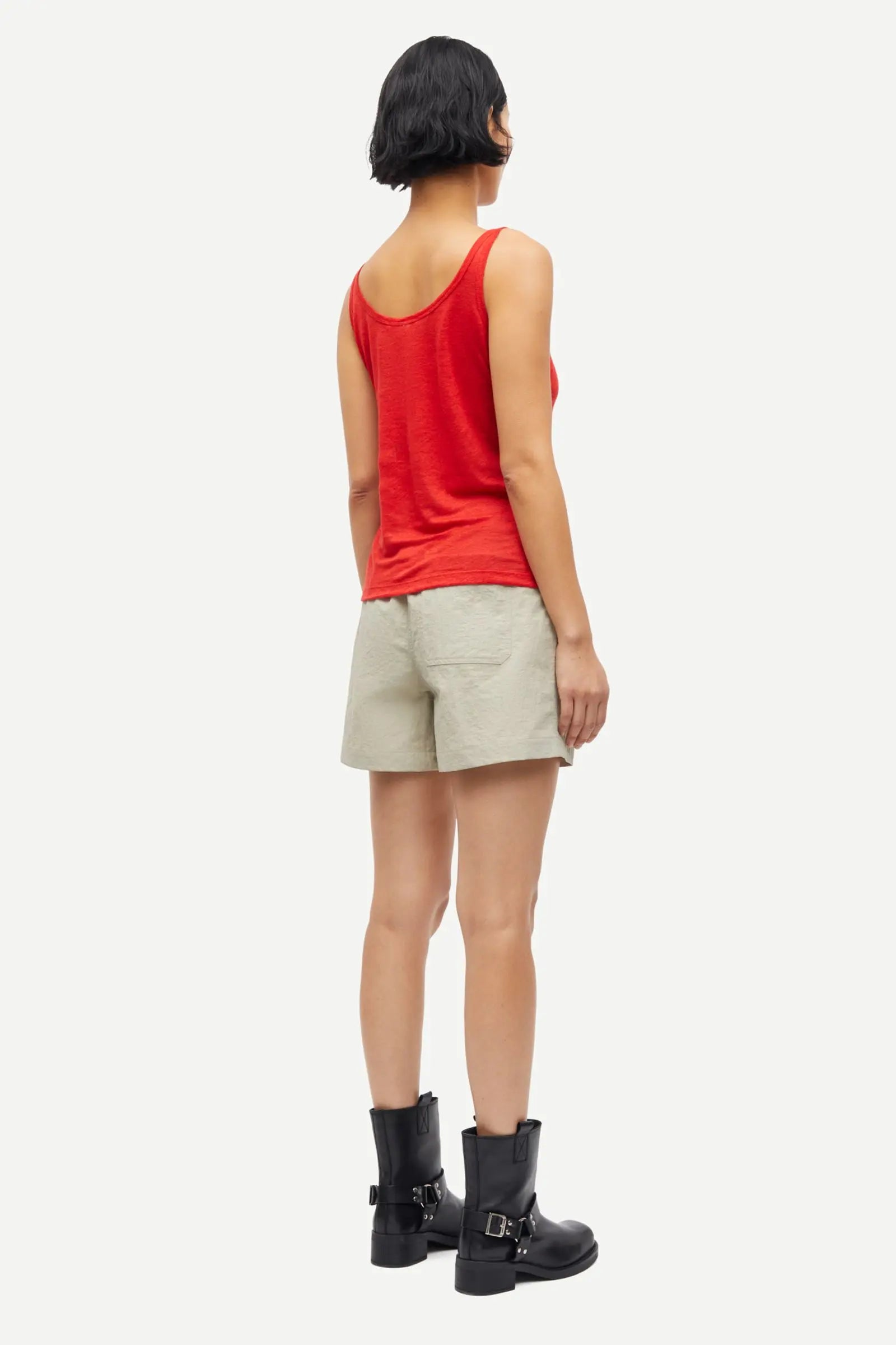 Deilig singlet myk lin fra Samsøe. Deilig lett kvalitet med fin struktur i en fresh rød farge. Regulær rett modell med hoftelengde og pen utringning.