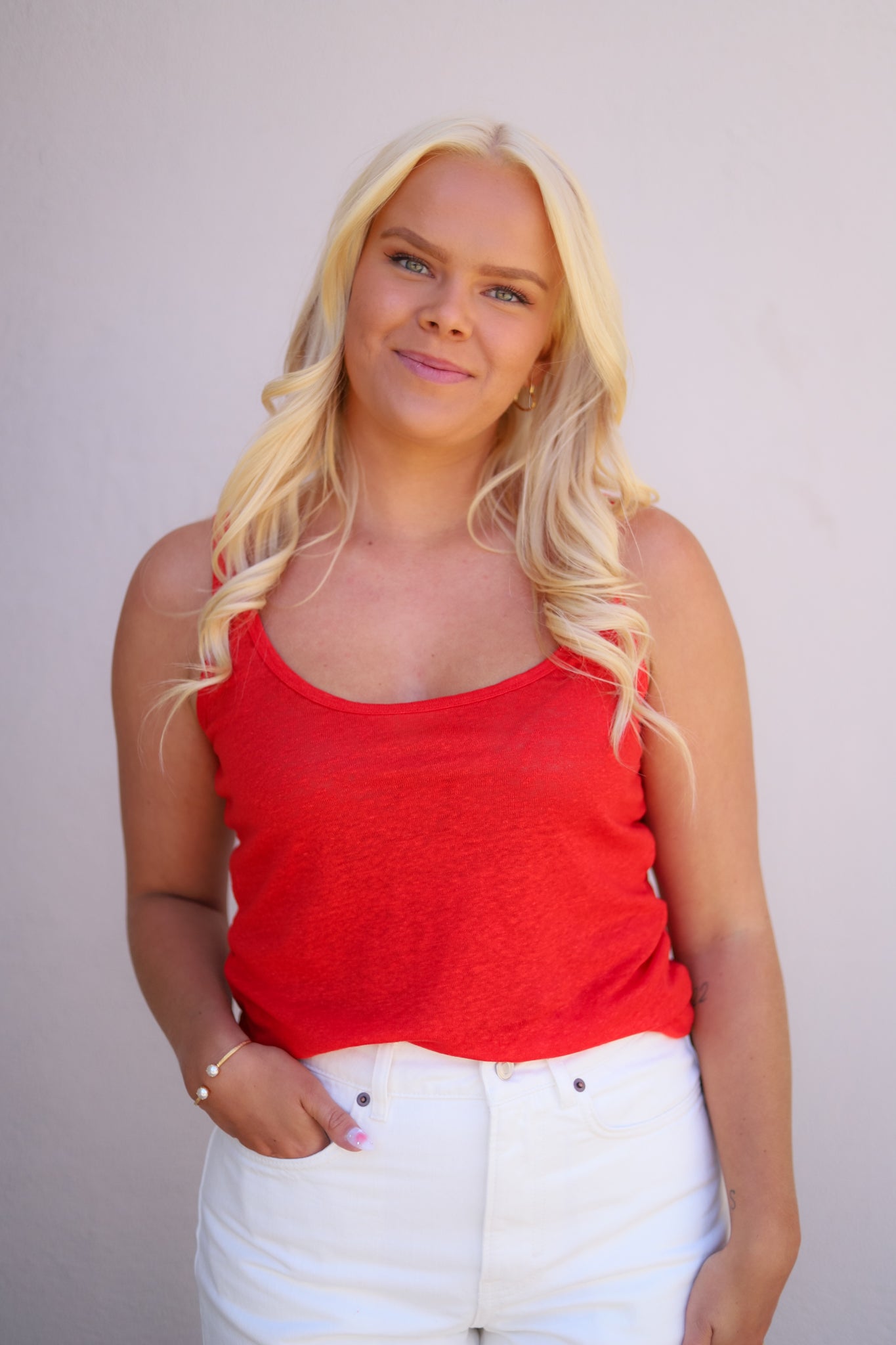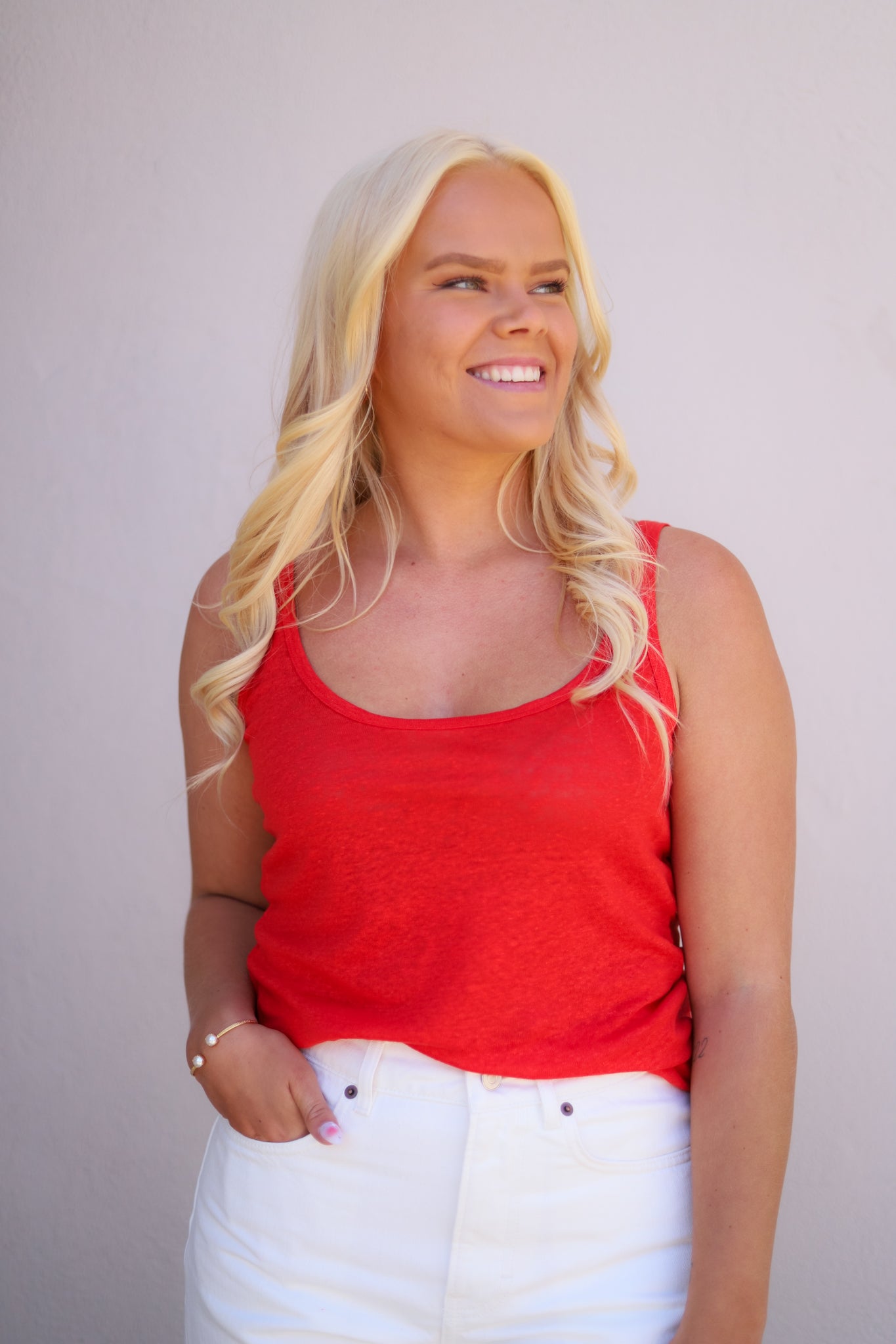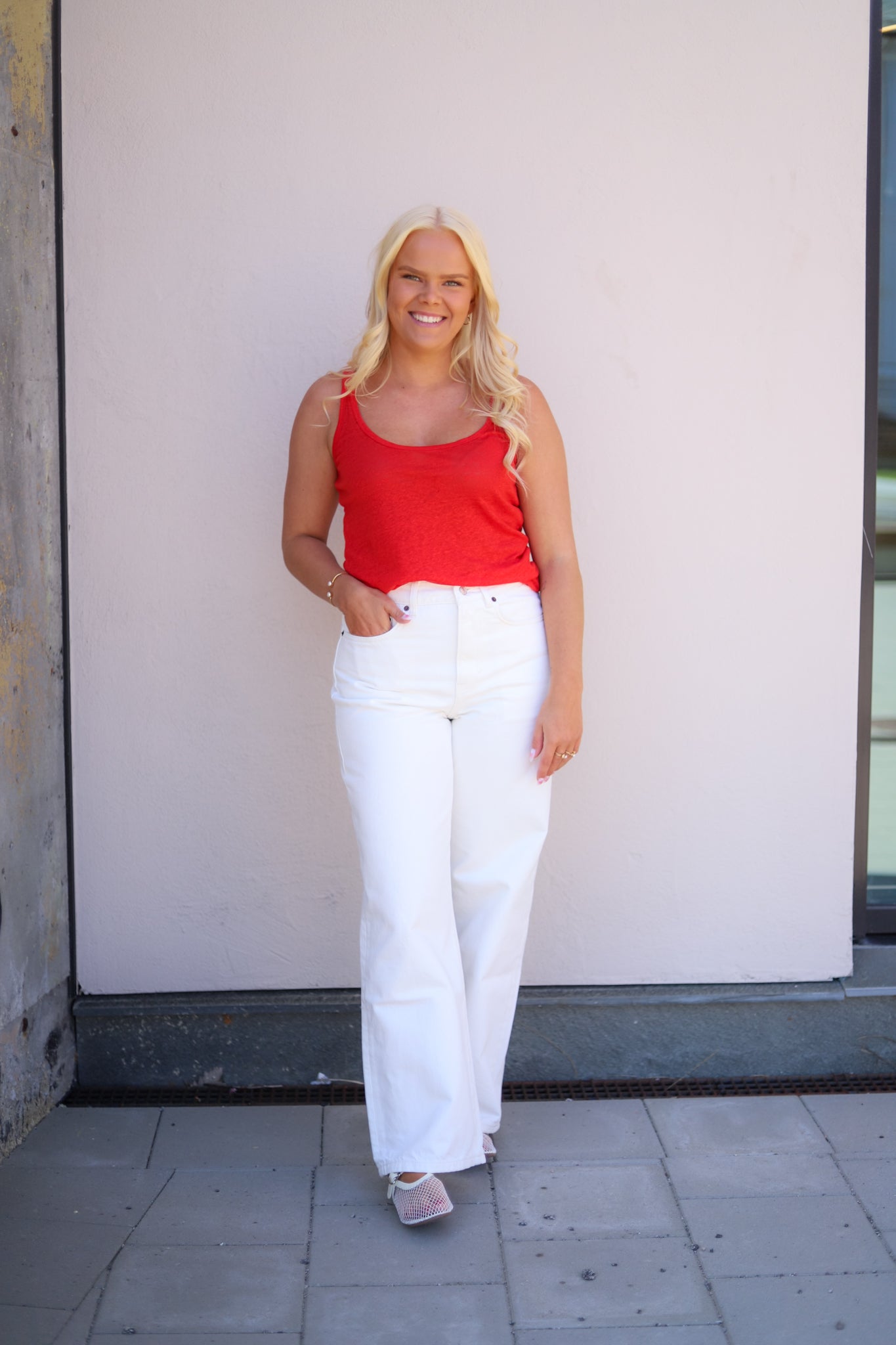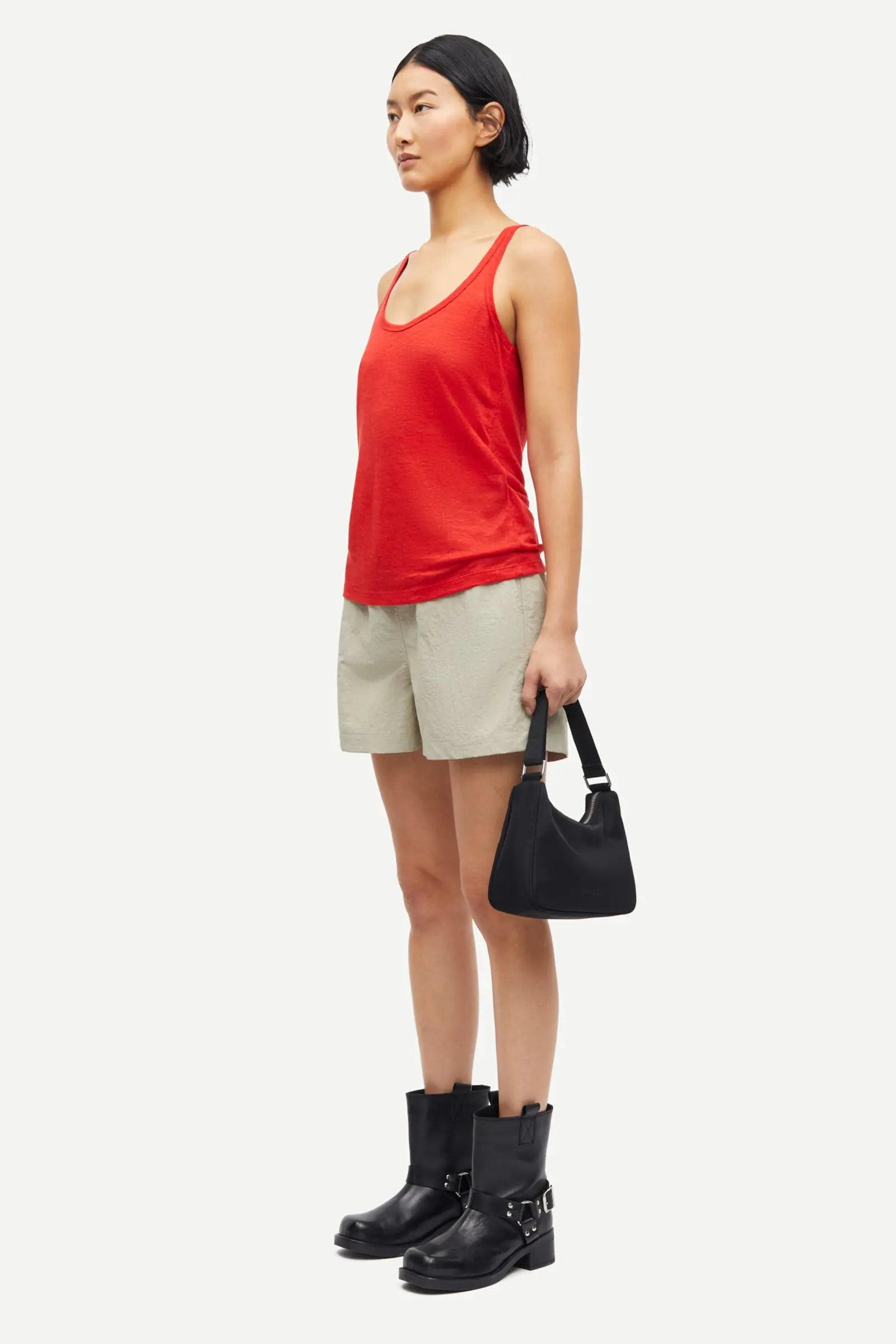 Deilig singlet myk lin fra Samsøe. Deilig lett kvalitet med fin struktur i en fresh rød farge. Regulær rett modell med hoftelengde og pen utringning.