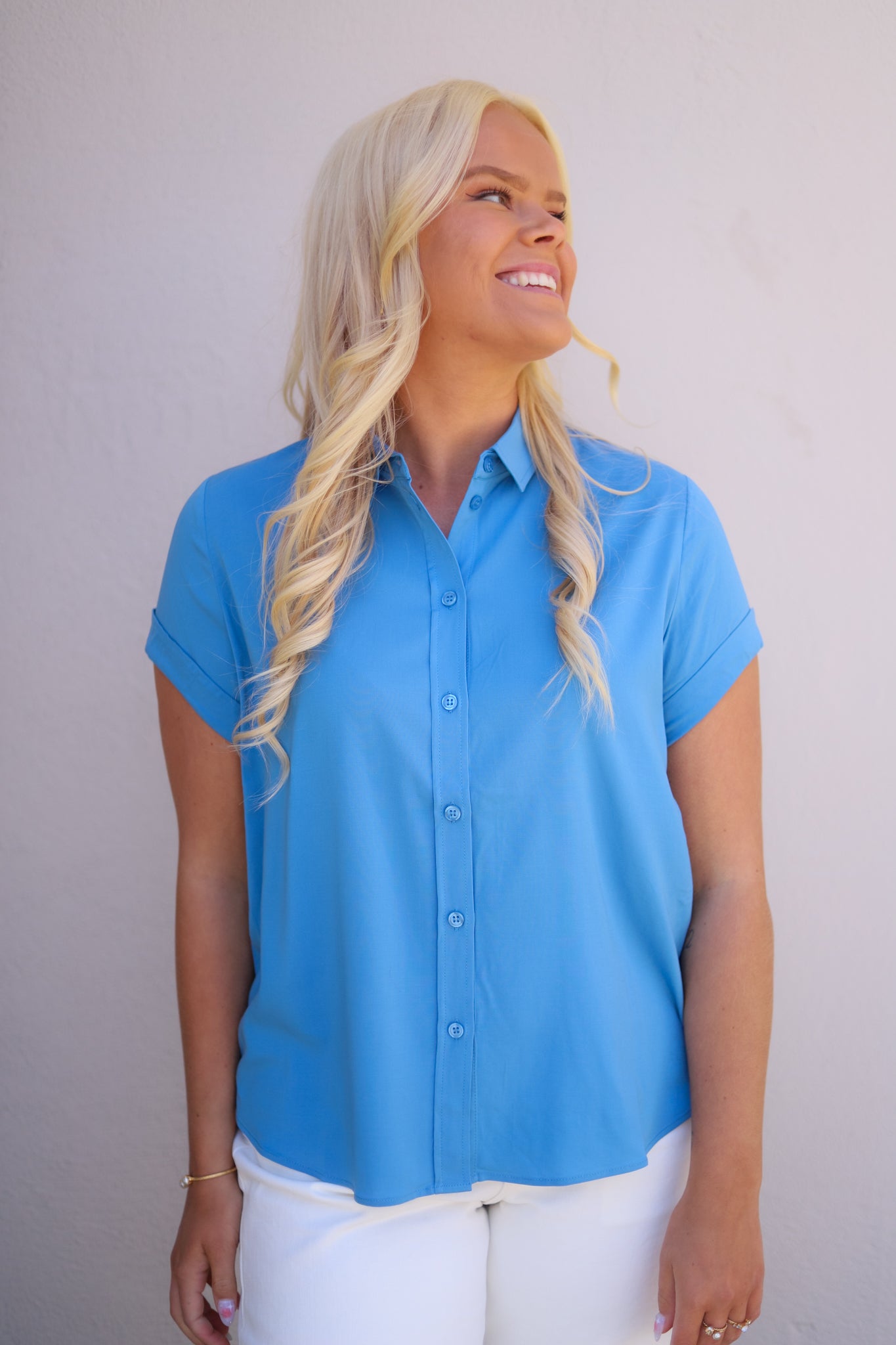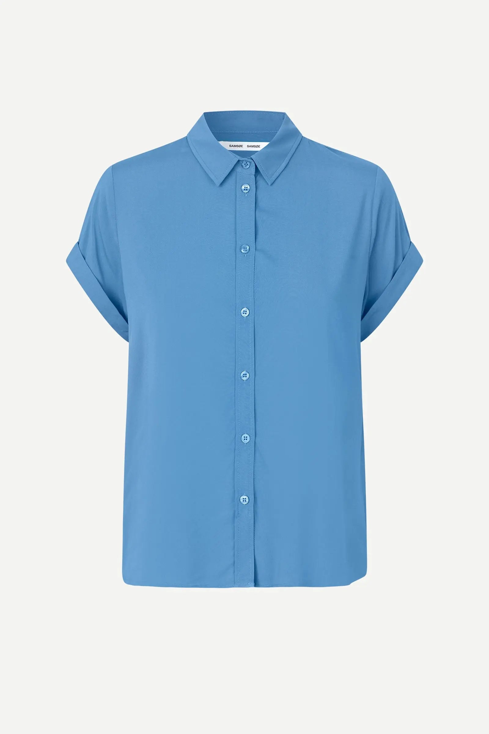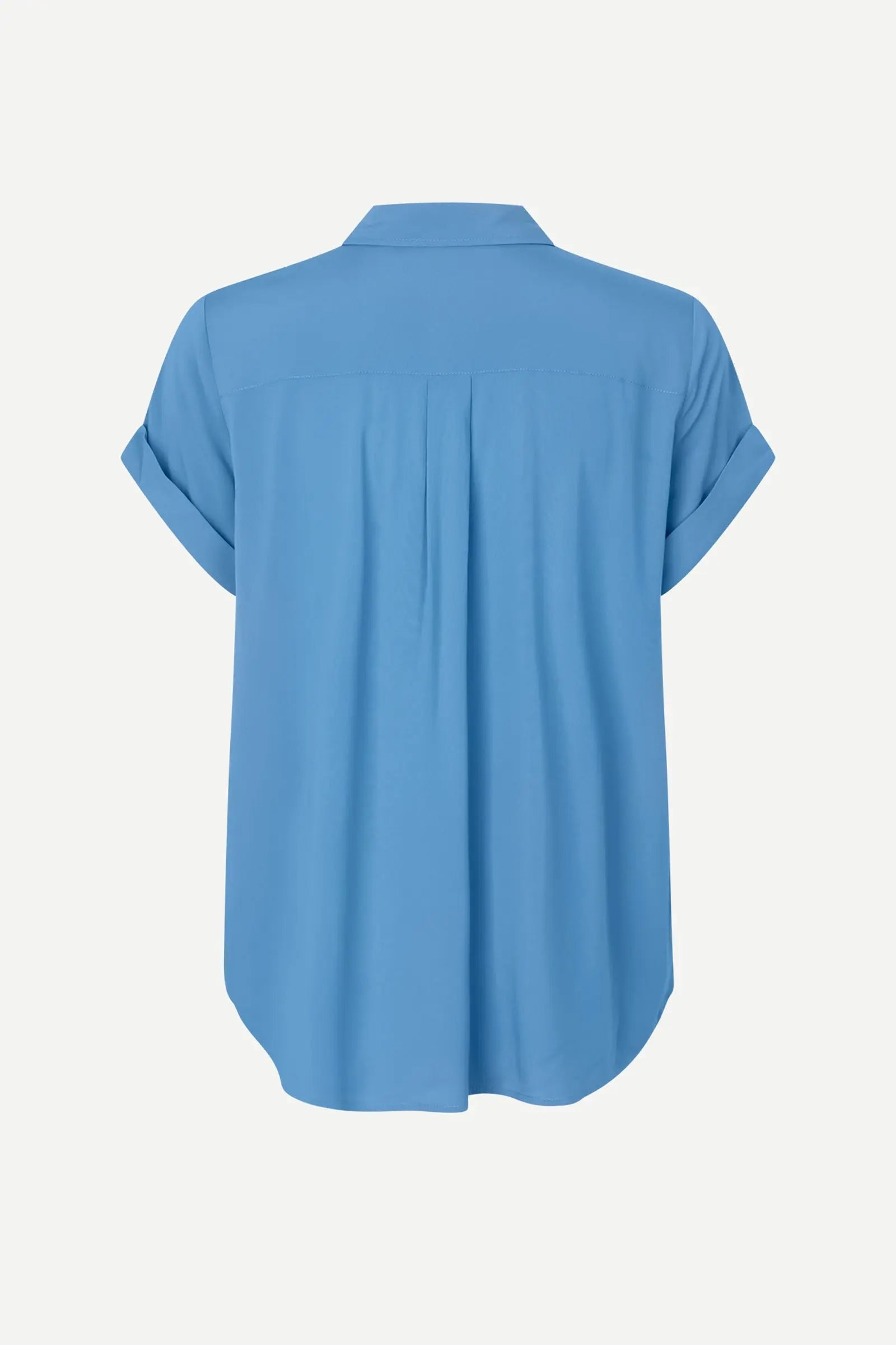 Blusefavoritten Majan fra Samsøe, her i en dyp blåtone. En anvendelig bluse i en deilig lett og stretchy kvalitet. Klassiske detaljer med liten krage og knappestolpe med synlig kneppning. Den har nette ermer med oppbrett og avrundet hem. En søt og nett bluse som er like fin til bukser og skjørt.