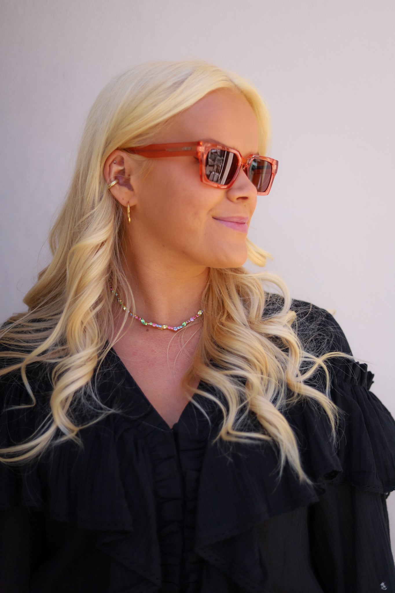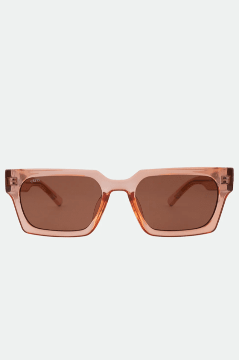 Trendy og funksjonelle solbriller fra Otra. Avlang fasong med brede stenger. Transparent rosa ramme og brunrosa linser. 100% UV-beskyttelse. Mykt vegansk etui medfølger.