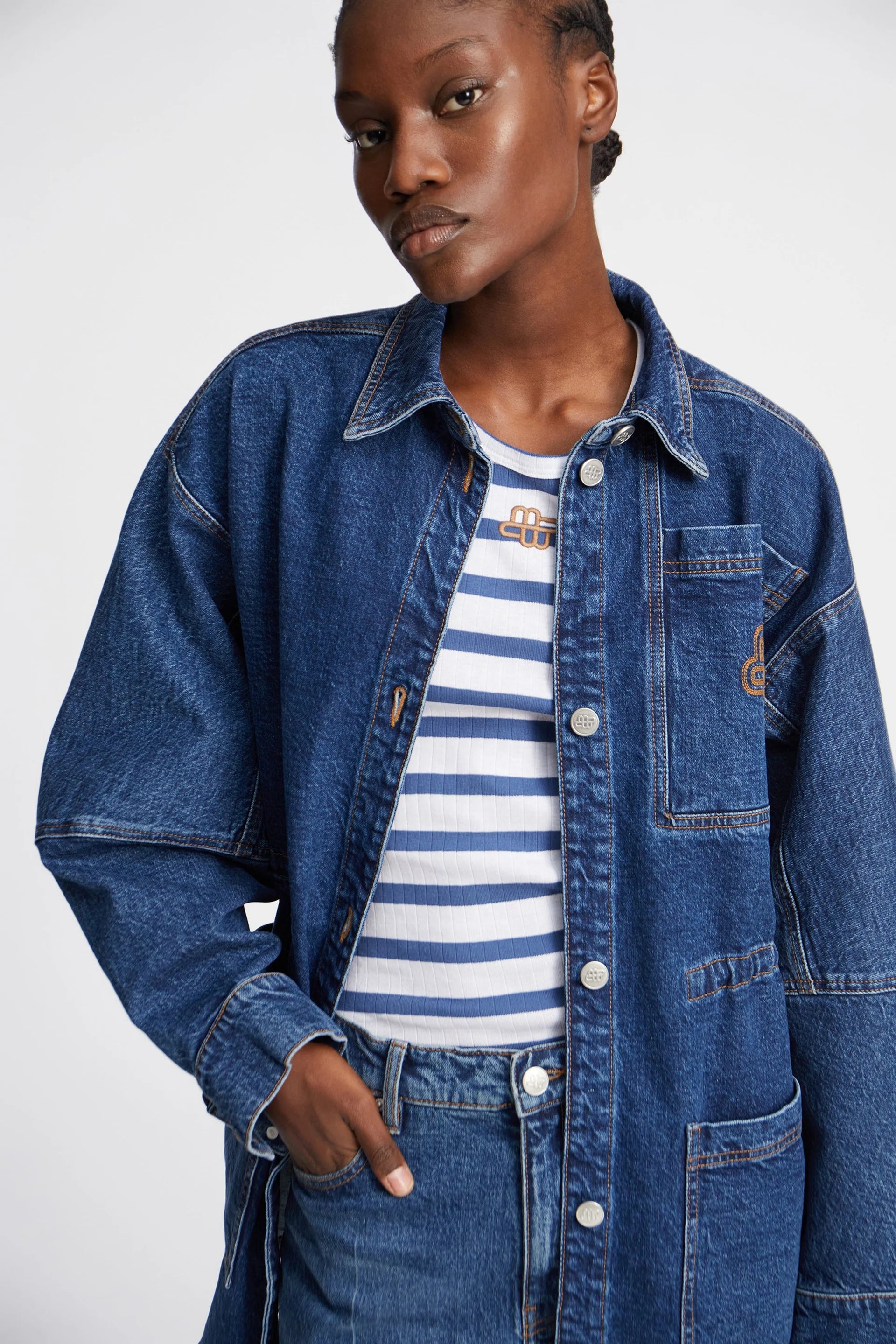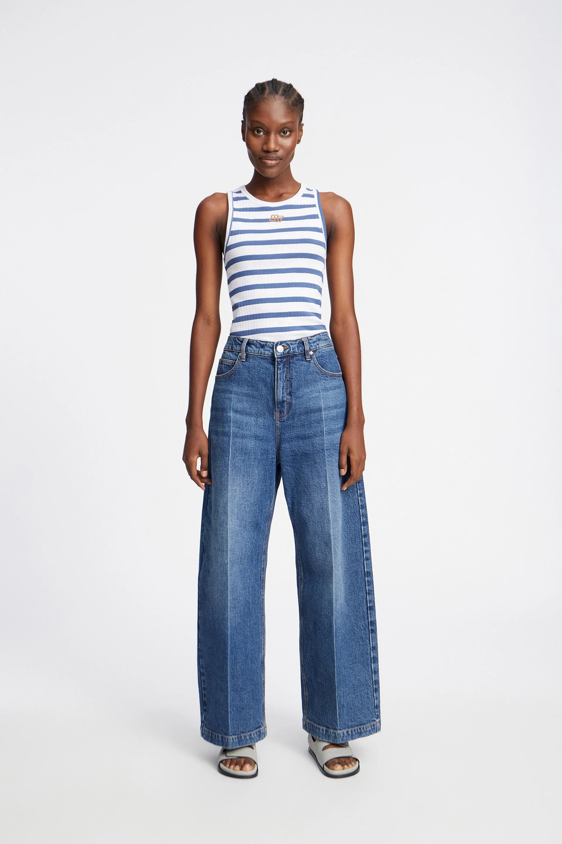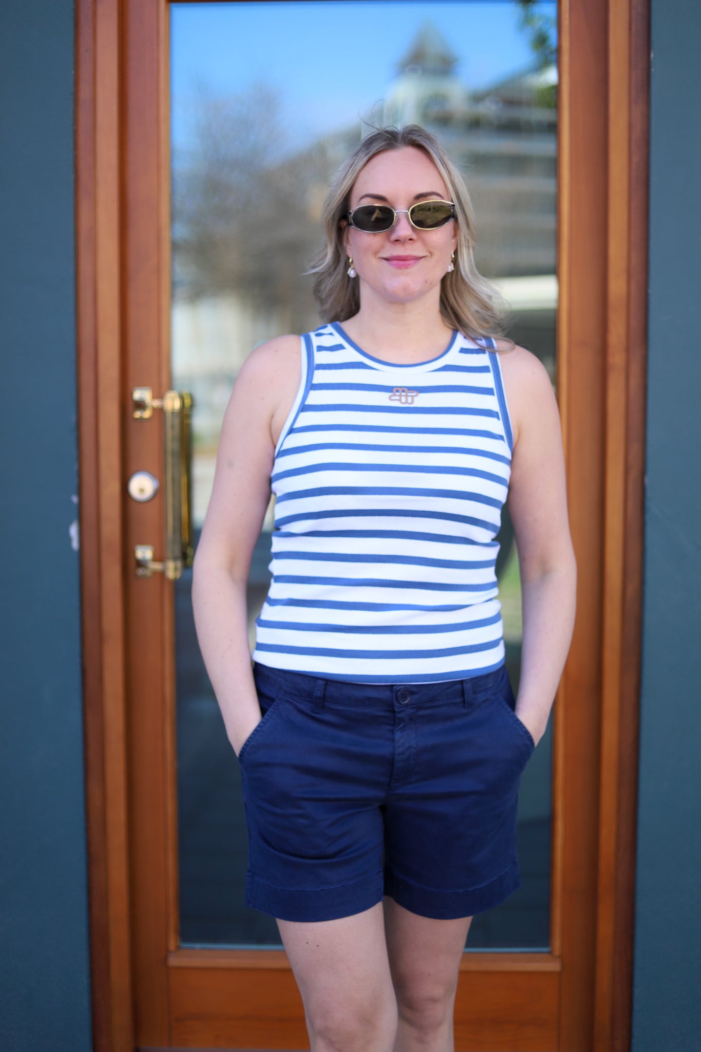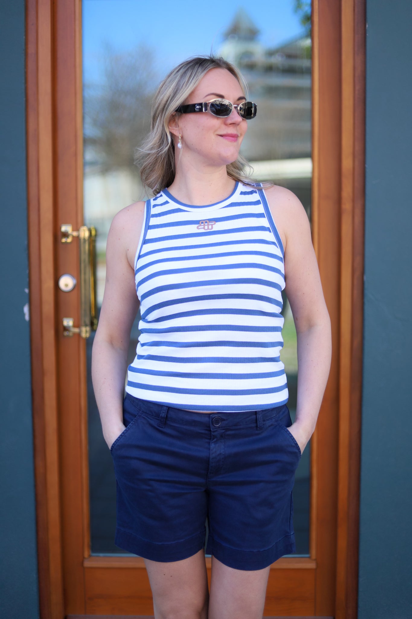 Trendy stripet tanktop i hvit og blå fra Munthe. 100 % økologisk bomull med elegant Munthe emblem brodert på brystet. Designet for en tettsittende passform med rund hals og pen hoftelengde. Perfekt til sesongens denim og lyse underdeler!