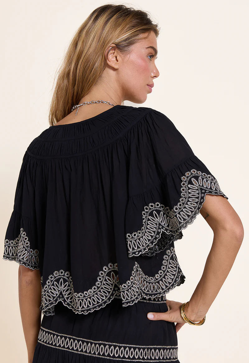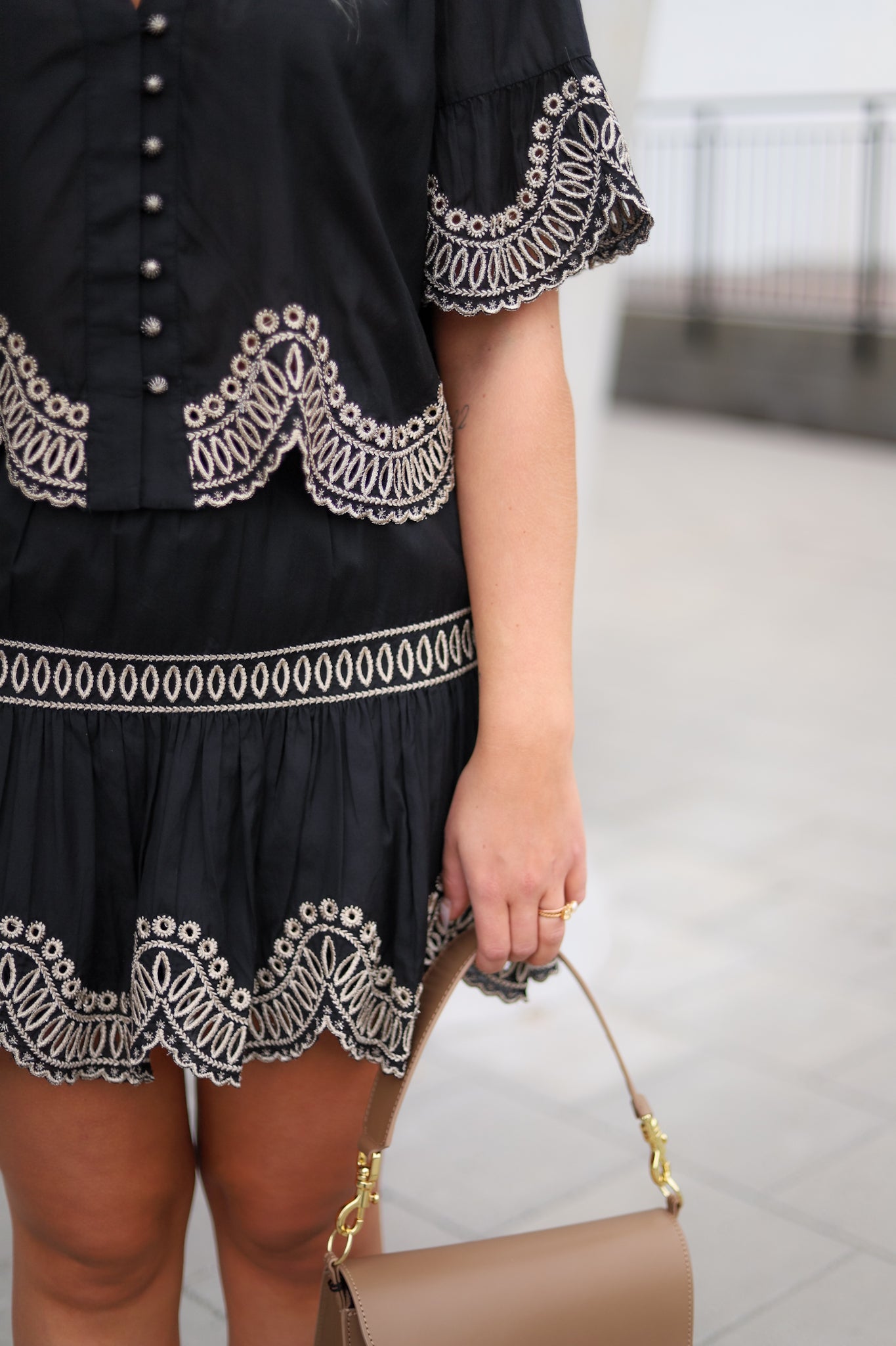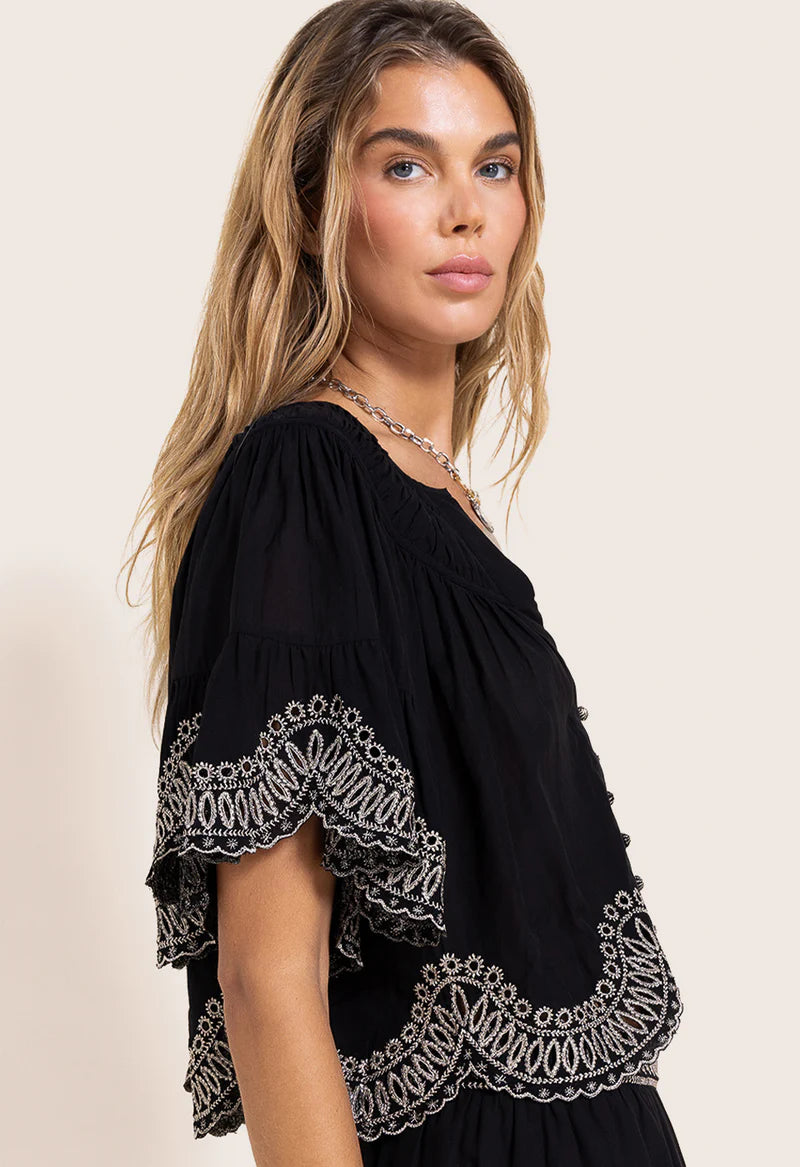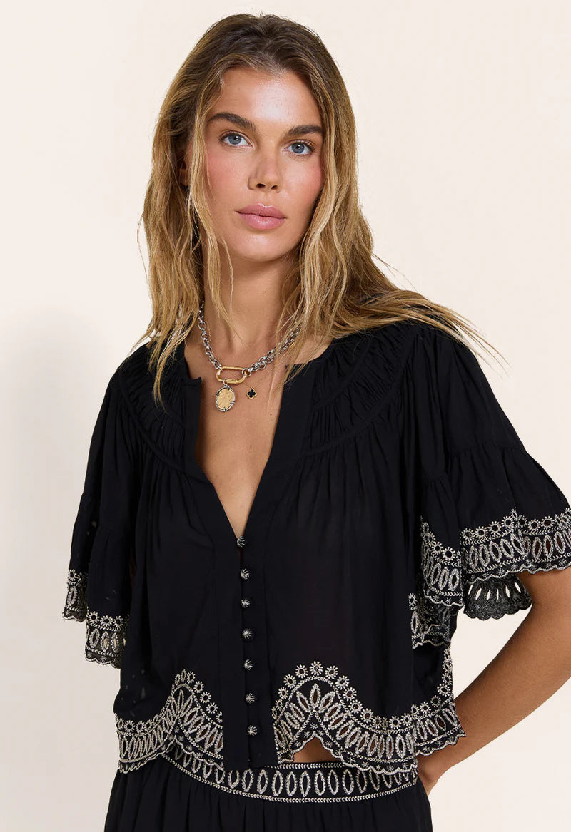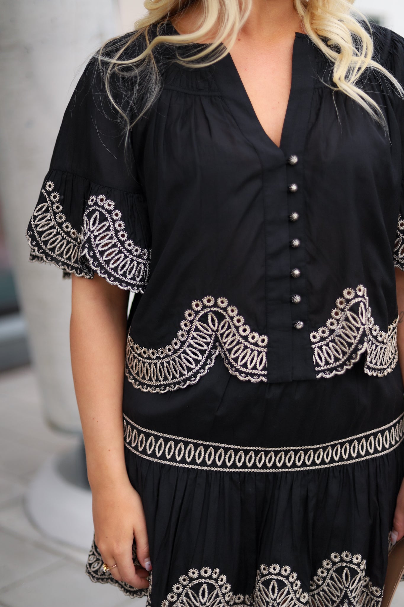 Nydelig topp i klassisk sort med gulllglitrede broderidetaljer fra Scarlett Poppies. Modellen er rett, lett croppet og har delikat bølgekant i hem. V-hals og små knapper i front. Toppen har korte vide ermer med lekkert volum. Style med matchende skjørt for komplett look.